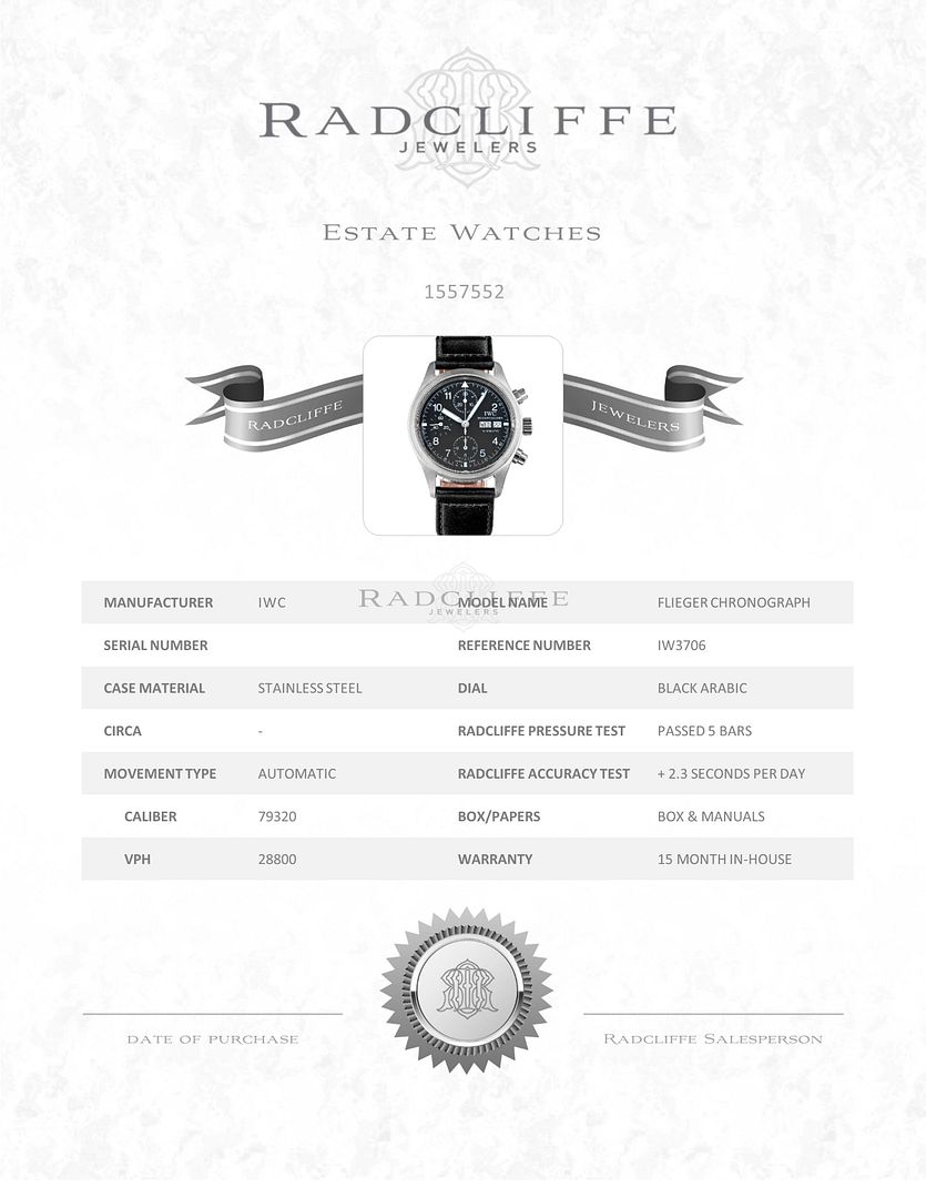 For sale is an excellent condition 39mm stainless steel IWC Flieger Chrono. The IW3706 comes with inner and outer box and manuals, but does not include original warranty card. The inner box is in surprisingly good shape, most from this era have begun to disintegrate notably. The Pilot is on a like new OEM black Santoni strap and OEM steel tang buckle. The 3706 has a matte black dial with crisply painted Arabic hour markers. Only the four points have luminescence, at 3, 6, 9, and the triangle at 12…in addition to the hands. All is functioning properly, day and date changing near midnight, chrono resetting crisply to 12. The brushed steel case is in fantastic shape, the polish highlights are sharp and free of any dings or dents.