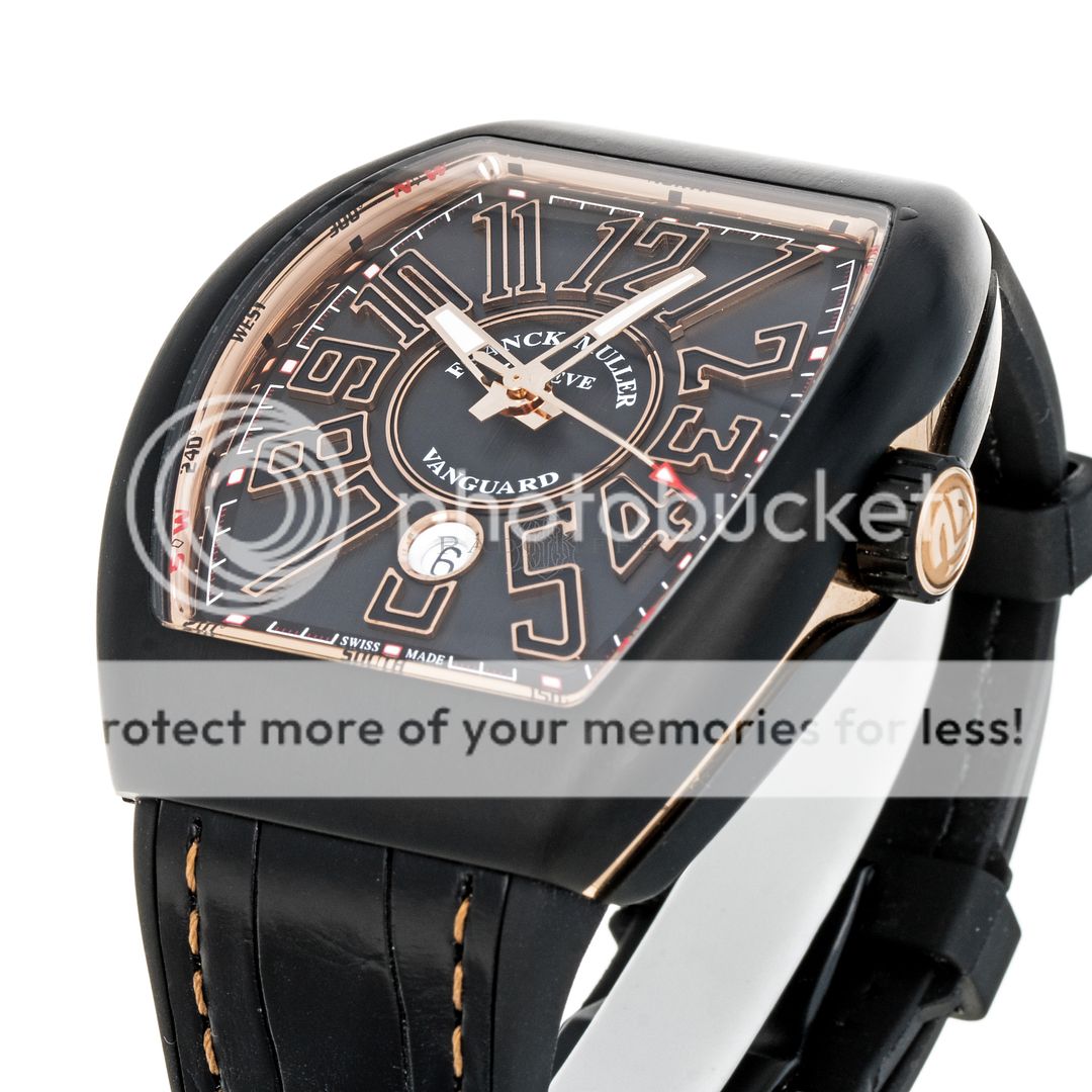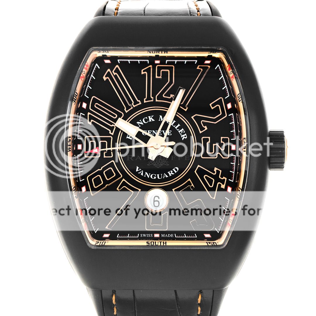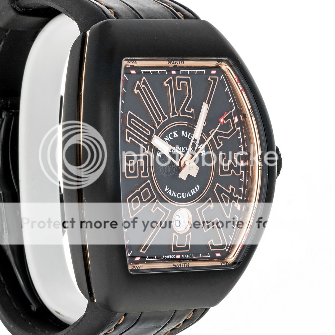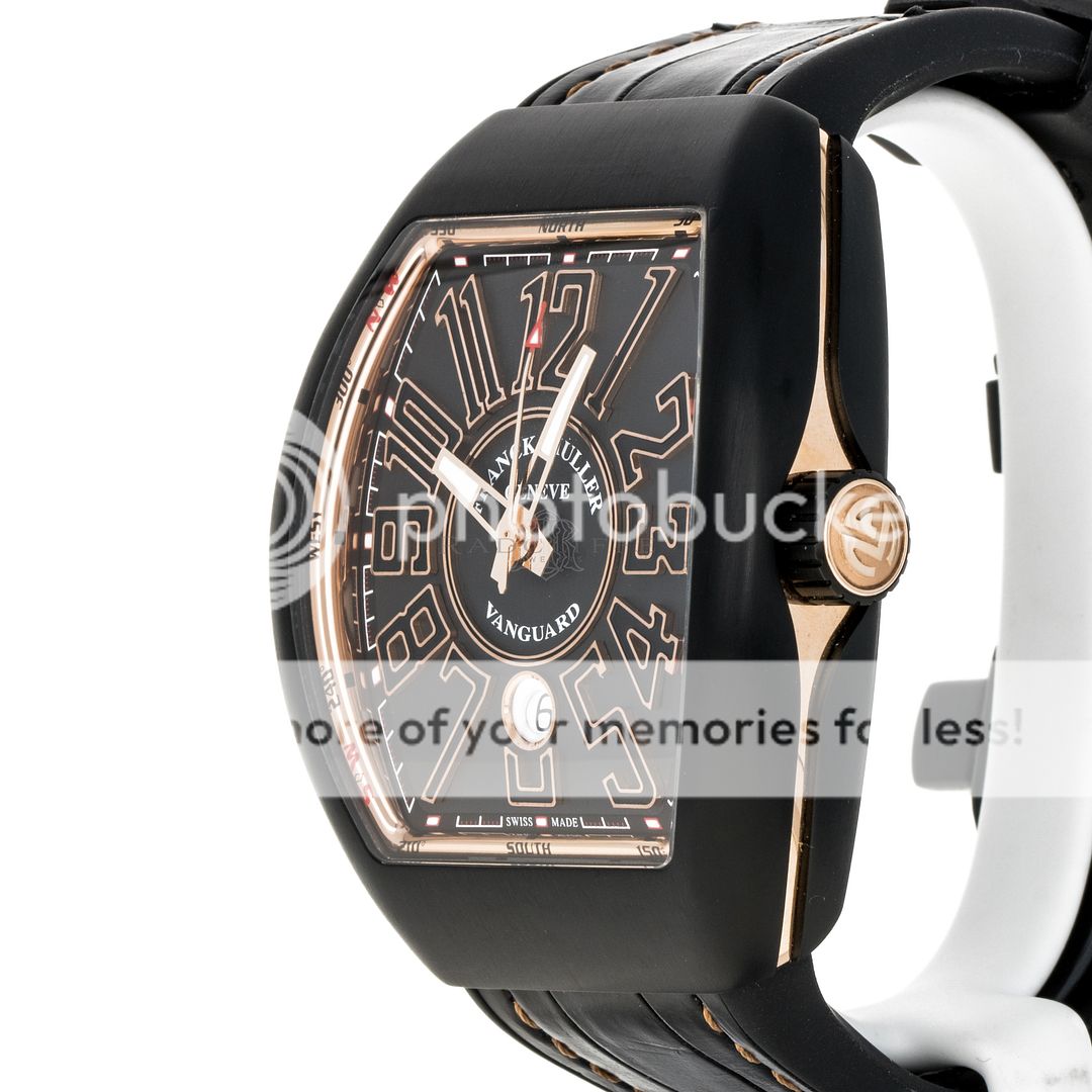 For sale is a pre-owned near mint condition 44mm by 54mm blackened titanium and 18kt rose gold Franck Muller Vanguard. This sale for the V45SCDT includes inner and outer Franck Muller boxes with operation instructions. The Vanguard’s black dial has a light vertical tapestry lines, applied rose gold tone Arabic numerals, a date aperture at six o’clock, and luminescent skeleton hands. The satin-finish blackened titanium and polished 18kt rose gold case is in excellent condition with no notable imperfections. The case is mounted on an OEM black crocodile strap with a blackened titanium double push-button deployment clasp. Powering the Vanguard is an automatic FM7000 caliber with 48 hours of power reserve.