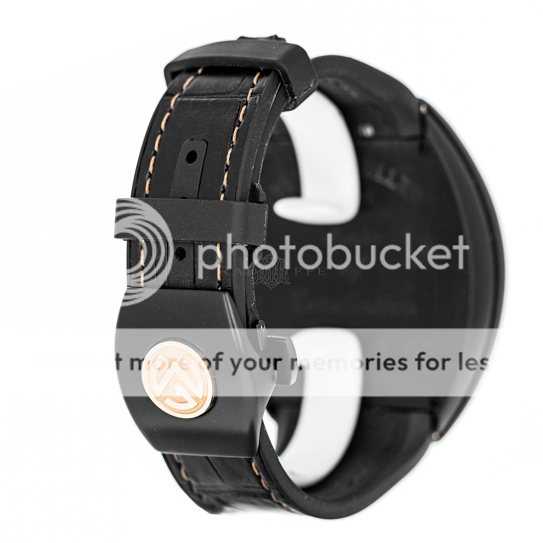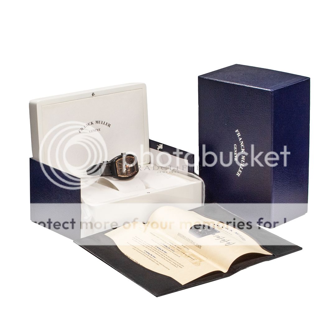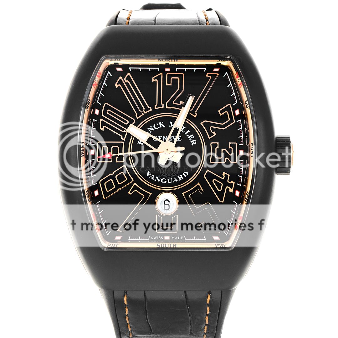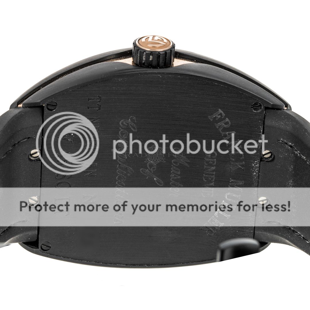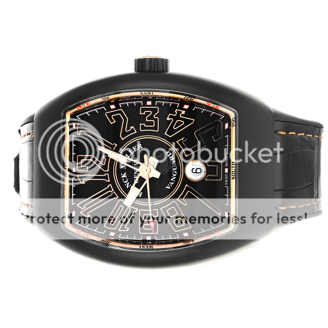 For sale is a pre-owned near mint condition 44mm by 54mm blackened titanium and 18kt rose gold Franck Muller Vanguard. This sale for the V45SCDT includes inner and outer Franck Muller boxes with operation instructions. The Vanguard’s black dial has a light vertical tapestry lines, applied rose gold tone Arabic numerals, a date aperture at six o’clock, and luminescent skeleton hands. The satin-finish blackened titanium and polished 18kt rose gold case is in excellent condition with no notable imperfections. The case is mounted on an OEM black crocodile strap with a blackened titanium double push-button deployment clasp. Powering the Vanguard is an automatic FM7000 caliber with 48 hours of power reserve.