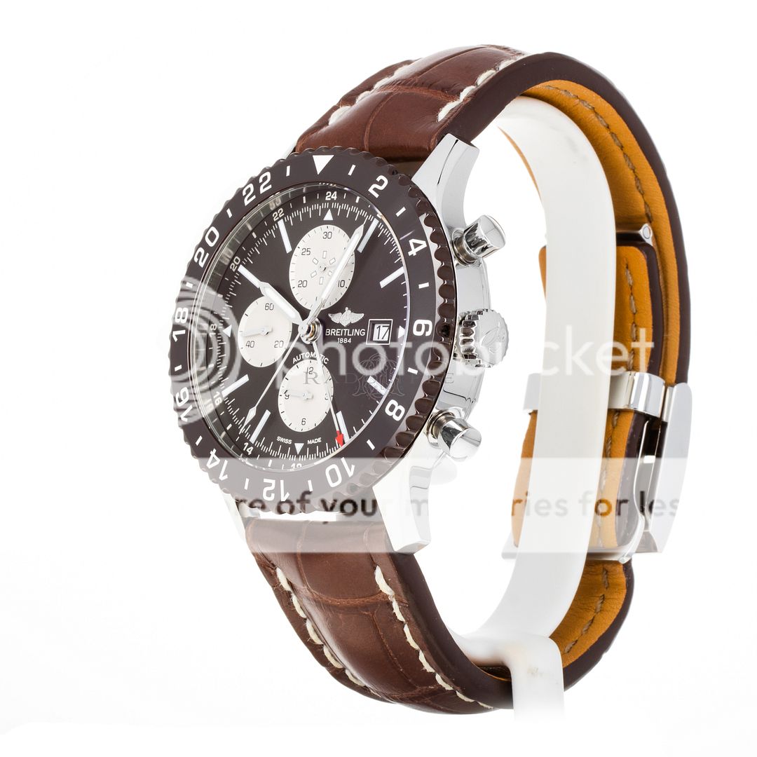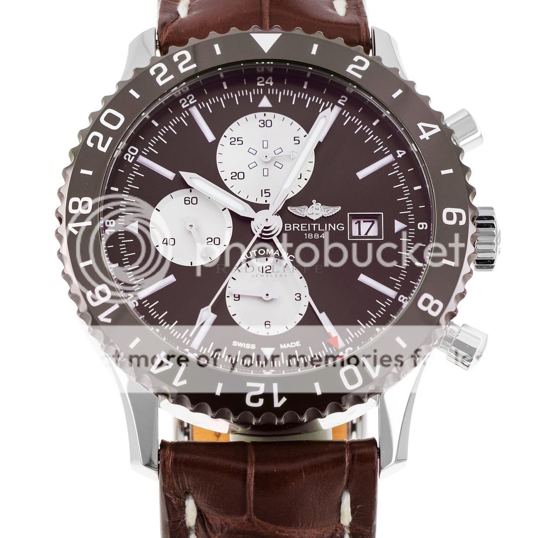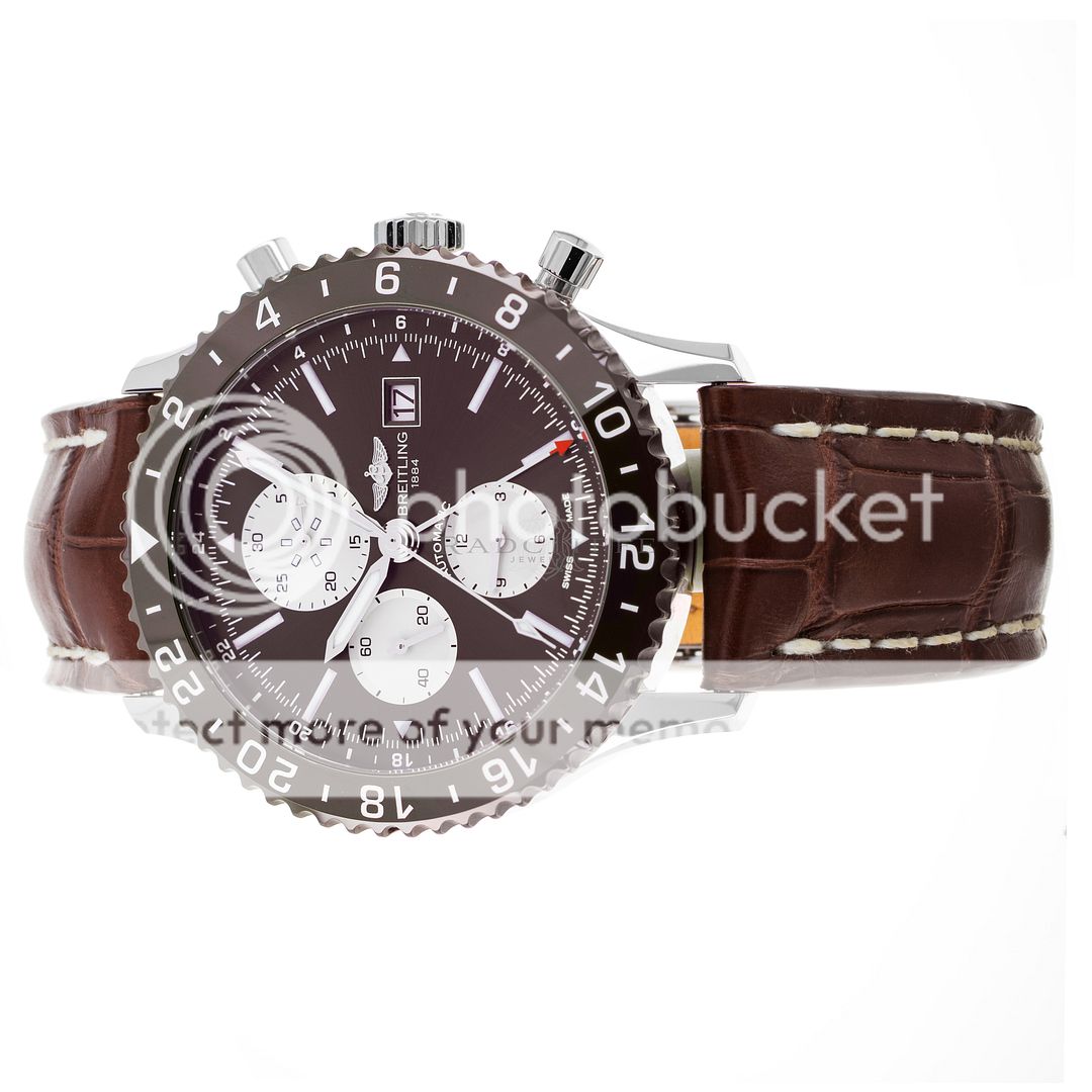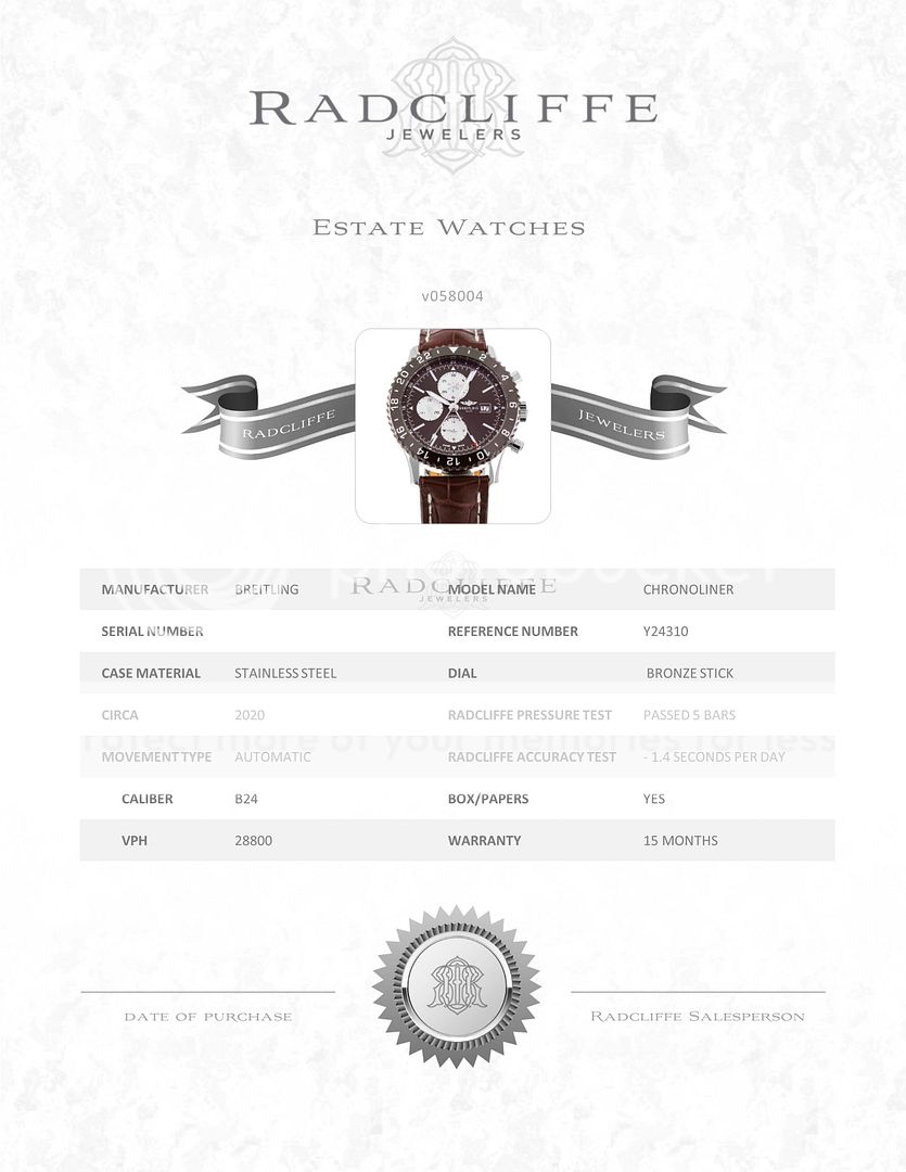 For sale is a pre-owned near mint condition 46mm stainless steel Breitling Chronoliner. The Y24310 sale is for watch with box, instruction manual, and warranty card. The Chronoliner was originally purchased in 2020. The Breitling has a bronze dial with silver recessed sub dials, stick hour markers, GMT central set hand, and date display at 3. The Chronoliner has a bidirectional brown ceramic bezel with GMT markings. The high polished steel case does not have any signs of wear, the timepiece appears to have had minimal wrist time. The OEM like new brown alligator strap with accent stitching is secured with a fold over deployment buckle. The Breitling is an automatic which is powered by the caliber B24 with a 42-hour power reserve.