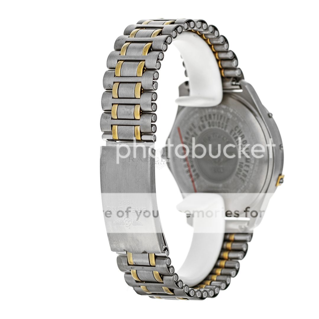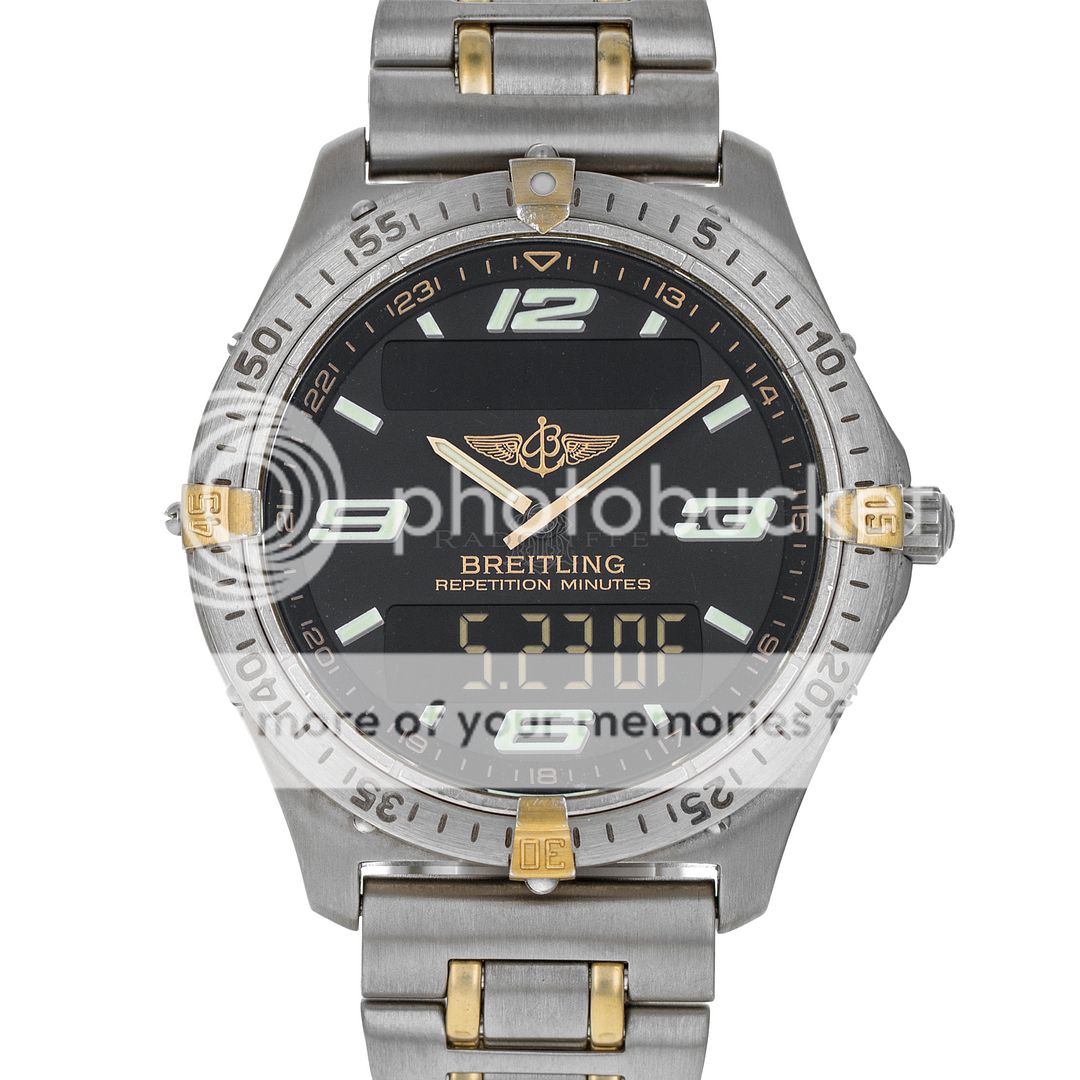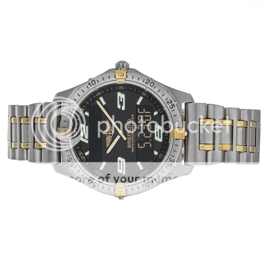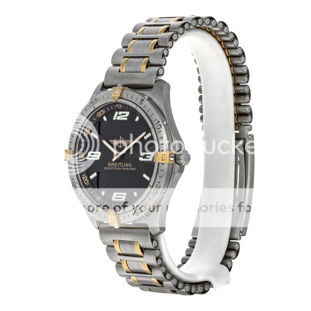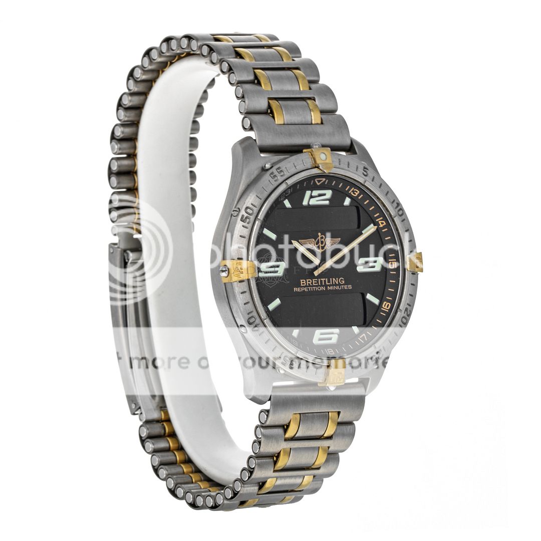 For sale is a pre-owned excellent condition 41mm titanium and 18 karat gold accent Breitling Aerospace. The F65362 sale is for watch with box and papers. Included in the package are the outer yellow cardboard box, inner black Bakelite box with broken hinge and a few missing letters (common for this era box), COSC certificate, instruction manual, and warranty booklet dated from 2003. The Aerospace has a multi-function quartz movement which includes the minute repeater function. The watch has a black dial with gold tone hands, two LED display apertures, and a bidirectional titanium bezel with gold riders. The Breitling has been refinished and received a new battery, looks great and will run spot on for years to come. The bracelet has the spring loaded fold over clasp which adjusts to variances in your wrist circumference. The spring in the clasp is a bit loose, commiserate with its age. It is currently set for a 7.35-inch wrist without any flex, fully stretched clasp fits about a 7.75-inch wrist.