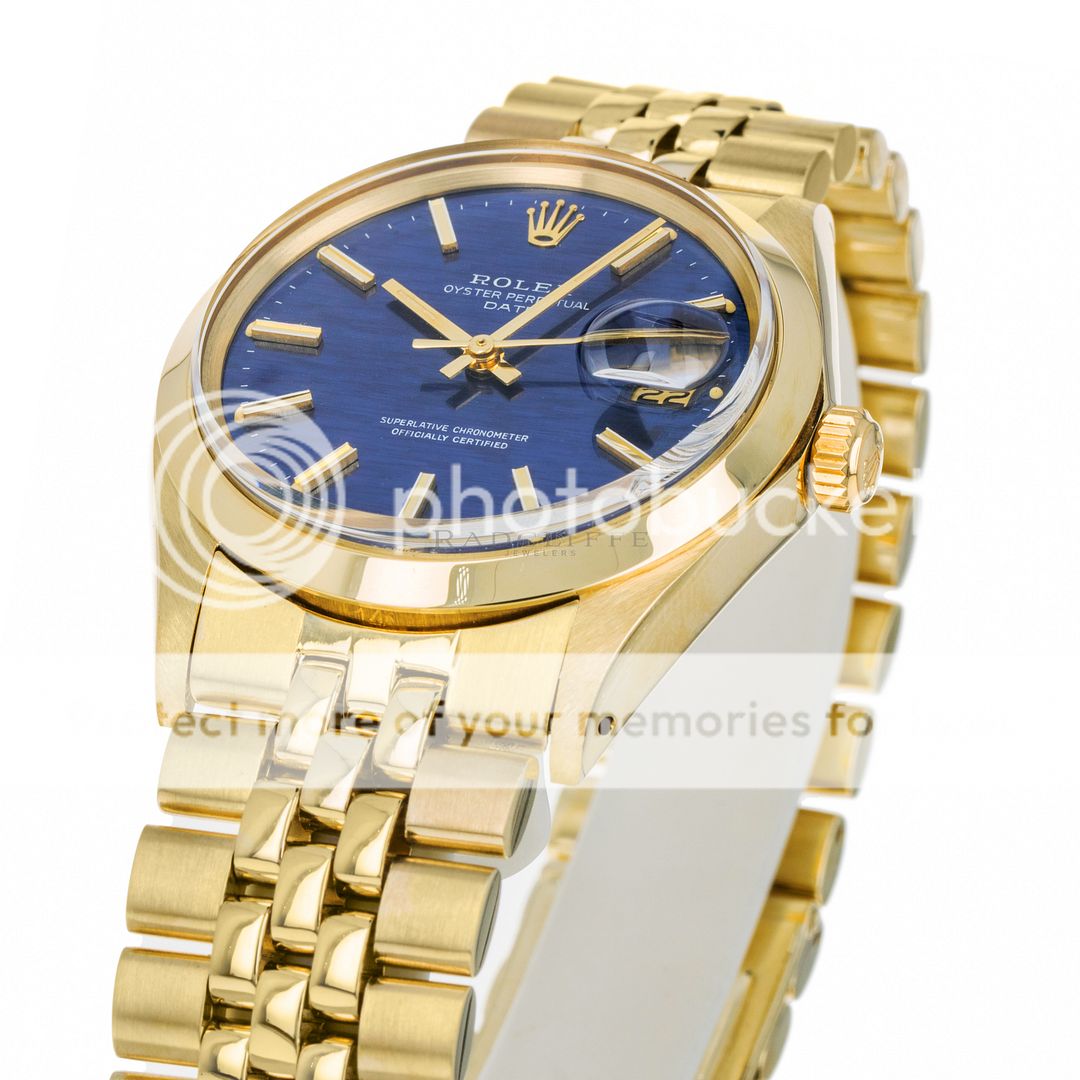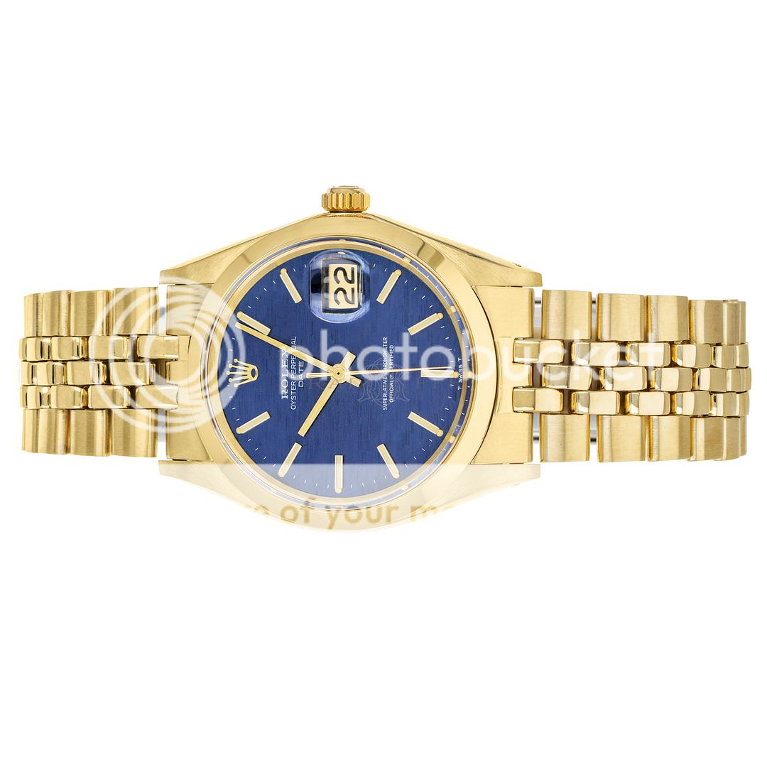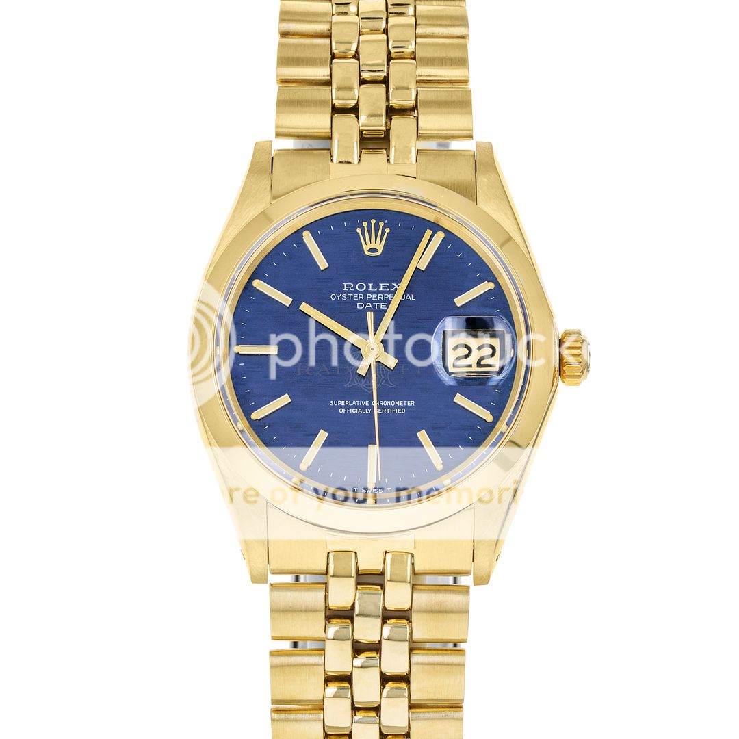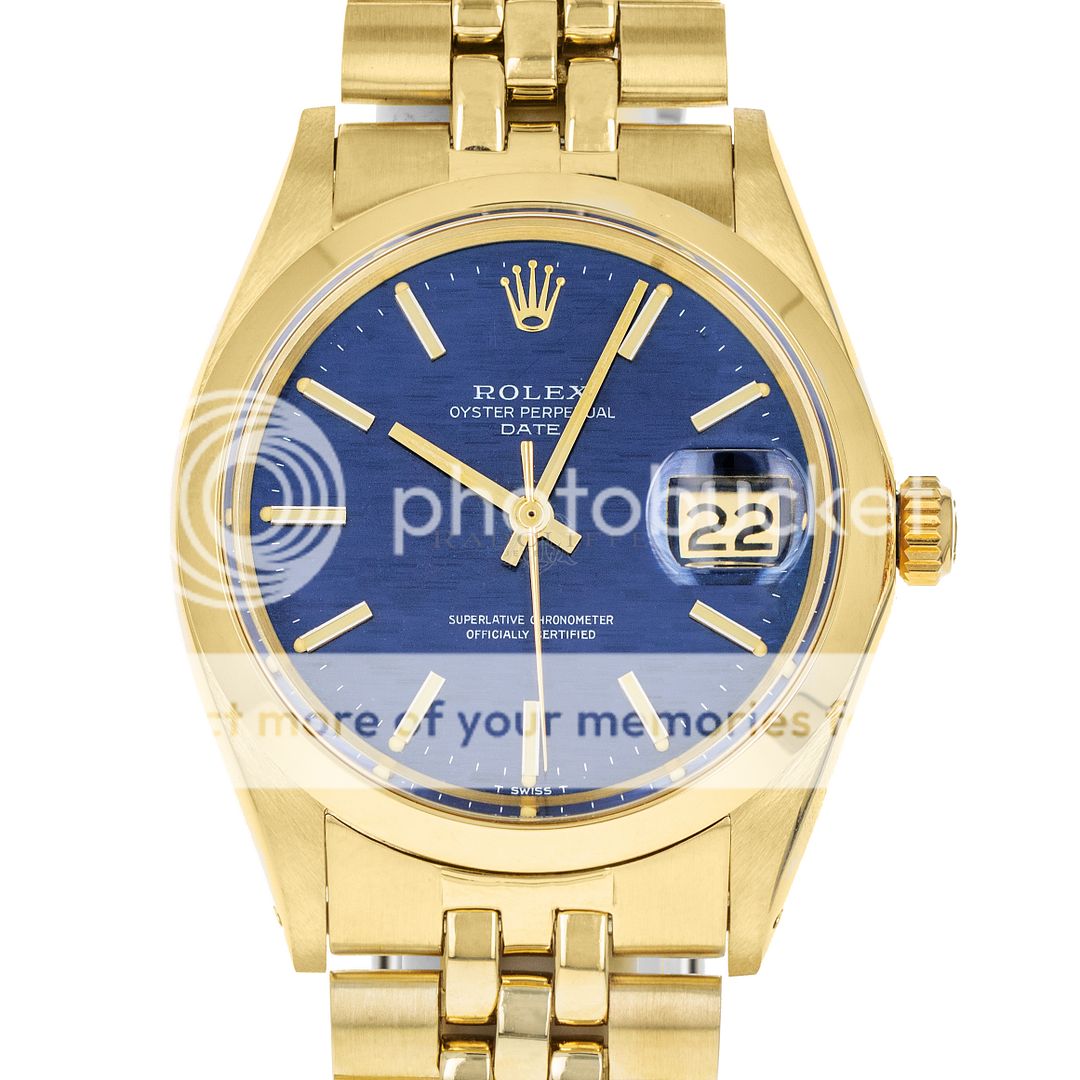 For sale is a pre-owned excellent condition 34mm 14 karat yellow gold Rolex Date. The 1500 will come with Rolex inner and outer boxes and the original punched serial warranty paper. The Date is a 2.2 million serial, dating the Rolex to 1970. The Date has an amazing blue mosaic tritium dial with applied baton hour markers, polished yellow gold hands with matching tritium, a central sweeping second hand and date aperture at 3. The tritium dial and hands are original to the watch , the dial must be seen live to be truly appreciated. The Date has a fixed domed bezel set on the recently refinished case with strong symmetry, balanced lugs, and crisp crown. The 14kt yellow gold USA Jubilee style bracelet does have some notable stretch. The links are in good shape for its age but would rate the stretch at 60% condition. The clasp is in good shape, commiserate with its age, with a strong coronet in place. The Date is an automatic powered by the caliber 1570 which is running within COSC specifications.