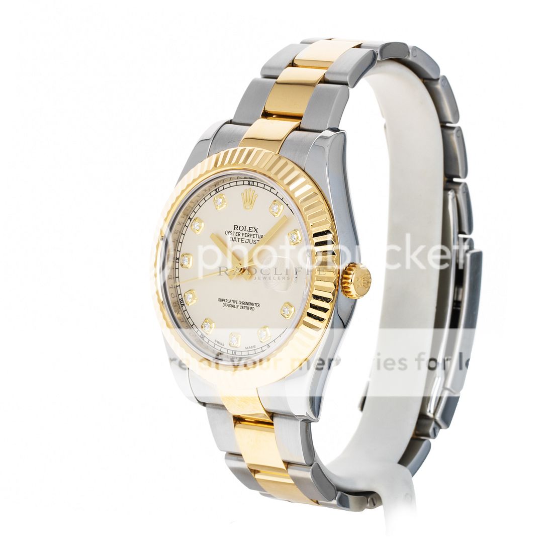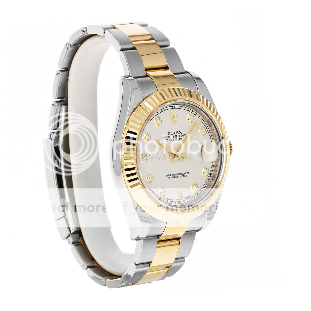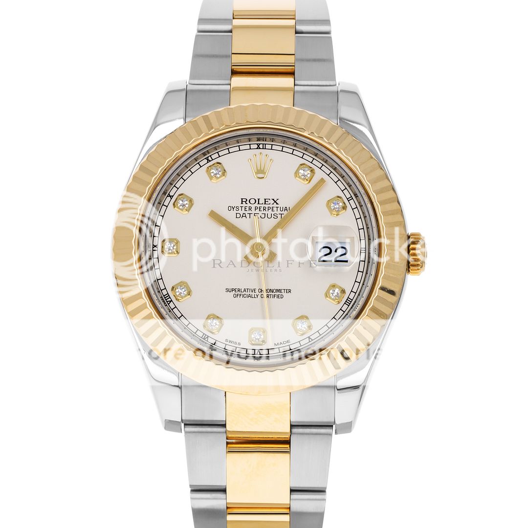 For sale is a pre-owned near mint condition 41mm stainless steel and 18 karat yellow gold Rolex Datejust II. The random serial 116333 comes with an inner box, manual, booklet, serialized hang tag, factory service record, international service guarantee card, and a warranty card dated 2012. While at Rolex service in April of 2023, the watch received a complete overhaul of the movement, a new crystal, and was refinished. The Datejust features an ivory dial with factory-set diamond hour markers, a date aperture at three o’clock, and an 18-karat yellow gold fixed fluted bezel. The previously polished case is free of any noteworthy imperfections and is mounted on a stainless steel and 18 karat yellow gold Oyster bracelet. The bracelet is in 95% or better condition with no noticeable stretch nor any signs of significant wear. As configured, the watch will accommodate a 7.65-inch wrist. The Oyster bracelet has six removable links. The 116333 is powered by an in-house automatic Rolex caliber 3136 with an approximate power reserve 48-hours.