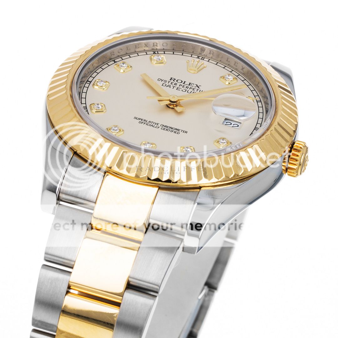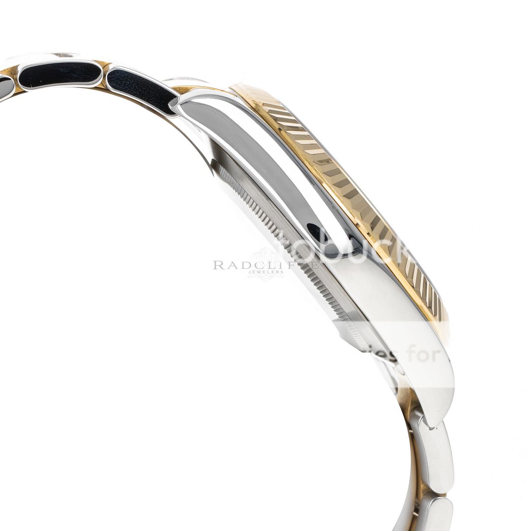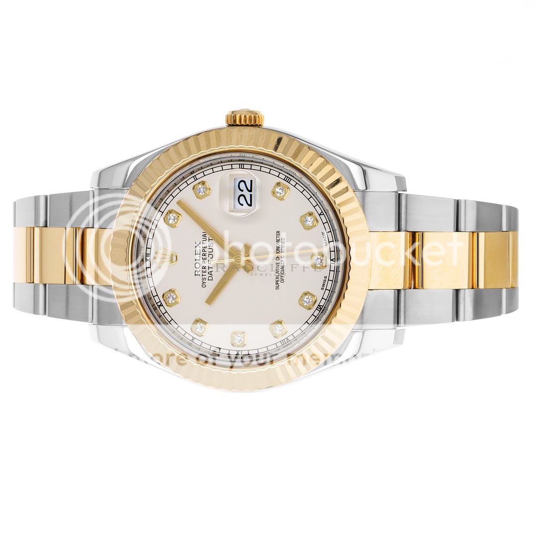 For sale is a pre-owned near mint condition 41mm stainless steel and 18 karat yellow gold Rolex Datejust II. The random serial 116333 comes with an inner box, manual, booklet, serialized hang tag, factory service record, international service guarantee card, and a warranty card dated 2012. While at Rolex service in April of 2023, the watch received a complete overhaul of the movement, a new crystal, and was refinished. The Datejust features an ivory dial with factory-set diamond hour markers, a date aperture at three o’clock, and an 18-karat yellow gold fixed fluted bezel. The previously polished case is free of any noteworthy imperfections and is mounted on a stainless steel and 18 karat yellow gold Oyster bracelet. The bracelet is in 95% or better condition with no noticeable stretch nor any signs of significant wear. As configured, the watch will accommodate a 7.65-inch wrist. The Oyster bracelet has six removable links. The 116333 is powered by an in-house automatic Rolex caliber 3136 with an approximate power reserve 48-hours.