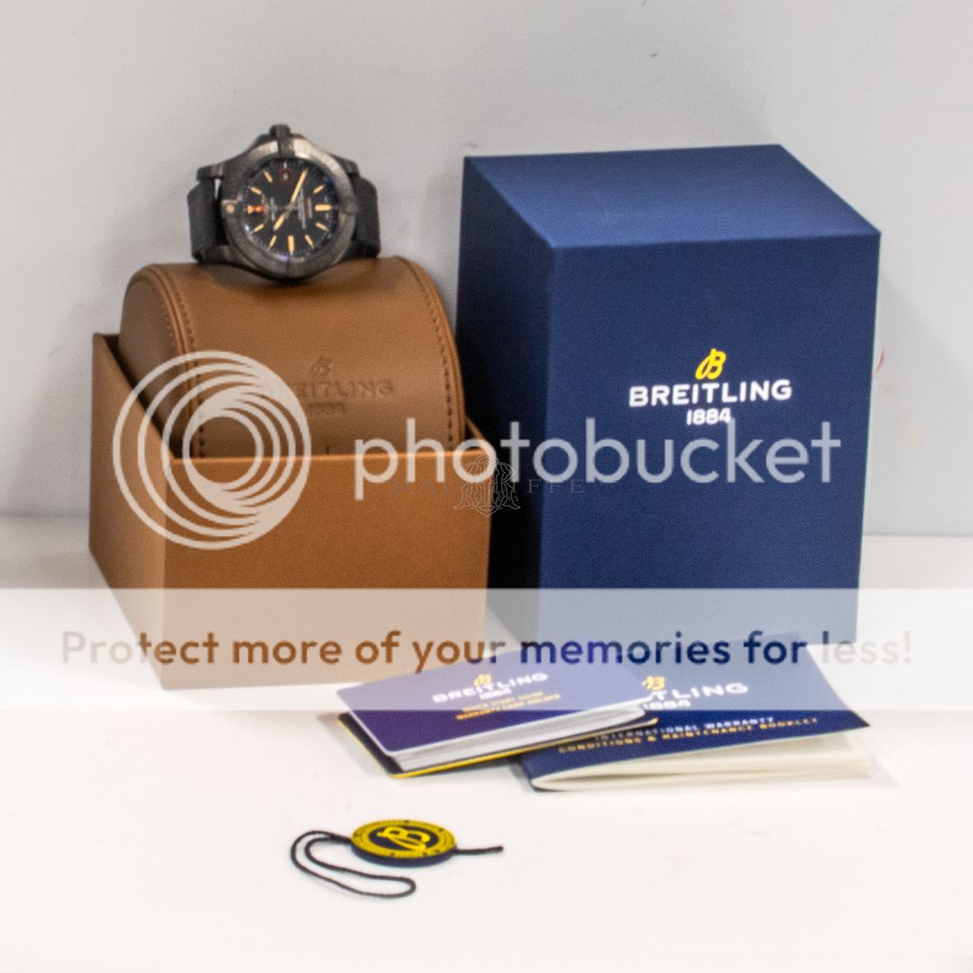 For sale is a pre-owned near mint condition 44mm DLC-coated black titanium Breitling Avenger Blackbird. The V17311 is for the watch with factory service records only. It does not include any box or papers. While at Breitling in April of 2023, the Avenger received a complete overhaul, new bezel, new crystal, and replacement hands. The Blackbird features a volcano black dial with stick hands and markers that have luminescence applied as well as a sweeping red accented second hand. The case is affixed with a unidirectional numbered bezel and a date aperture at three o’clock as well as a screw down crown that features two gaskets. The case is free of any noteworthy imperfections and is mounted on an OEM anthracite polyamide fabric strap with a tang buckle. The strap is in near mint condition. This watch fits comfortably on a 7-inch wrist with room to tighten or loosen. Powering the V17311 is an automatic caliber Breitling 17 movement which is self-winding and has approximately 38 hours of power reserve.