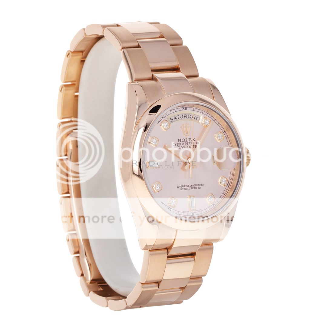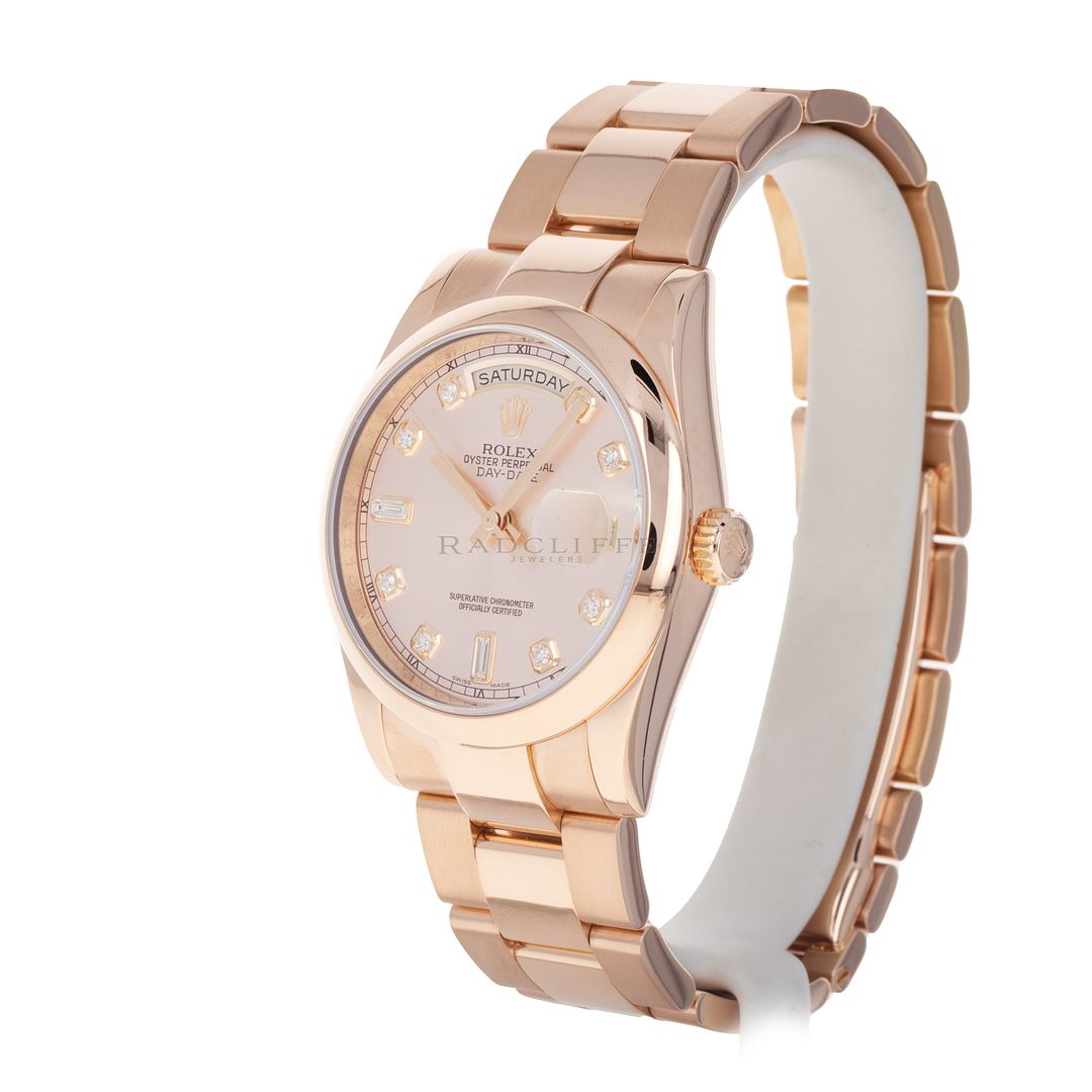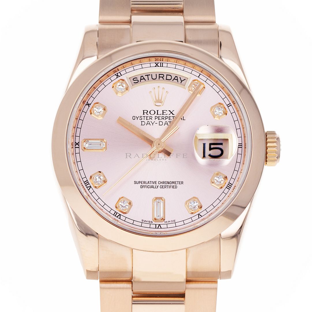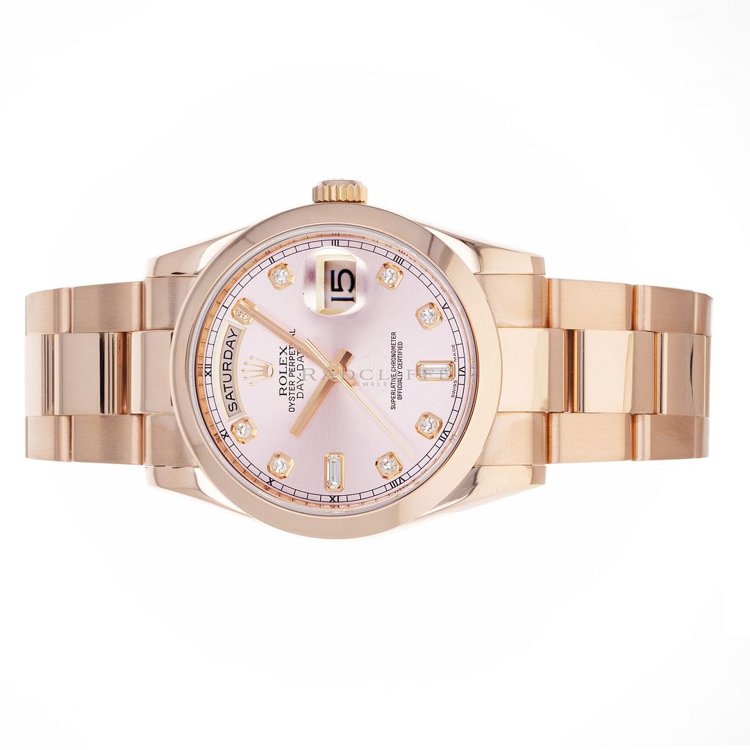 For sale is a pre-owned near mint condition 36mm 18-karat rose gold Rolex Day-Date. The G-serial 118205, circa 2010, will come with a box and a copy of factory service records. While visiting Rolex in April of 2023, the Day-Date received a complete service, a link, date disc, and was refinished. The Day-Date features a rose-colored soleil dial with factory set diamond indices, and a day/date complication. The previously polished case remains free of any noteworthy imperfections and is mounted with an 18 karat rose gold smooth bezel. The Day-Date is secured to the wrist with an 18-karat rose gold Oyster bracelet. The bracelet remains free of stretch and has no visible imperfections. As configured, the watch will accommodate a 7.1-inch wrist with five full size removeable links. Powering the 118205 is an automatic in-house Rolex caliber 3155 with an approximate power reserve of 48-hours.