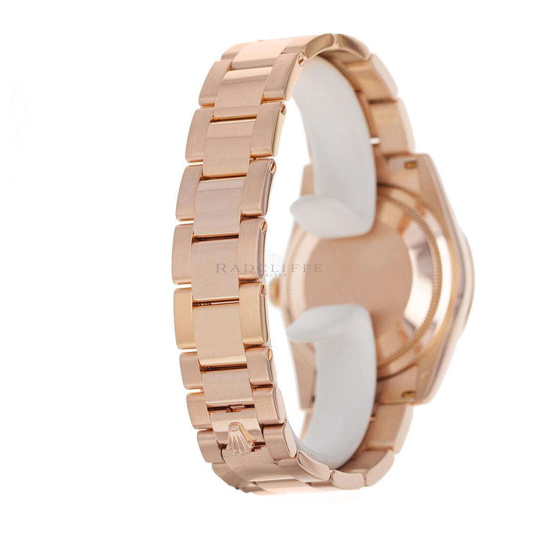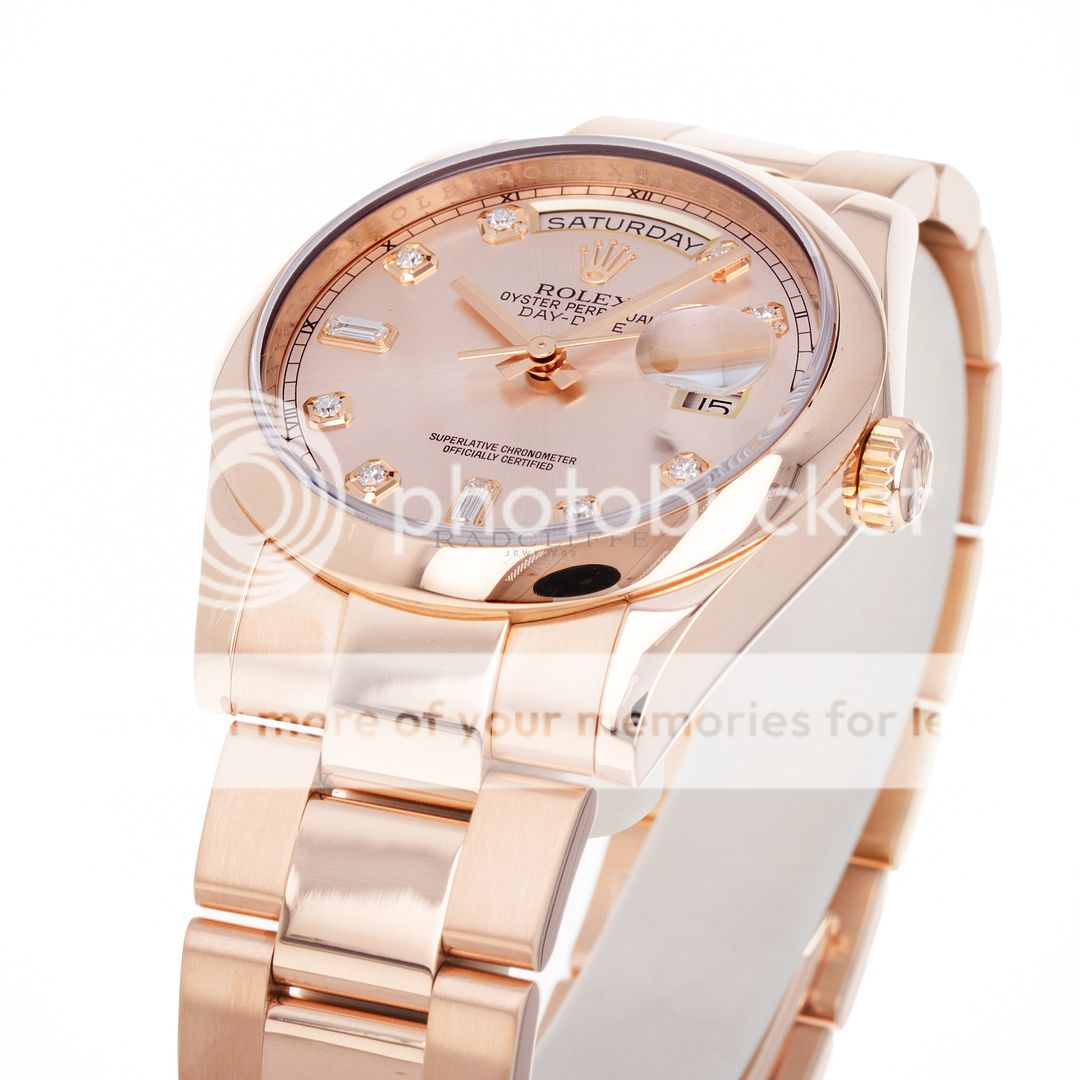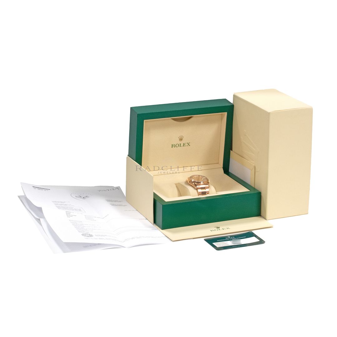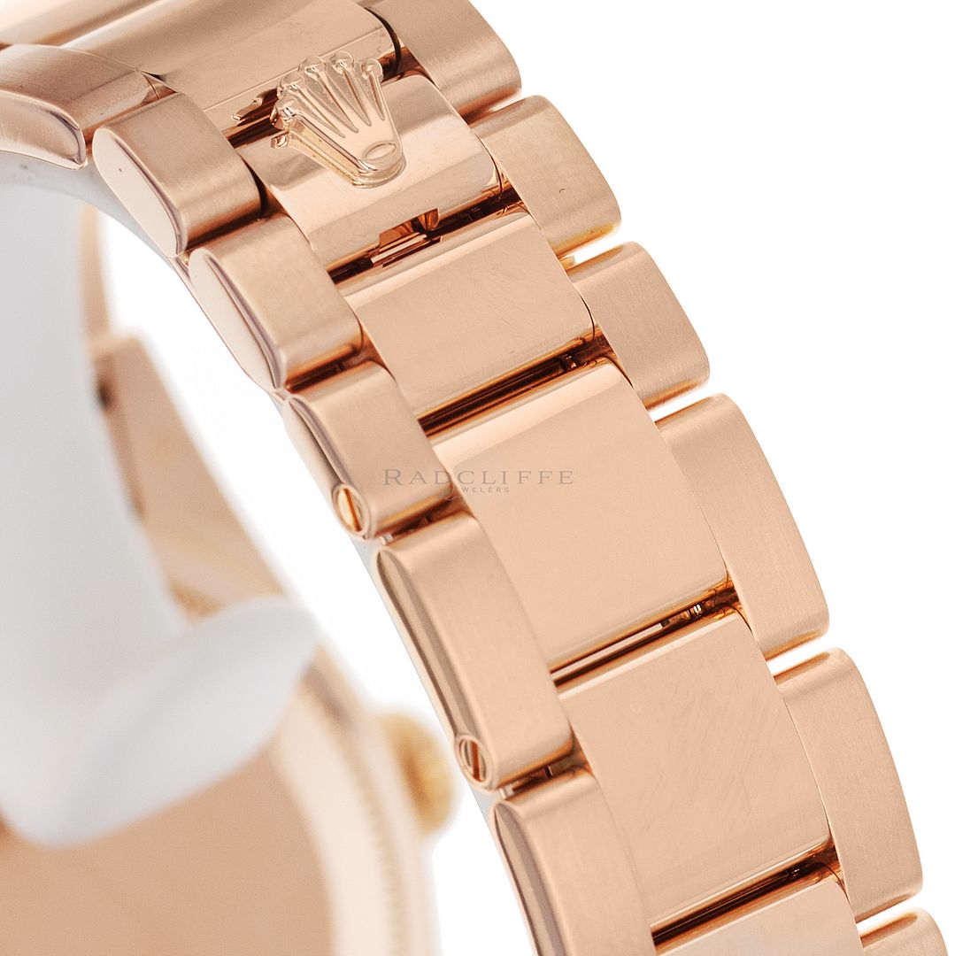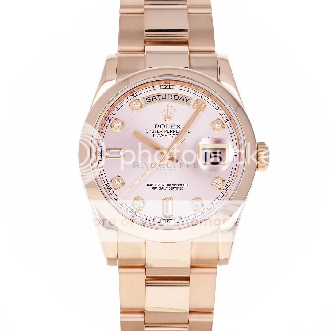 For sale is a pre-owned near mint condition 36mm 18-karat rose gold Rolex Day-Date. The G-serial 118205, circa 2010, will come with a box and a copy of factory service records. While visiting Rolex in April of 2023, the Day-Date received a complete service, a link, date disc, and was refinished. The Day-Date features a rose-colored soleil dial with factory set diamond indices, and a day/date complication. The previously polished case remains free of any noteworthy imperfections and is mounted with an 18 karat rose gold smooth bezel. The Day-Date is secured to the wrist with an 18-karat rose gold Oyster bracelet. The bracelet remains free of stretch and has no visible imperfections. As configured, the watch will accommodate a 7.1-inch wrist with five full size removeable links. Powering the 118205 is an automatic in-house Rolex caliber 3155 with an approximate power reserve of 48-hours.