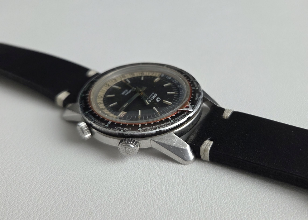 ► Clean matte black dial with Enicar's distinctive Saturn logo, applied indices and complete luminous material, some of which has darkened with age and now only glows minimally, 24-hour rotating bezel with even patina appropriate for its age