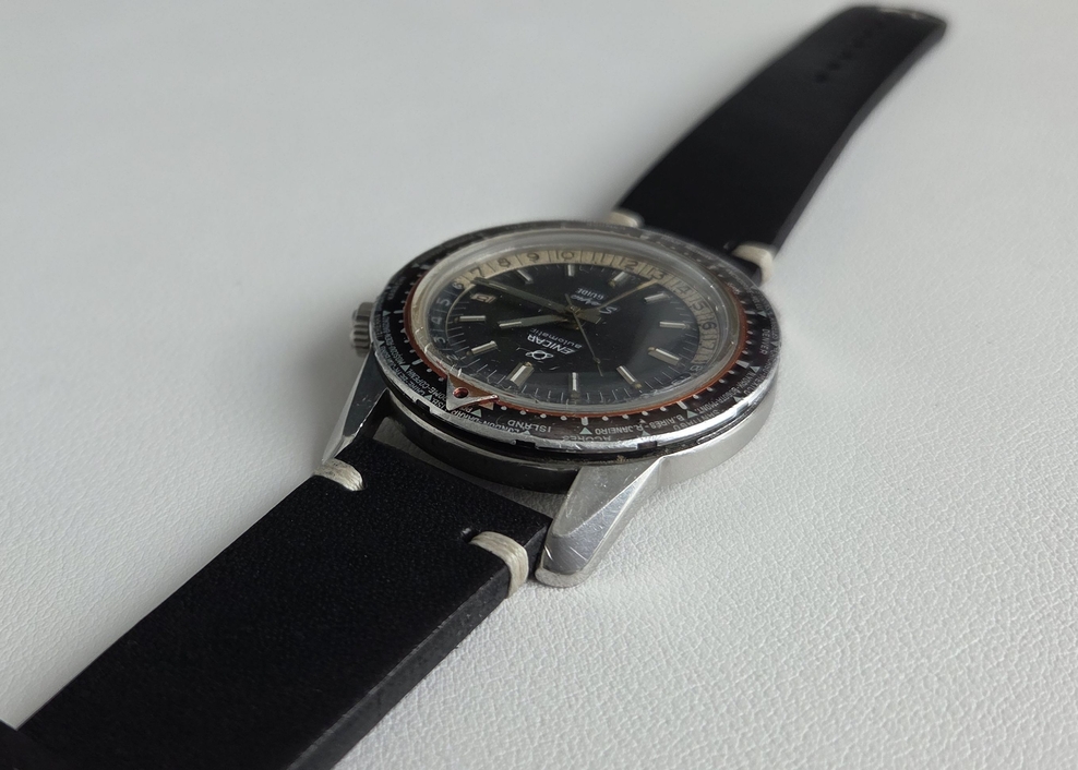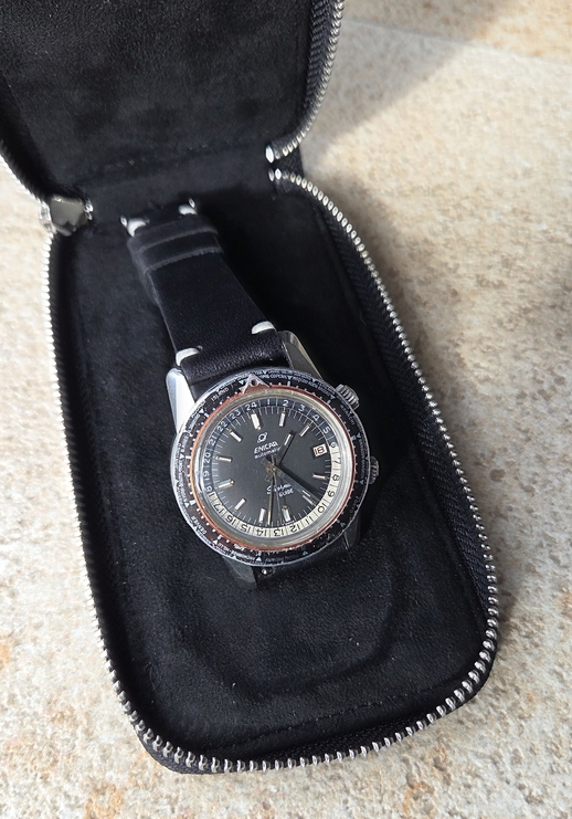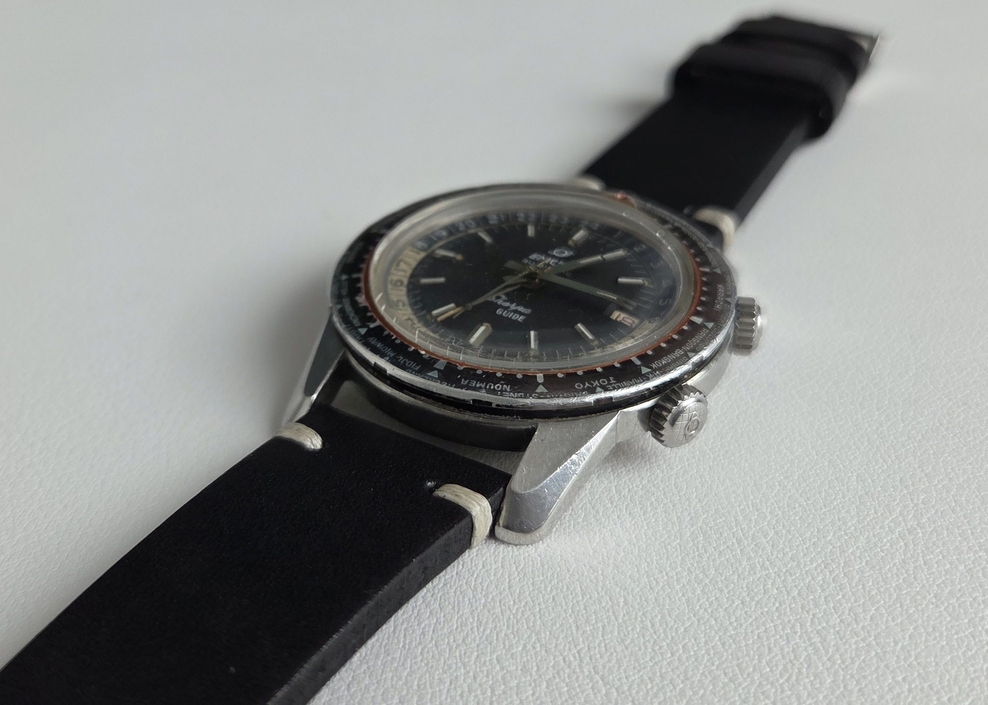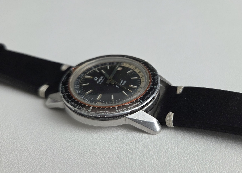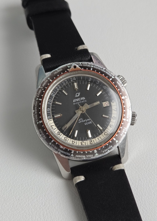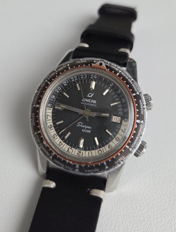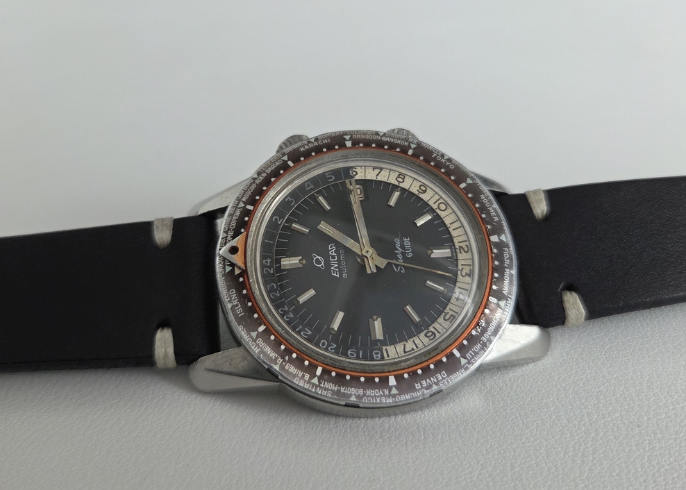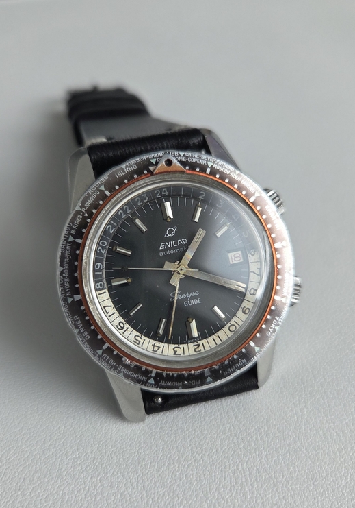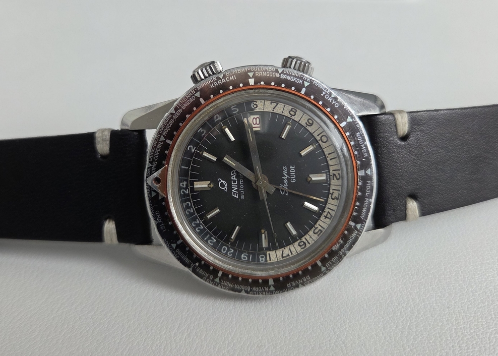 I am offering for sale the following coherenty patinated tool watch classic from renowned Swiss brand Enicar, one of vintage collectors’ favourites: a Sherpa Guide with reference number 146/001 (known as the "Mk II" model generation, dating from around 1965). This powerful GMT has a distinctive city bezel, a red ring next to it and an internal 24-hour rotating bezel, which is operated via the upper crown.