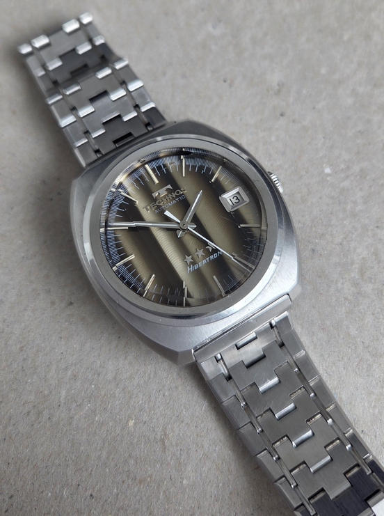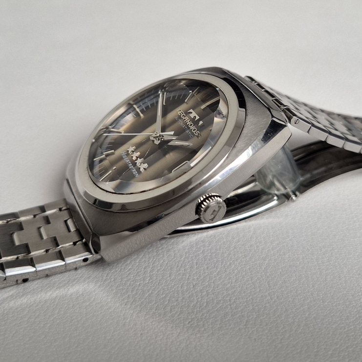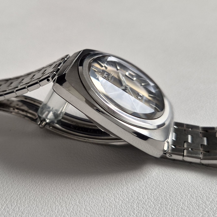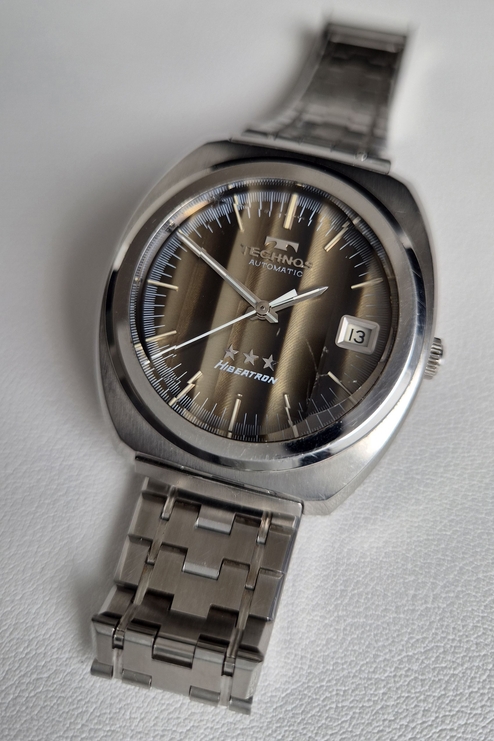 I am offering for sale for sale is this well preserved vintage watch from Swiss brand Technos, featuring a typical 1970s look with an interesting dial, a faceted crystal, its elegant original stainless steel bracelet, and a pretty unique movement.