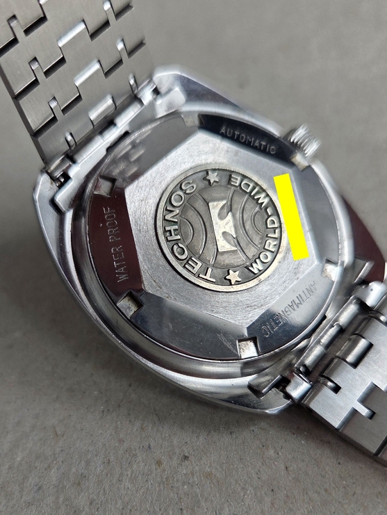 ► Caseback with clearly legible engravings and a central Technos emblem (often missing on other examples)