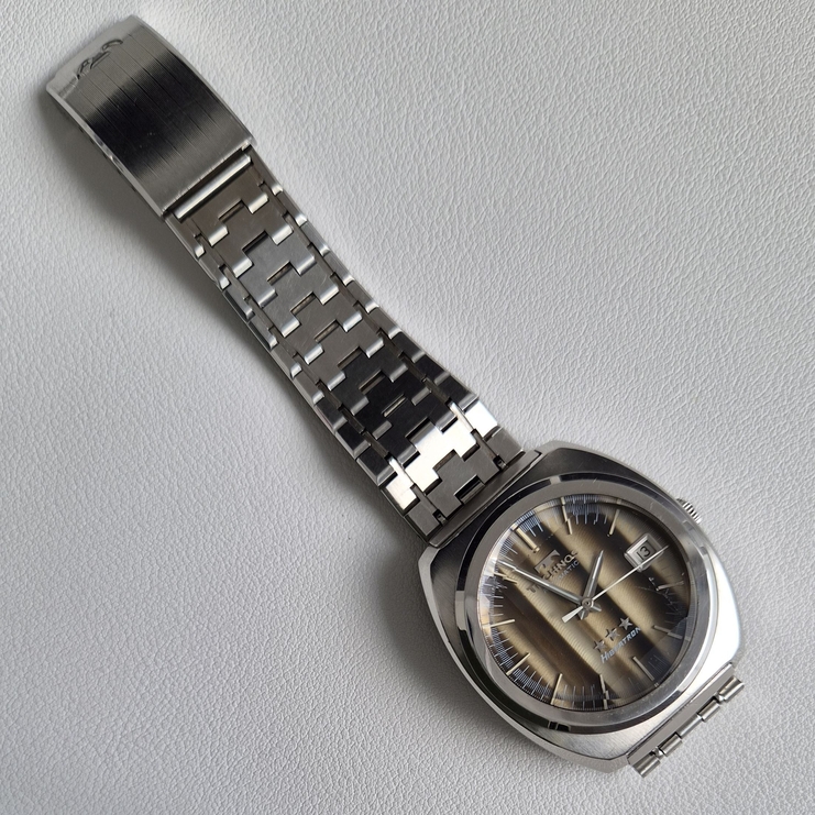 ► High-beat (36,000 bpH) and relatively rarely used Swiss automatic movement ETA 2826 (with 25 jewels and eccentric fine adjustment), featuring a fascinatingly smooth-gliding seconds hand, plus a hacking second function and date display; the movement starts and runs smoothly and keeps time with a deviation of approx. 5 seconds per day (measured laid down, service history unknown); the date mechanism and quick date adjustment also work flawlessly