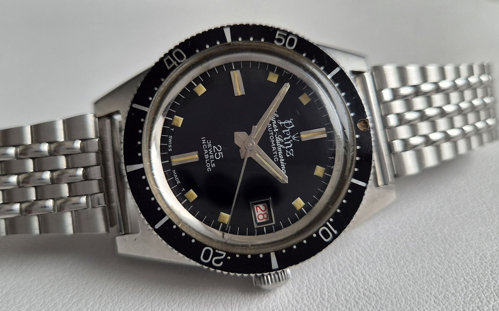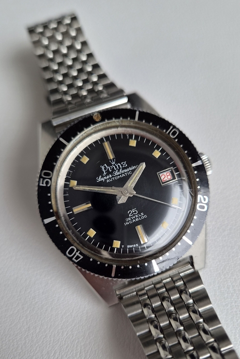 I am offering for sale a nice vintage diver’s watch in excellent condition. It features the so-called “Super-Submarino” case, a design used by numerous manufacturers since the late 1960s. This particular example bears the royal brand name “Prinz” as well as a crown logo on its glossy black dial and is ready to wear.