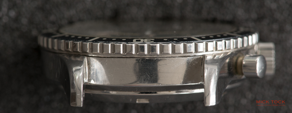 The overall condition is good. The case actually is water resistant (vacuum checked) and shows minor traces of wear. The glass has a few small scratches. The uni-directionally rotating bezel sits firm and clicks exactly. Crown and pushers work perfectly.