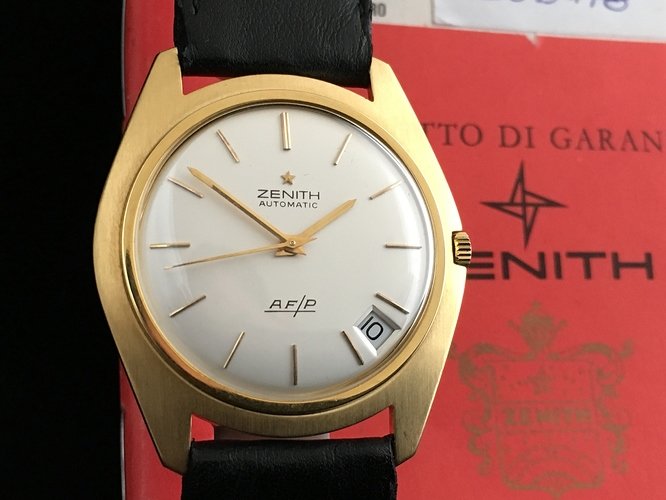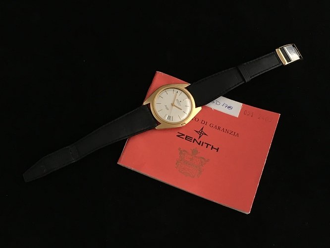 Fitted on a leather strap which also comes from the 70s. There is no Zenith so it will not be original but is beautiful. The warranty book that comes with it is from the years 60/70 but I do not expect original delivered with the watch.