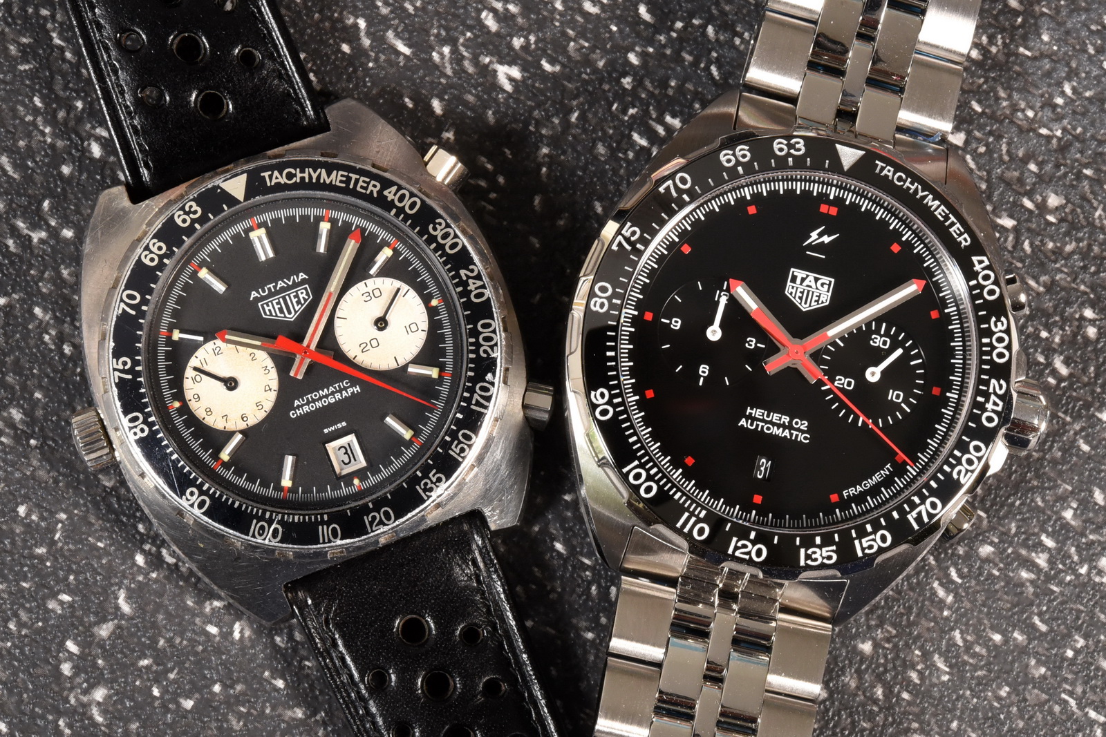 I thought that some of the vintage Heuer enthusiasts might like to see the new Fragment Design Formula 1 chronograph, side-by-side with a couple of the original Autavias, from the 1970s / 80s.