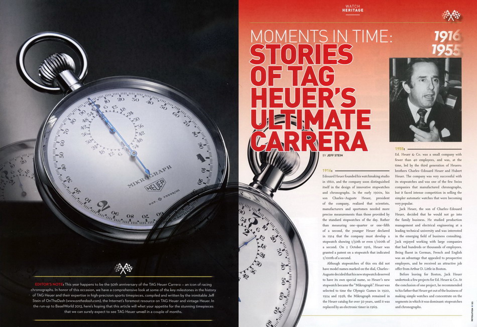 I hope that OnTheDash readers will enjoy my article in the current issue of Revolution, "Moments in Time: The Story of TAG Heuer's Ultimate Carrera". The folks at TAG Heuer asked me to write an article for the "50 Years of Carrera" celebration, and -- oddly enough -- I ended up writing about the Carrera Mikrograph (shown below).