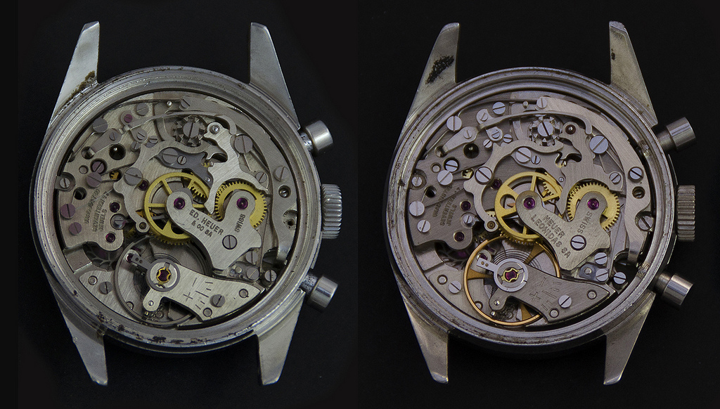 movement : here picture from Shaun, same poly back one with "ed Heuer", think "Leonidas" is later. http://www.onthedash.com/Guide/_Chronographs/63.Carrera/a.Manual_%281960s%29/Carrera_45/c.Reference_3647_T/28Car3647TPairShaun.jpg