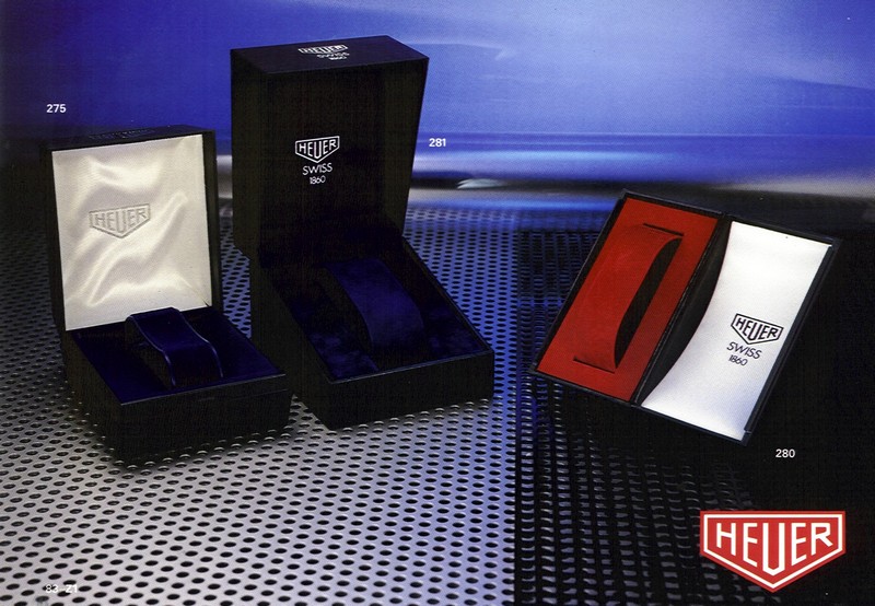 On the other hand, let's not forget these were the heady transition days of the "parts bin", where even watches were sometimes built up with different pieces, different hands, TAG-signed bracelets on Heuer watches and Heuer-signed crown on TAG-Heuer watches etc. - so it may well be that once their supplier of boxes ran out of blue linings for the boxes TAG Heuer could have accepted the white one with no script or that several box types were used together and some not shown in catalogues.