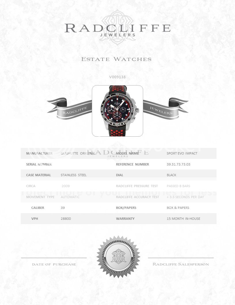 For sale is a near mint condition 46mm stainless steel Glashutte Original Sport Evo Impact Chronograph. The Glashutte comes with box and papers. The Impact comes with an awesome box set. The inner box is a high gloss very heavy dark wood with hidden area for warranty/instruction manual, there is also another compartment with the loupe. The chronograph was originally purchased in late 2009. The Impact series incorporated a design which framed the movement and dial inside of shock absorbers on the inside of the case at four points. The dial is black with applied indices, the minute and hour hands are quite bold and legible. The GO has affixed tachymeter bezel and screw down crown. The Glashutte is on a new black and red OEM strap with steel tang buckle.