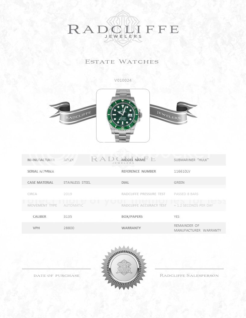 For sale is a near mint condition 40mm stainless steel Rolex Submariner. The 116610LV is a full set. Included in the package are the inner and outer boxes, serialized white hang tag, green hang tag, manuals, and warranty card. Originally purchased in May 2019 from a US Official Rolex Jeweler, the Hulk still has about 3.5 years of factory warranty remaining. The Hulk is super crisp, no notable signs of wear on it. The brushed oyster bracelet has 9 full size links and one half link, will fit up to a 7.3 inch wrist currently, will look into getting another link for this one. The recently discontinued Submariner has a sunburst green dial with applied Chromalight luminescent hour markers, luminescent hands, date display at 3, and is fitted with a green ceramic unidirectional bezel.