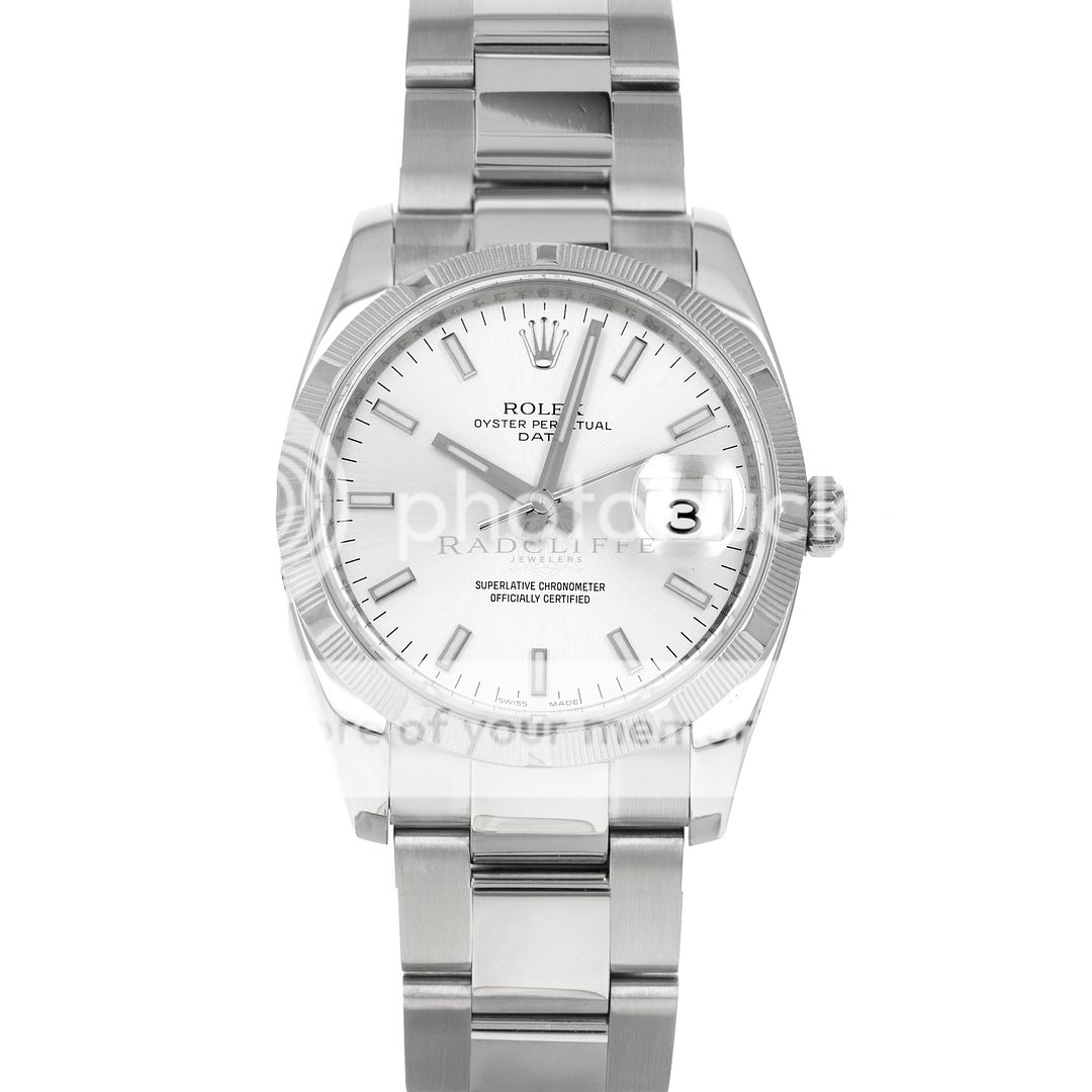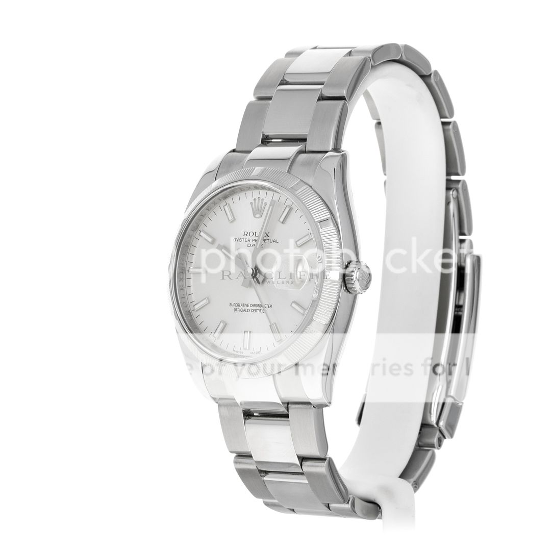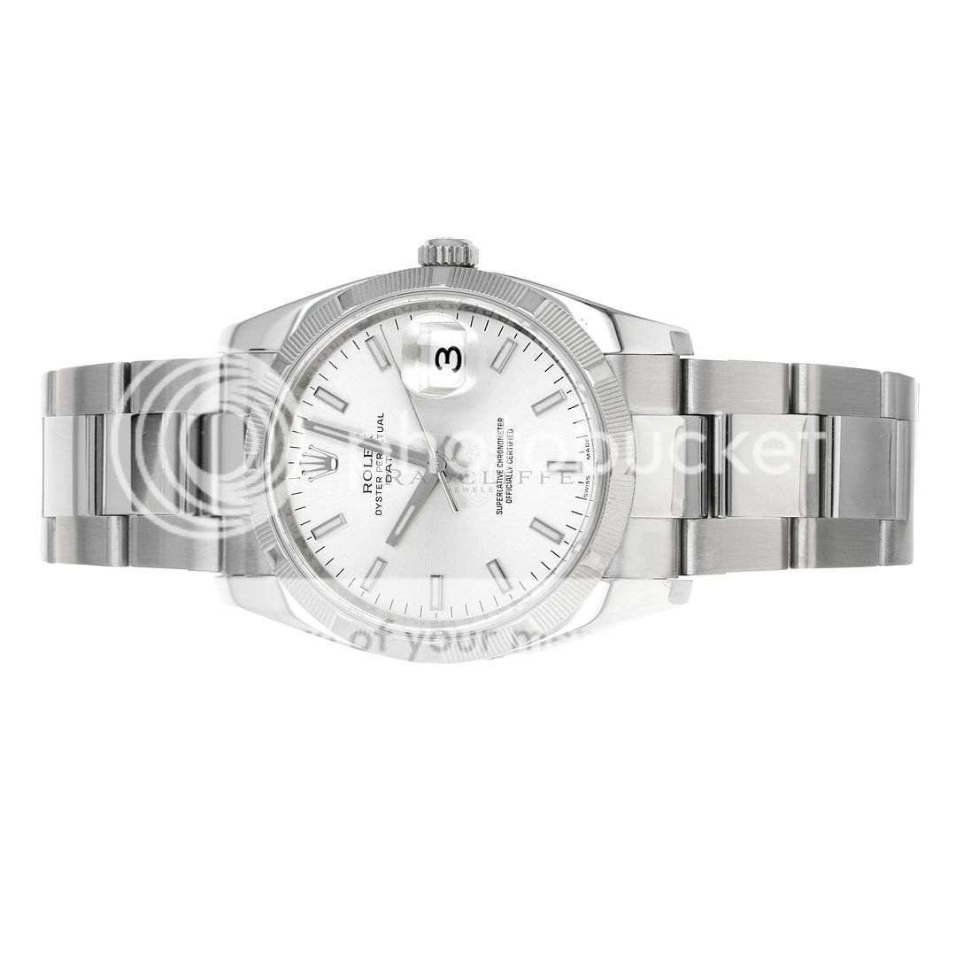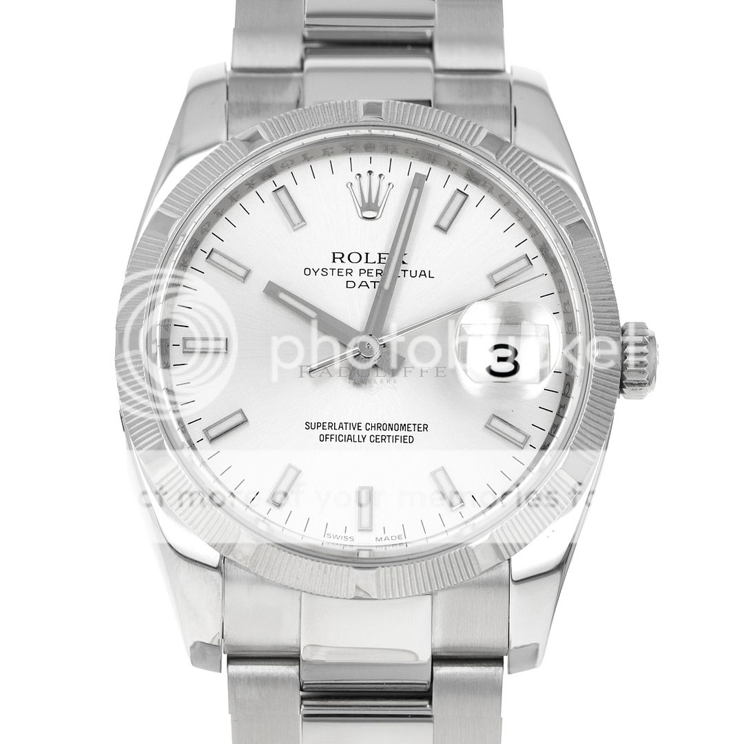For sale is a pre-owned near mint condition 34mm stainless steel Rolex Oyster Perpetual Date. The 115210 sale is for watch with box and papers. Included in the package are the inner and outer boxes, green cardboard sleeve, manuals, hangtag, and warranty card dated from 2011. The Rolex features a polished steel case, which is accented by a fixed engine turned steel bezel. The Date is mounted on a stainless steel Oyster bracelet with brushed steel outer links and polished center links. The bracelet is secured by a brushed stainless steel folding clasp. The Oyster bracelet contains four removeable links and will comfortably fit a 7-inch wrist. The bracelet has minimal stretch and remains in approximately 90% or better condition. This Rolex Date features a silver sunburst dial with applied 18 karat white gold luminous stick hour markers, luminous hands, and a magnified date aperture at the three o’clock position. The movement used in the 115210 is the Rolex Caliber 3135, which features approximately 48 hours of power reserve.