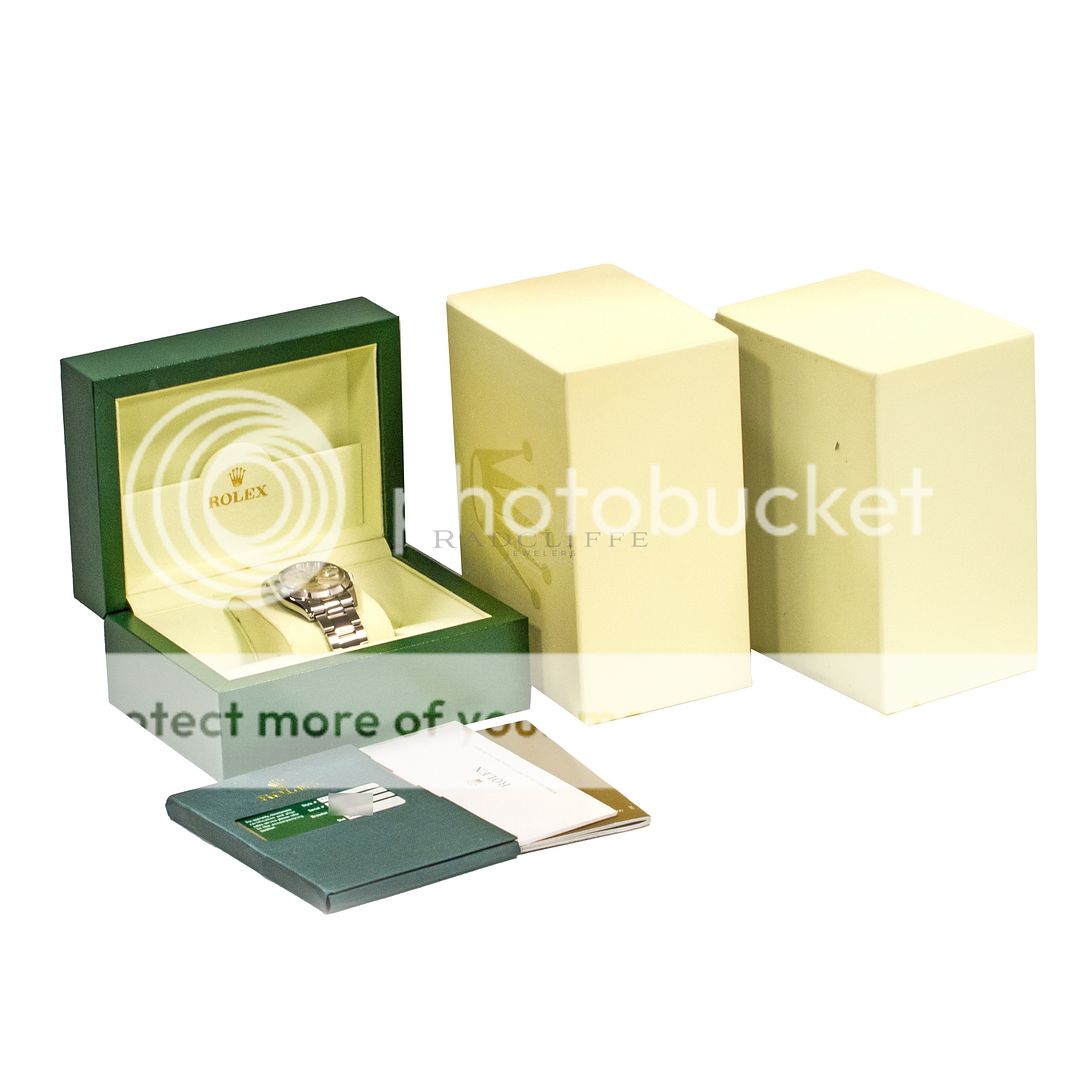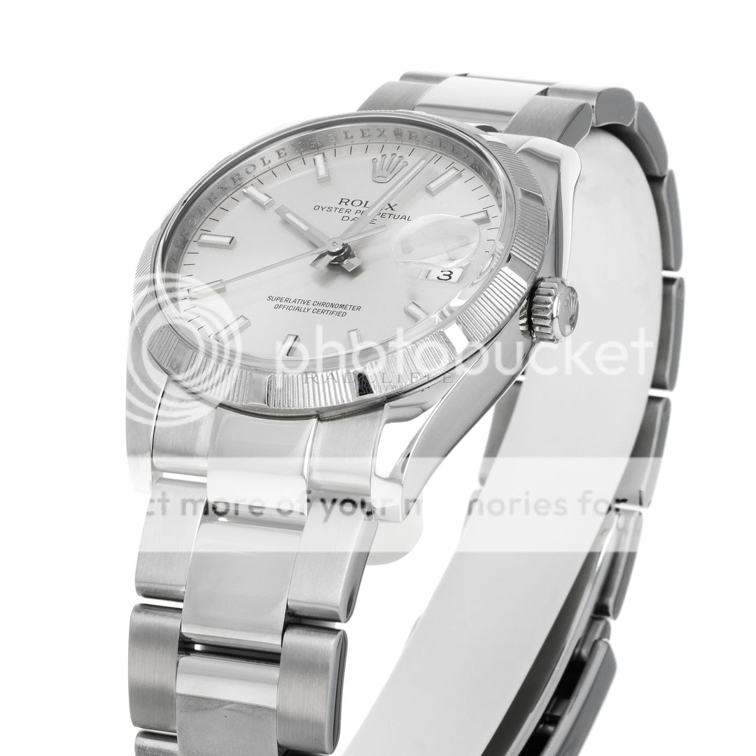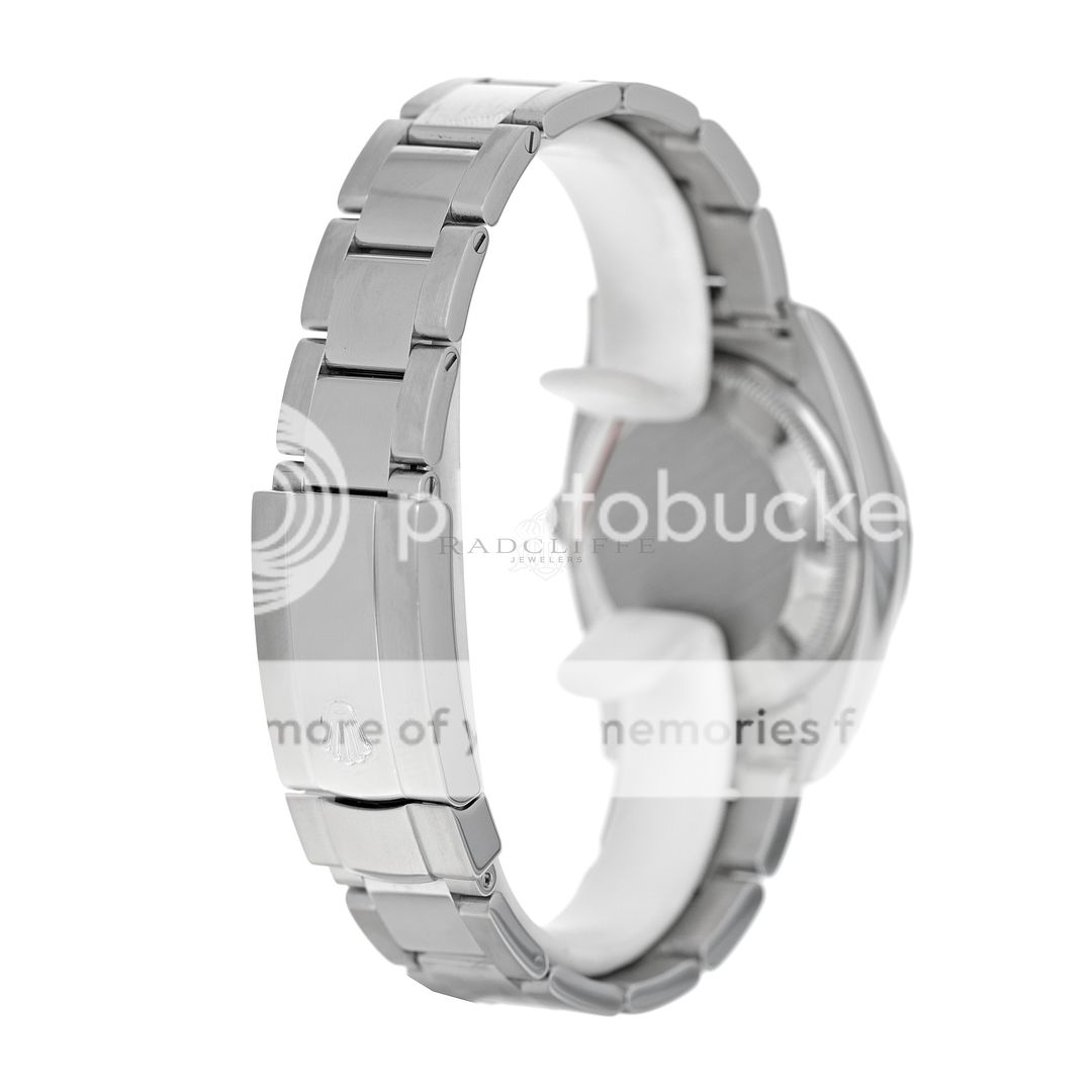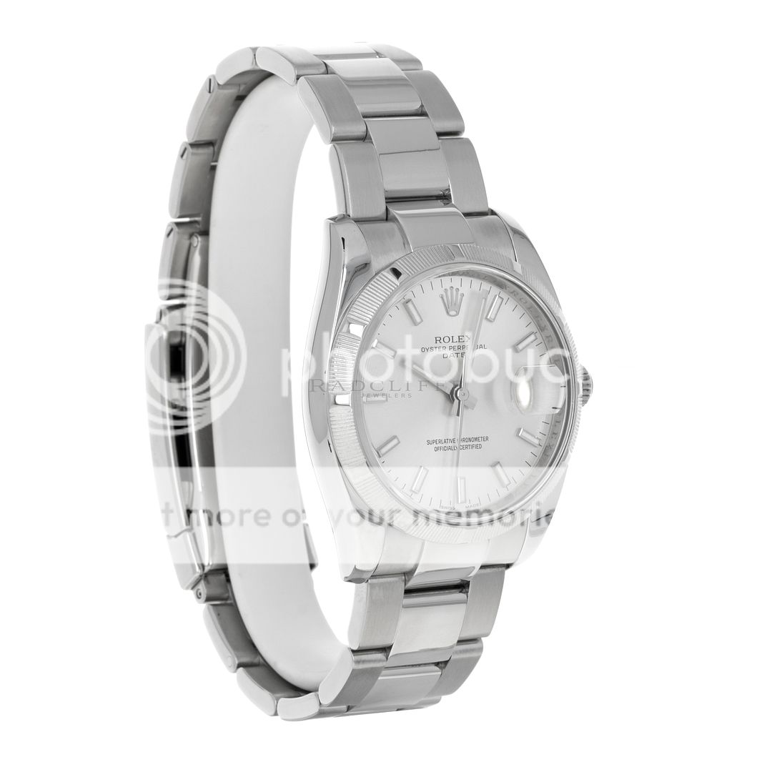 For sale is a pre-owned near mint condition 34mm stainless steel Rolex Oyster Perpetual Date. The 115210 sale is for watch with box and papers. Included in the package are the inner and outer boxes, green cardboard sleeve, manuals, hangtag, and warranty card dated from 2011. The Rolex features a polished steel case, which is accented by a fixed engine turned steel bezel. The Date is mounted on a stainless steel Oyster bracelet with brushed steel outer links and polished center links. The bracelet is secured by a brushed stainless steel folding clasp. The Oyster bracelet contains four removeable links and will comfortably fit a 7-inch wrist. The bracelet has minimal stretch and remains in approximately 90% or better condition. This Rolex Date features a silver sunburst dial with applied 18 karat white gold luminous stick hour markers, luminous hands, and a magnified date aperture at the three o’clock position. The movement used in the 115210 is the Rolex Caliber 3135, which features approximately 48 hours of power reserve.