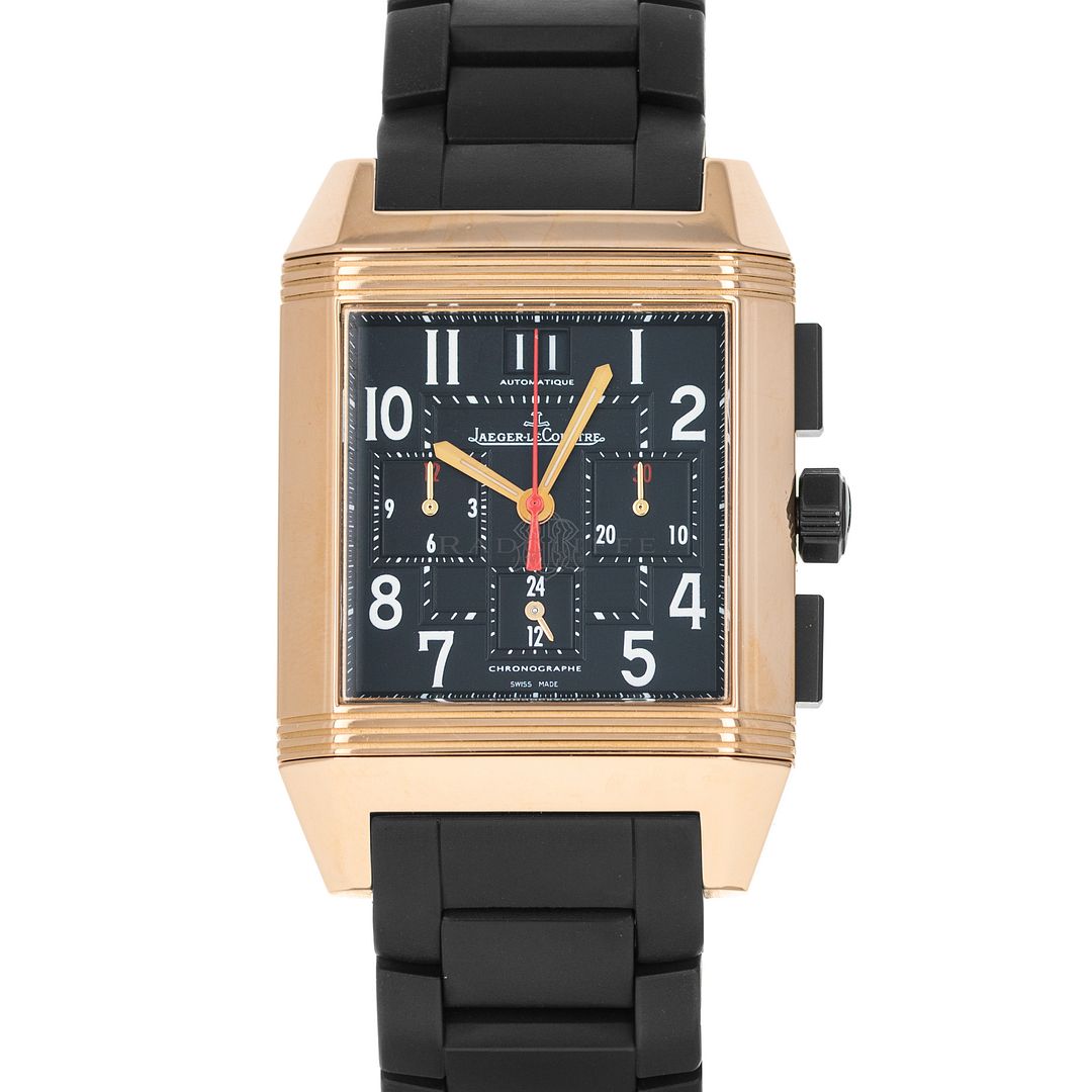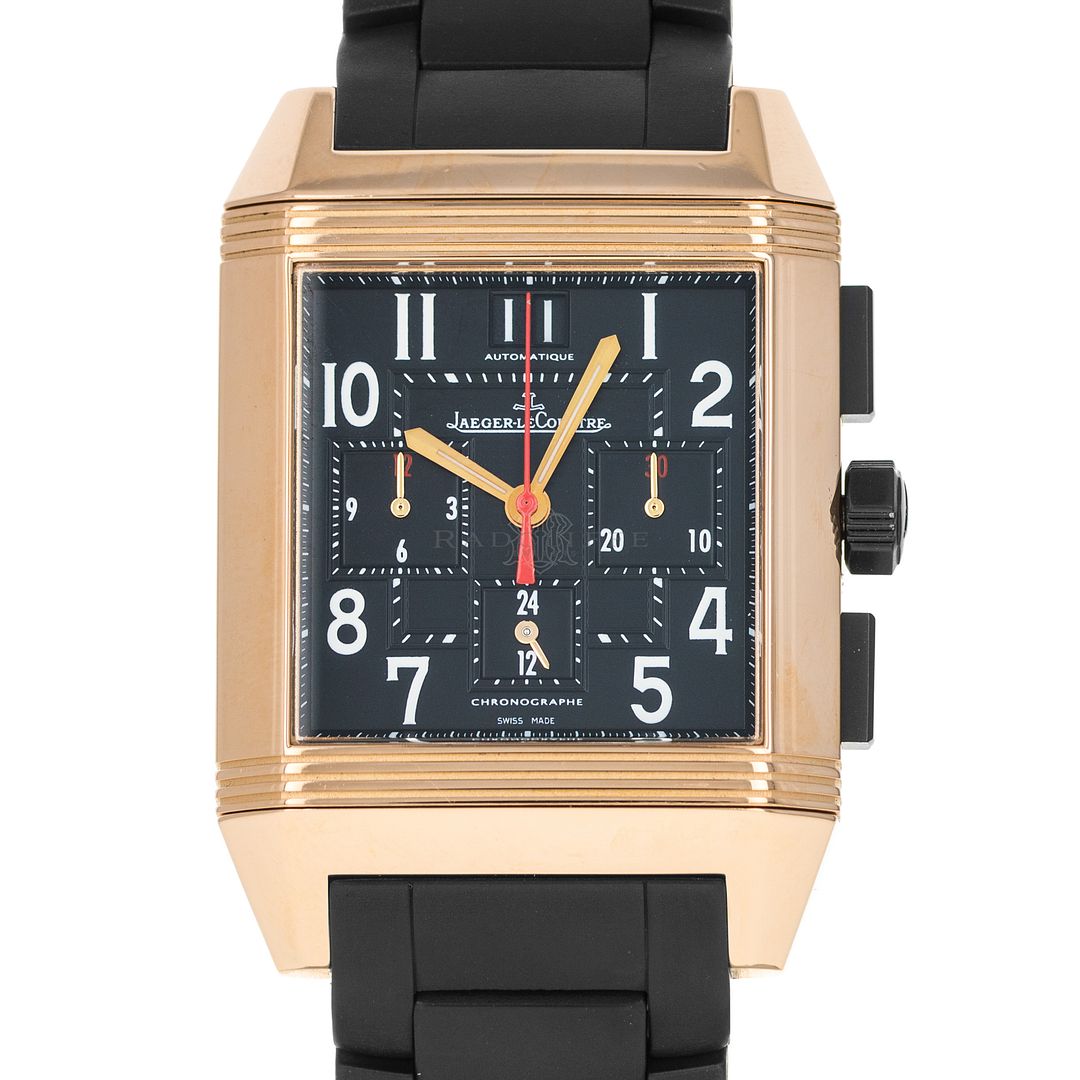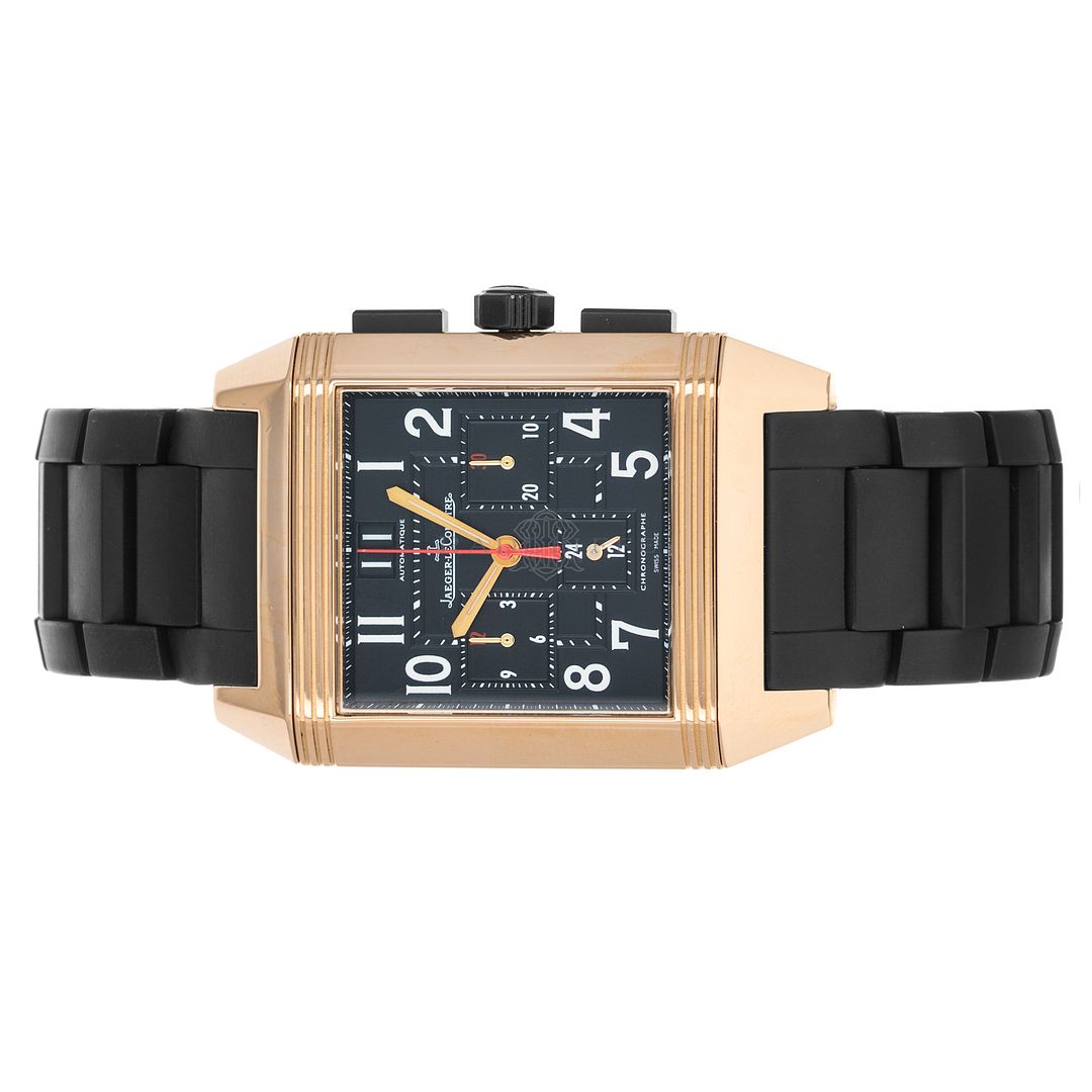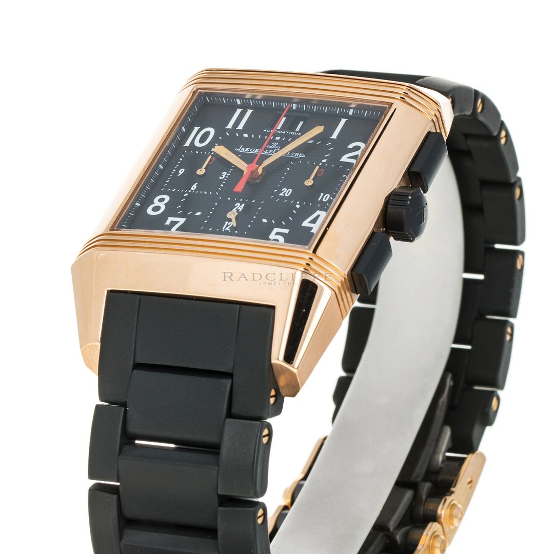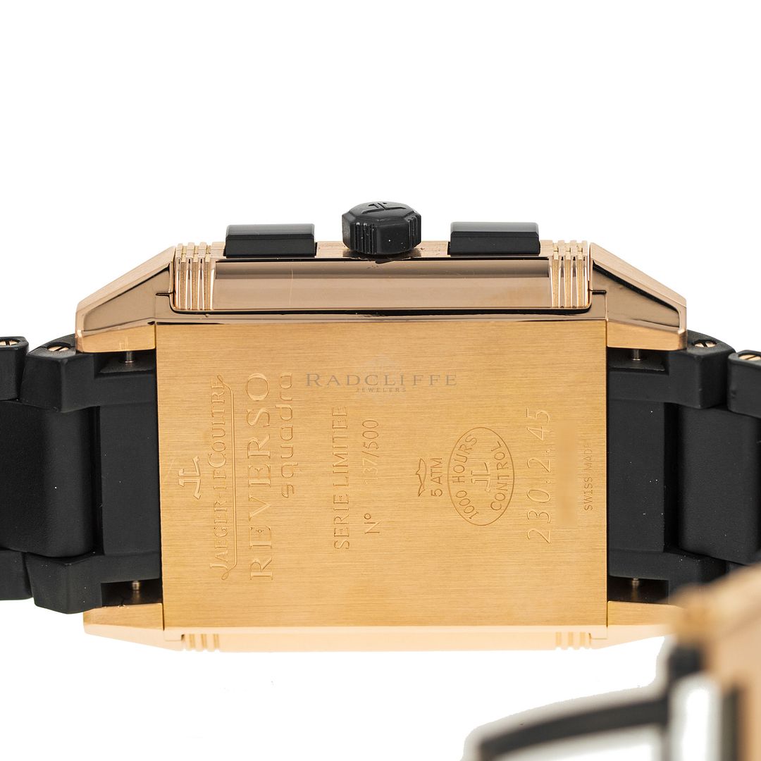For sale is a pre-owned excellent condition 35mm by 50mm 18 karat roe gold Jaeger-LeCoultre Reverso Squadra. The Q7012671 sale is for watch with box and service papers. The Reverso returned from the Jaeger-LeCoultre facilities in August of 2023 after receiving a complete service, a new crystal, a new link, a new crown, a new pusher, and refinishing. The Jaeger-LeCoultre Reverso Squadra Chronograph stands as a testament to the brand's innovative spirit and dedication to sportsmanship. This watch boasts a distinct rectangular case with bold, masculine lines, designed for both style and function. Equipped with a precise automatic movement, it features a chronograph function that measures elapsed time with utmost accuracy. The Reverso has a high polished 18 karat rose gold case with brushed case sides. The watch case does retain some small signs of wear that did not come out while being refinished at the factory. The Squadra has a black dial with high contrast white Arabic hour markers, square sub dials, and a big date display at 12. The watch is mounted on a rubberized link bracelet with a push button fold over invisible deployant buckle. The bracelet has no stretch and is currently set to comfortably accommodate a 7.5-inch wrist. The reversed side of the case has the automatic decorated movement proudly displayed. Powering the Jaeger-LeCoultre is the caliber 754 with a 65-hour power reserve.
