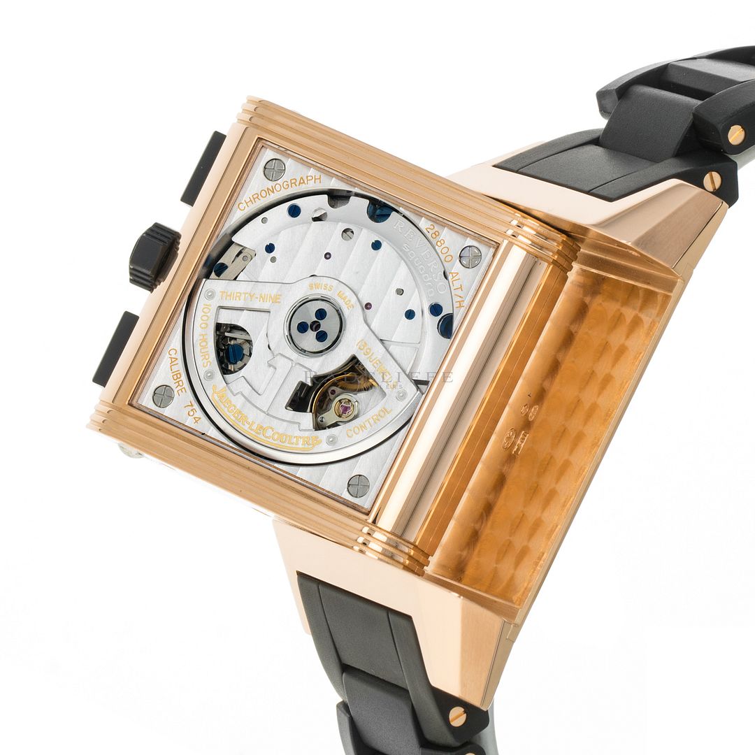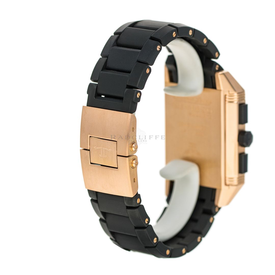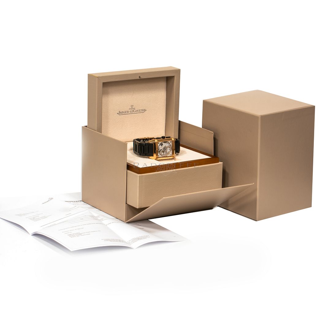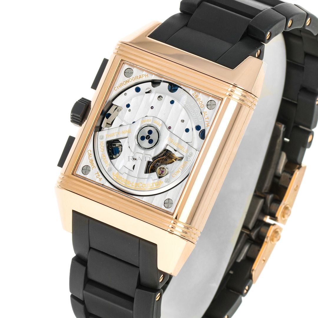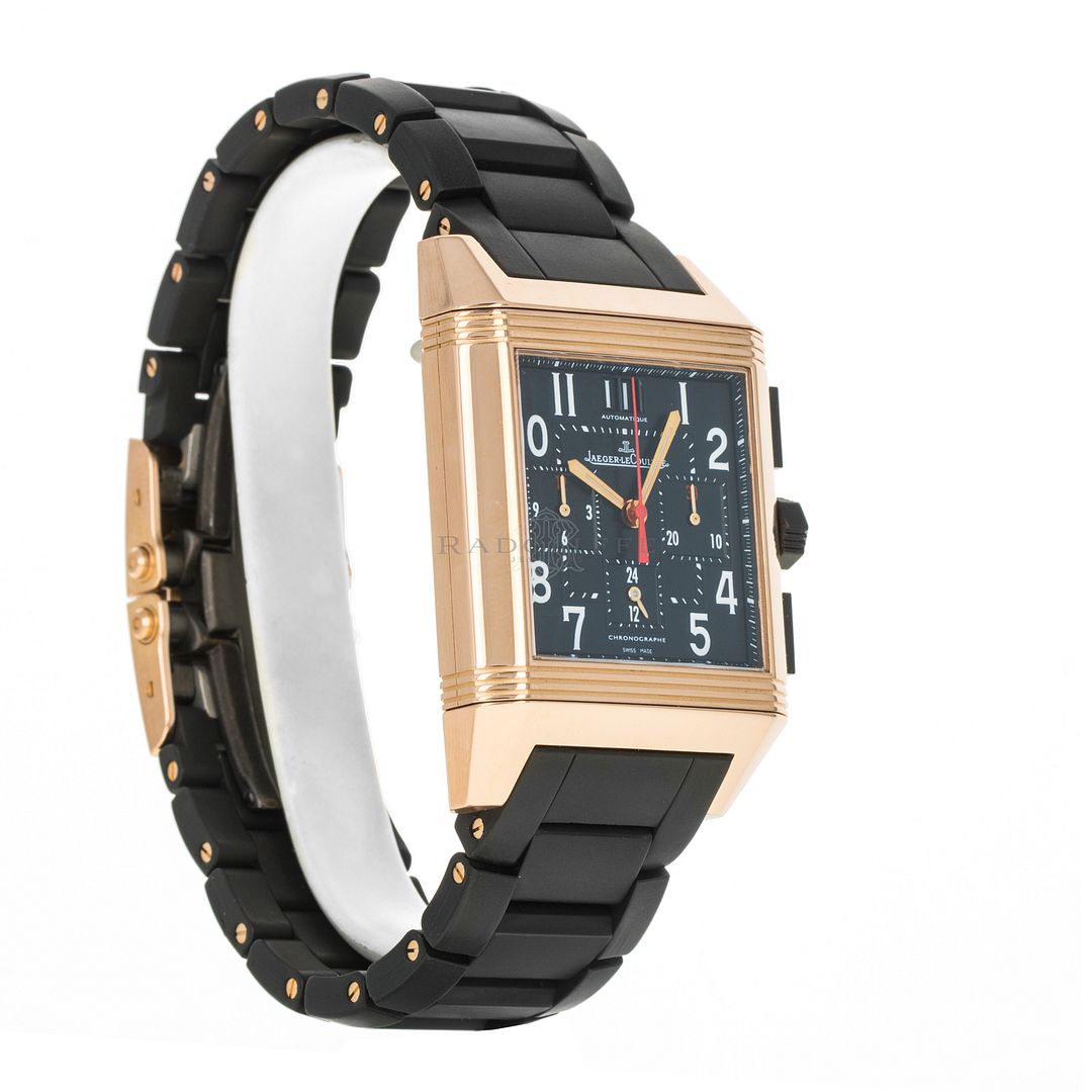For sale is a pre-owned excellent condition 35mm by 50mm 18 karat roe gold Jaeger-LeCoultre Reverso Squadra. The Q7012671 sale is for watch with box and service papers. The Reverso returned from the Jaeger-LeCoultre facilities in August of 2023 after receiving a complete service, a new crystal, a new link, a new crown, a new pusher, and refinishing. The Jaeger-LeCoultre Reverso Squadra Chronograph stands as a testament to the brand's innovative spirit and dedication to sportsmanship. This watch boasts a distinct rectangular case with bold, masculine lines, designed for both style and function. Equipped with a precise automatic movement, it features a chronograph function that measures elapsed time with utmost accuracy. The Reverso has a high polished 18 karat rose gold case with brushed case sides. The watch case does retain some small signs of wear that did not come out while being refinished at the factory. The Squadra has a black dial with high contrast white Arabic hour markers, square sub dials, and a big date display at 12. The watch is mounted on a rubberized link bracelet with a push button fold over invisible deployant buckle. The bracelet has no stretch and is currently set to comfortably accommodate a 7.5-inch wrist. The reversed side of the case has the automatic decorated movement proudly displayed. Powering the Jaeger-LeCoultre is the caliber 754 with a 65-hour power reserve.