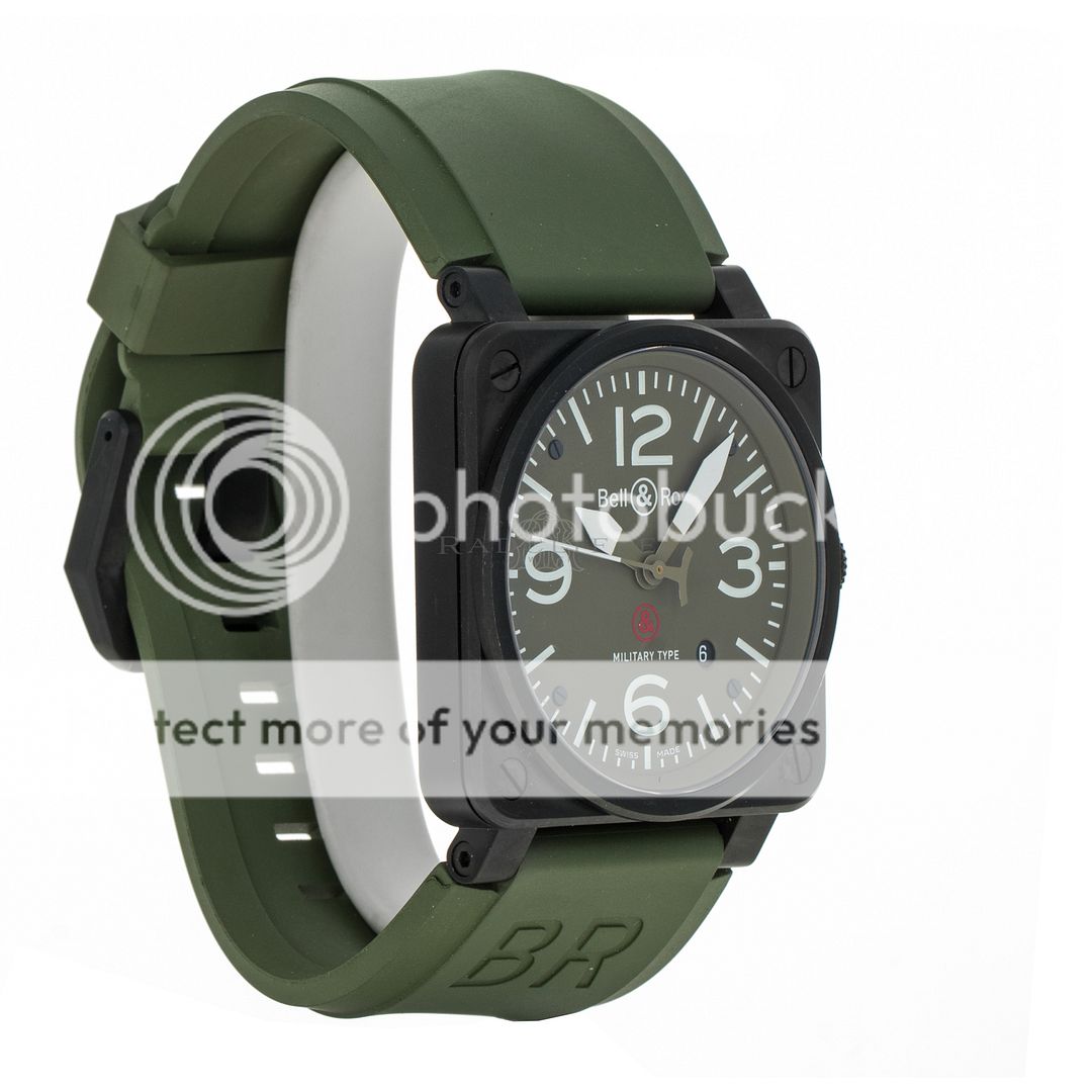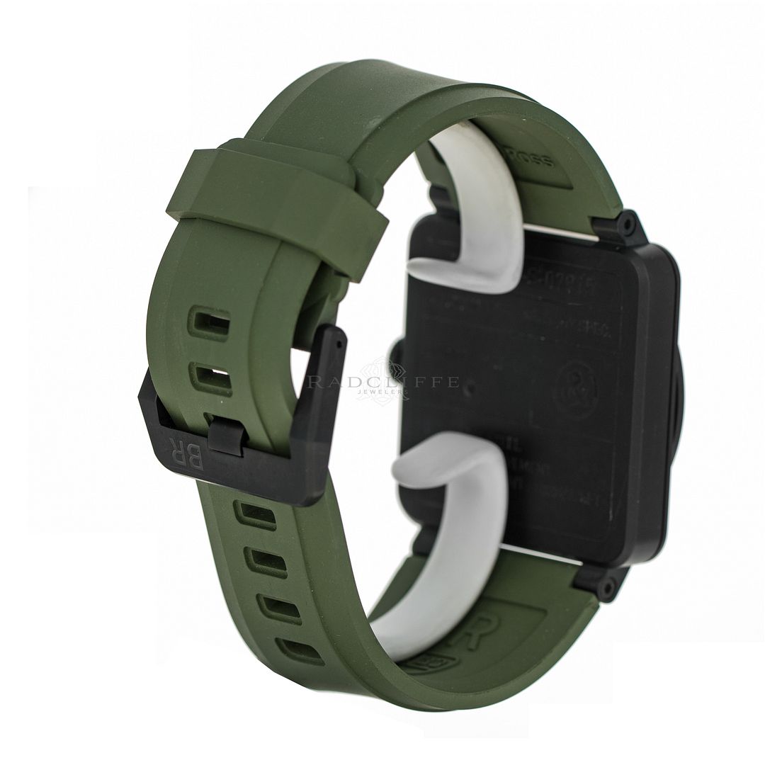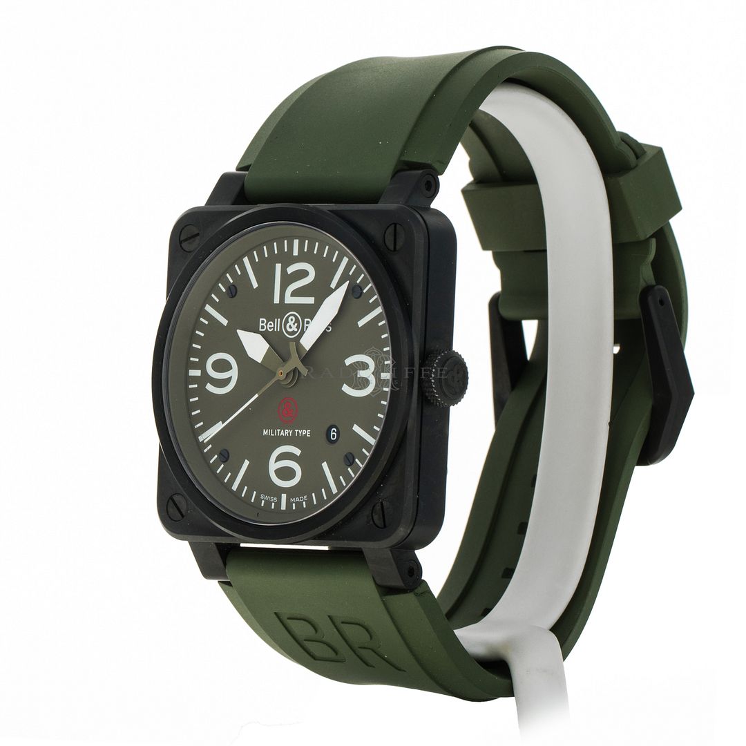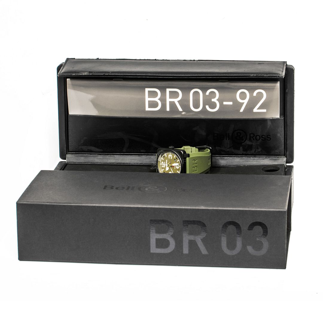 For sale is a pre-owned near mint condition PVD 42mm Bell & Ross Military Type. The sale of the BR03-92 comes with a box and papers. The inner black box is peeling apart, the wear is notable. The package includes inner and outer boxes, manual, strap changing tools, and open warranty card. The green dial features mixed Arabic and stick hour markers, sword hands, a central sweeping second hand, and a date aperture between 4 o’clock and 5 o’clock. The black PVD case is in great shape, not notable signs of wear. The OEM green rubber strap has an OEM tang buckle. This Military Type is powered by an automatic self-winding movement with a 42-hour power reserve.