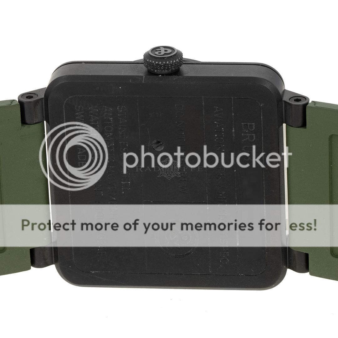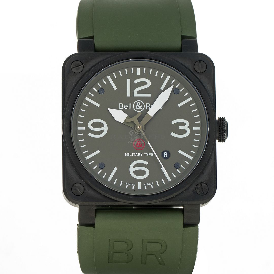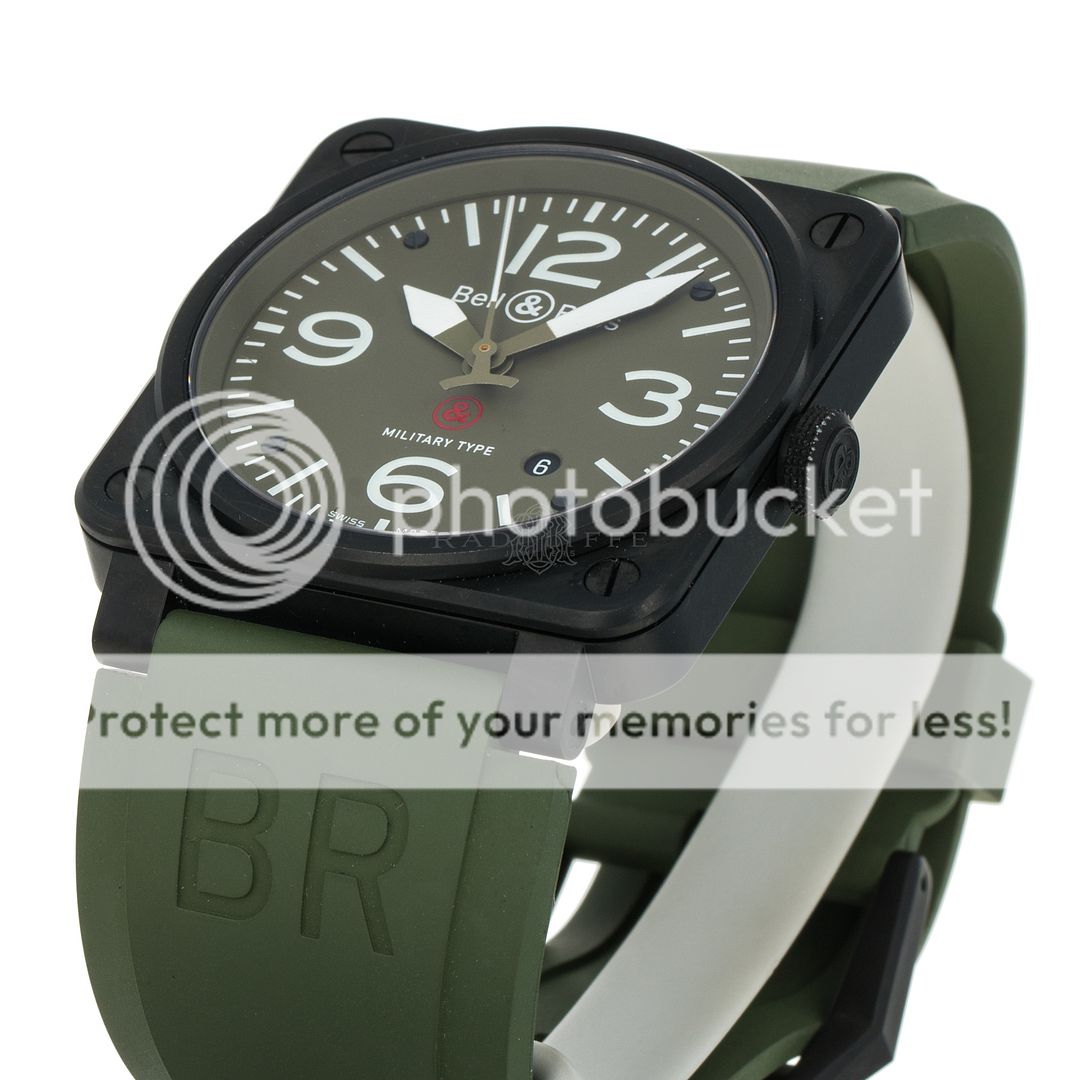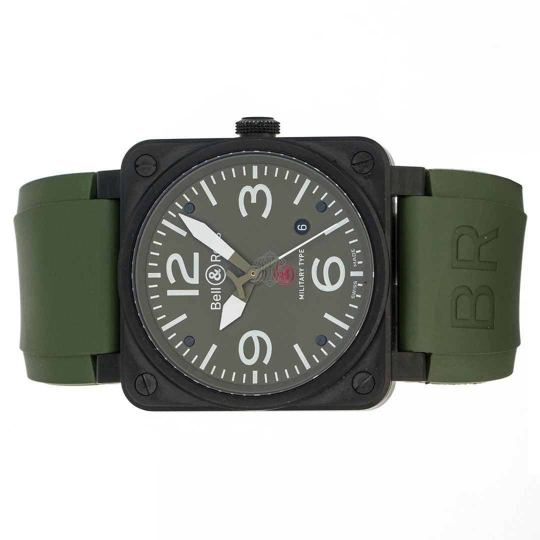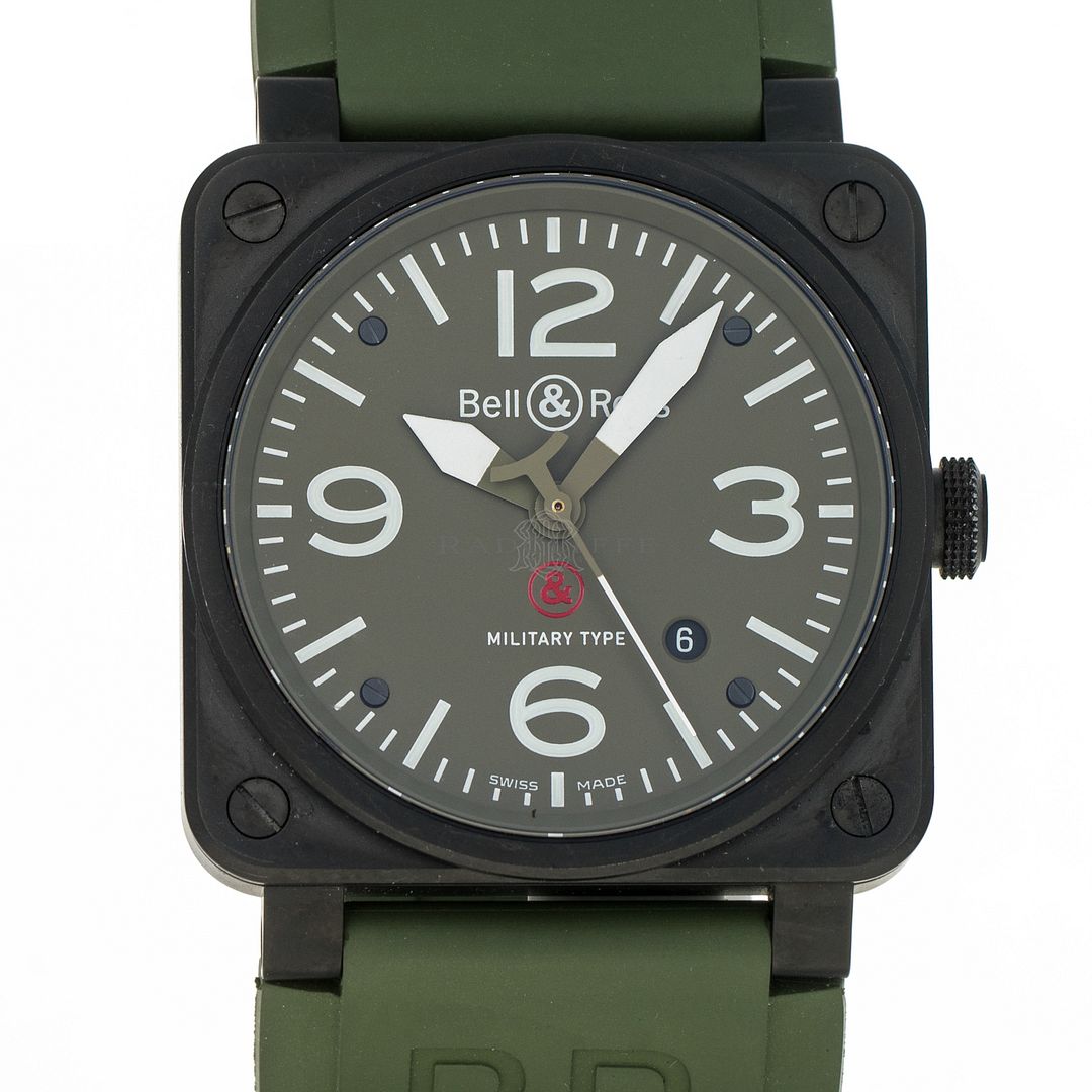 For sale is a pre-owned near mint condition PVD 42mm Bell & Ross Military Type. The sale of the BR03-92 comes with a box and papers. The inner black box is peeling apart, the wear is notable. The package includes inner and outer boxes, manual, strap changing tools, and open warranty card. The green dial features mixed Arabic and stick hour markers, sword hands, a central sweeping second hand, and a date aperture between 4 o’clock and 5 o’clock. The black PVD case is in great shape, not notable signs of wear. The OEM green rubber strap has an OEM tang buckle. This Military Type is powered by an automatic self-winding movement with a 42-hour power reserve.