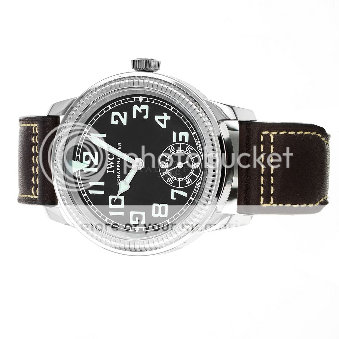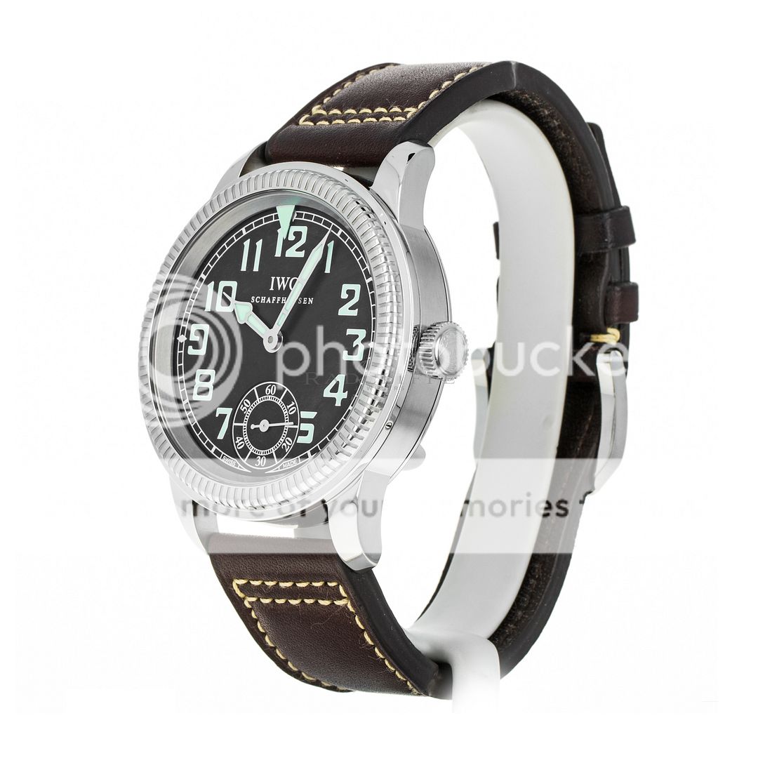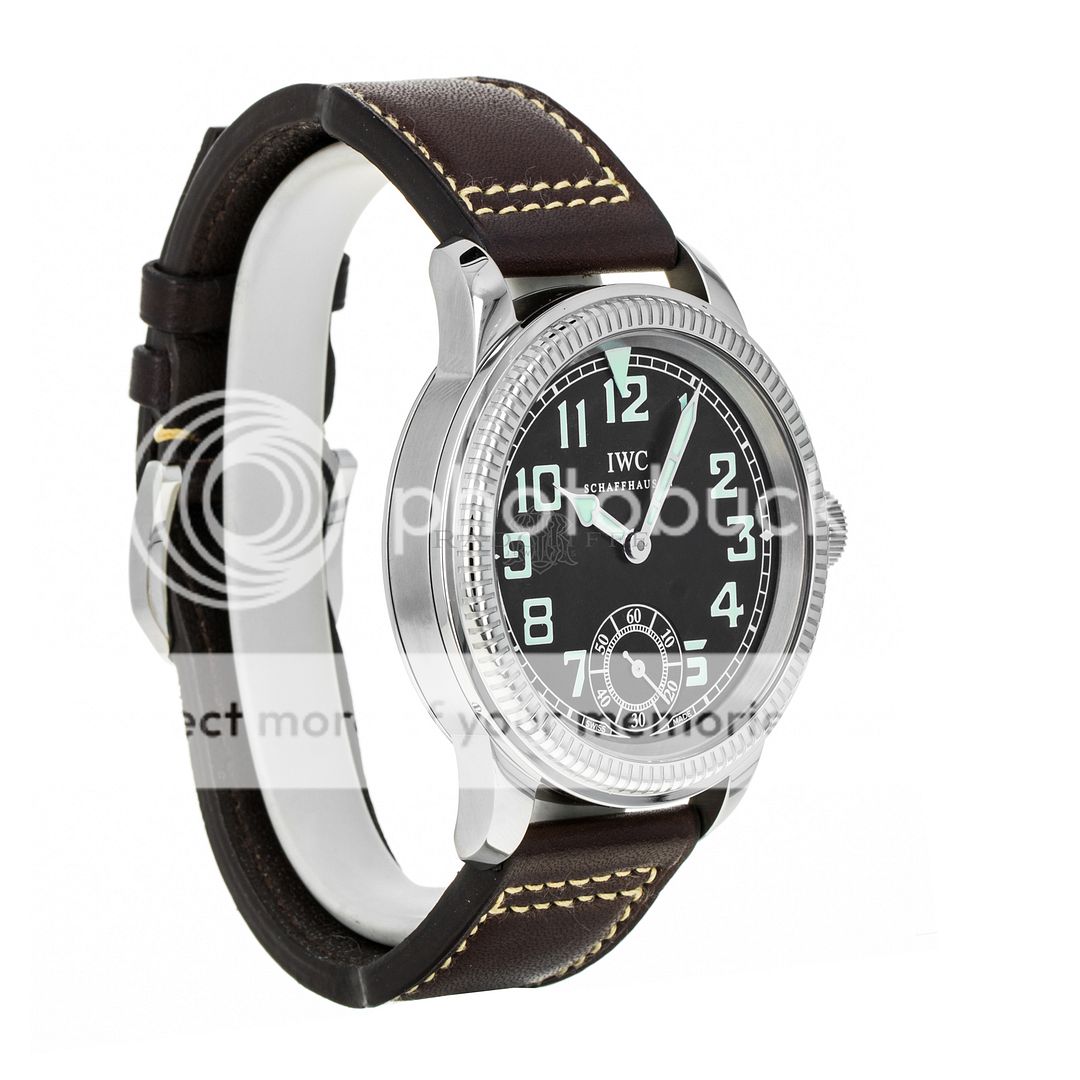 For sale is a pre-owned near mint condition 44mm stainless steel IWC Vintage Collection Pilot. The IW325401 sale is for watch with box and papers. The package includes an inner box, hang tag, polishing cloth, guarantee card, and original open warranty card. The IWC has a brushed steel case with polished lug tops and a bidirectional coin edged bezel. The Pilot has a matte black dial with painted Arabic hour markers and small seconds display at 6. The watch is on an OEM brown leather strap with steel tang buckle. The one owner timepiece was originally purchased in 2008 and has seen minimal wrist time. Powering the Vintage Collection Pilot is a manual wound caliber 98300 with a 46-hour power reserve.