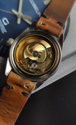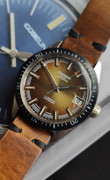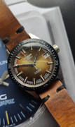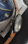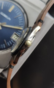 A fantastic Silvana Skin Diver with bakelite bezel and arrowhead hands. Chrome/Stainless steel screwback unpolished/unmolested case. Acrylic crystal. Quick set date. Beautiful golden dial. Matching handmade strap.