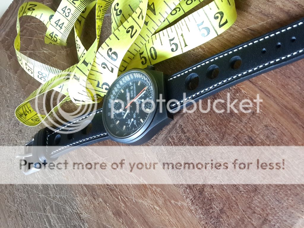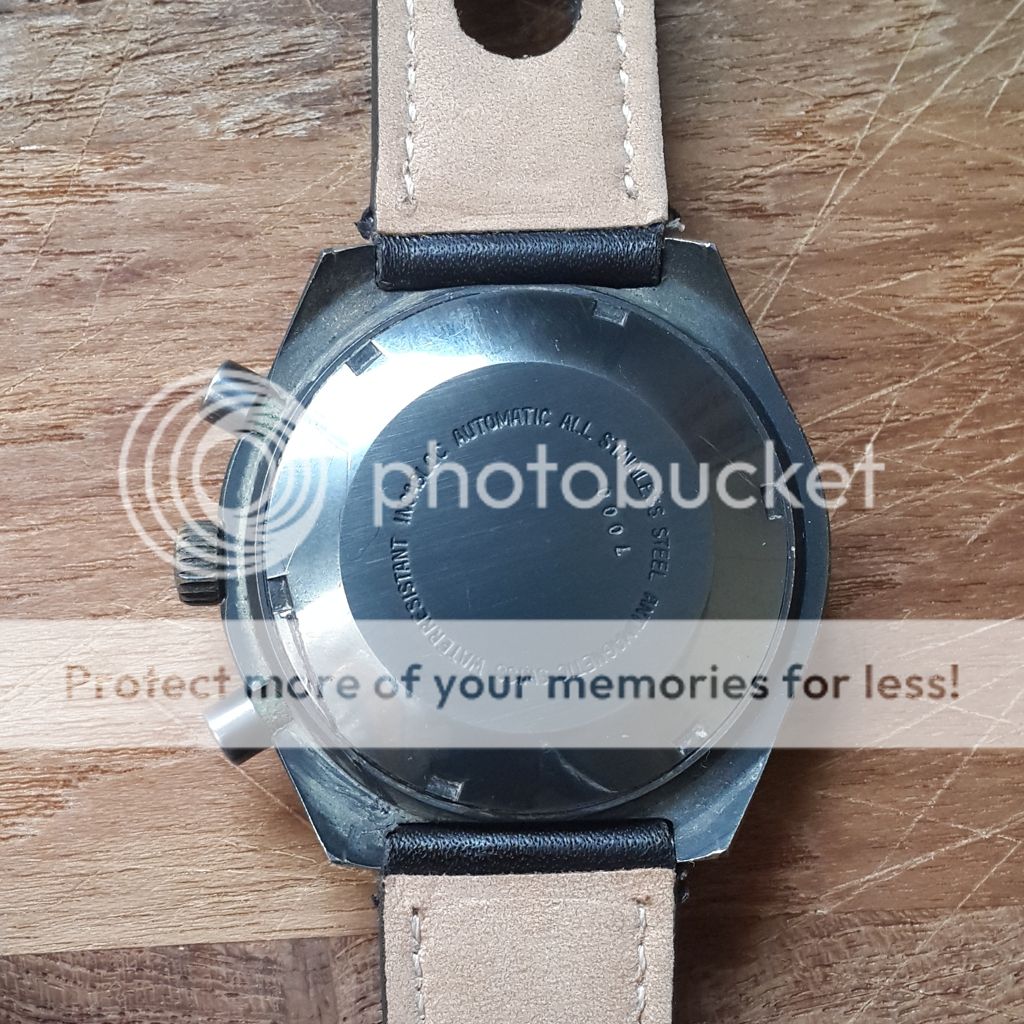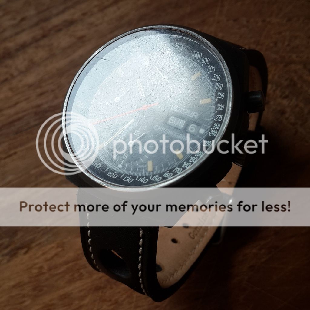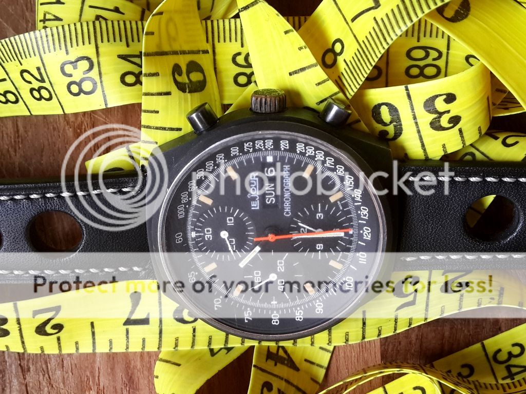 This chronograph watch has a beautiful black dial with hour markers that are aged perfectly with the right amount of patina. All the PVD is there with a exception of slightly missing next to 4 o'clock as seen in the pictures, these Vintage PVD watches look like they are flat gunmetal grey instead of shiny black seen on modern watches. The crown shows some pitting. The case back has a slightly deep scratch from either previous owner or a careless watchmaker, I tried opening it to take pics but it does budge didn't want more scratches. The watch takes 19mm straps but I managed to fit this barely used 20mm Rally strap to the watch using 19mm spring bars.