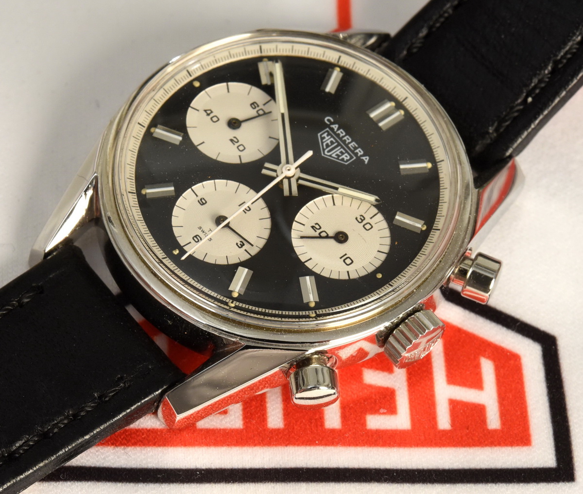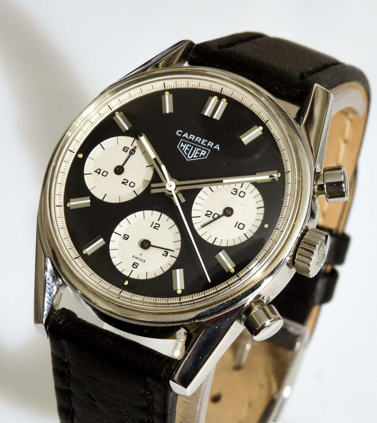 For Sale – Super Rare Vintage Heuer Carrera, Reference 2447 NS (Black Dial, with White Registers). Among the rarest of all the vintage Heuer chronographs -- I believe that we have seen fewer than five of these over the past decade, which makes this one far more rare than the Reference 2447 SN (white dial with black registers) or Reference 2447 NST (black dial with white registers, and tachymeter scale). I bought this watch from the original owner; he had the watch serviced, over its life, by the watchmaker here in the U.S. who many call “The Master”.