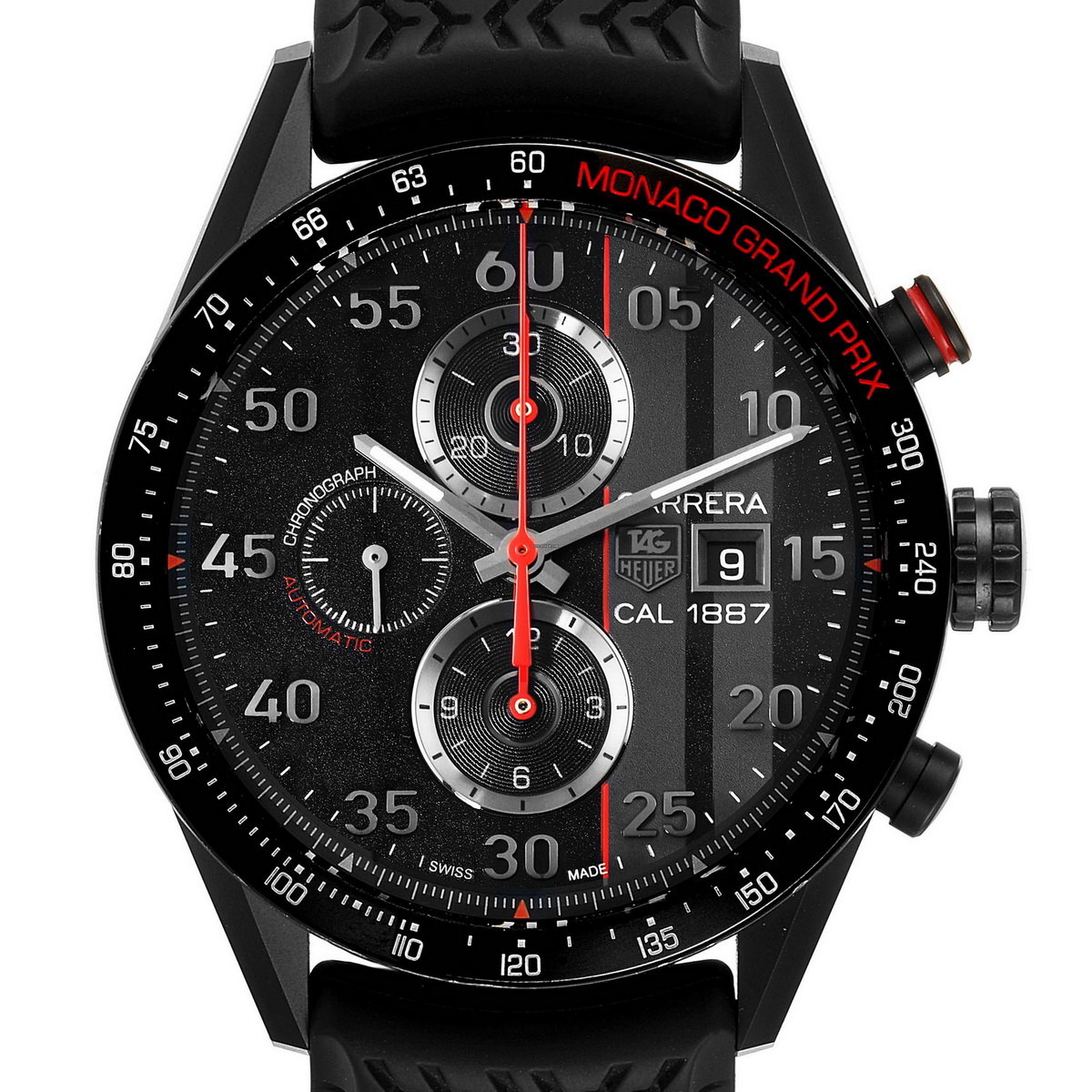 We see many of the same "racing" elements in the 2014 model as we see in the new model introduced a few days ago -- asphalt finish on the dial; "double digits" to mark the minutes; the red lettering on the bezel where we usually see "Tachymeter"; and the red accents on the dial and hands. Perhaps there is a limit to such elements, so that some repetition is inevitable. Note that the "Monaco Limited Edition" model uses a titanium case and the rubber strap with tire tread finish; the new Porsche Special Edition offers a leather strap or a stainless steel bracelet.