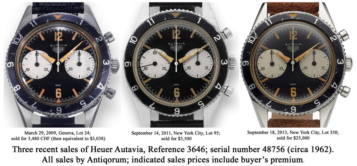 Interesting to recap the three recent sales of this Autavia, Reference 3646, all through Antiquorum. Here are the three photos that were used in the auction catalogs, along with the prices achieved in the auctions.