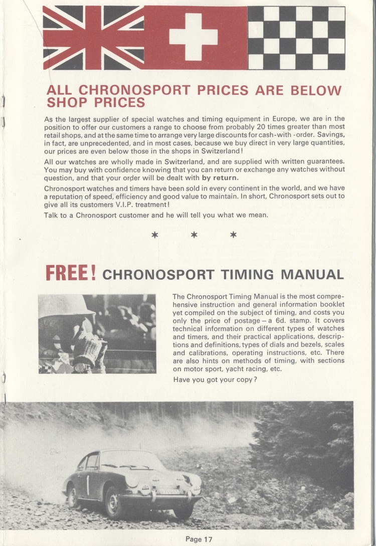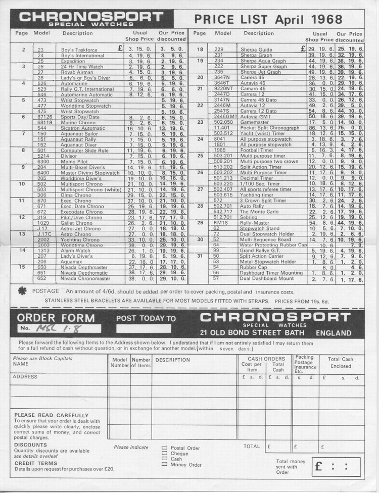 Click on the image to go to scans of a 1968 catalog from leading motorsports watch supplier, Chronosport. Chronosport sold a line of specialty watches that included Heuer, as well as several less expensive brands.