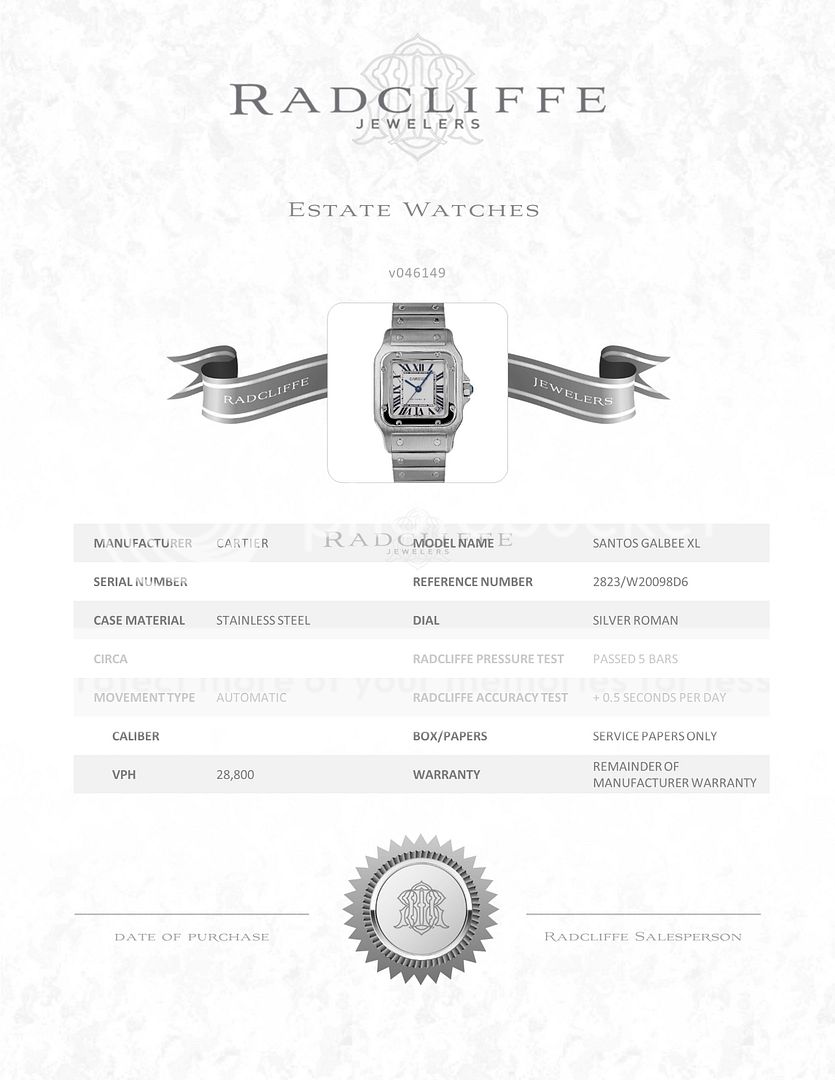 For sale is a pre-owned excellent condition 33mm stainless steel Cartier Santos Galbee XL. Fresh from factory service in April of 2022, the sale of this W20098D6 includes the watch and service papers. While at Cartier, the Galbee received a complete service, new dial, new hands, new date disk, and was polished. No original box or papers are included with this timepiece. The Santos features a silver dial with Roman numeral hour makers, blued steel hands, and date aperture between three and four o’clock. The previously polished case and bezel remain in excellent condition sans a few light scratches. The stainless steel bracelet remains in 90 percent or better condition with no noticeable stretch. In its current configuration, the Santos will accommodate a wrist size up to 7.25 inches. The Santos is powered by a Swiss-made automatic self-winding movement.