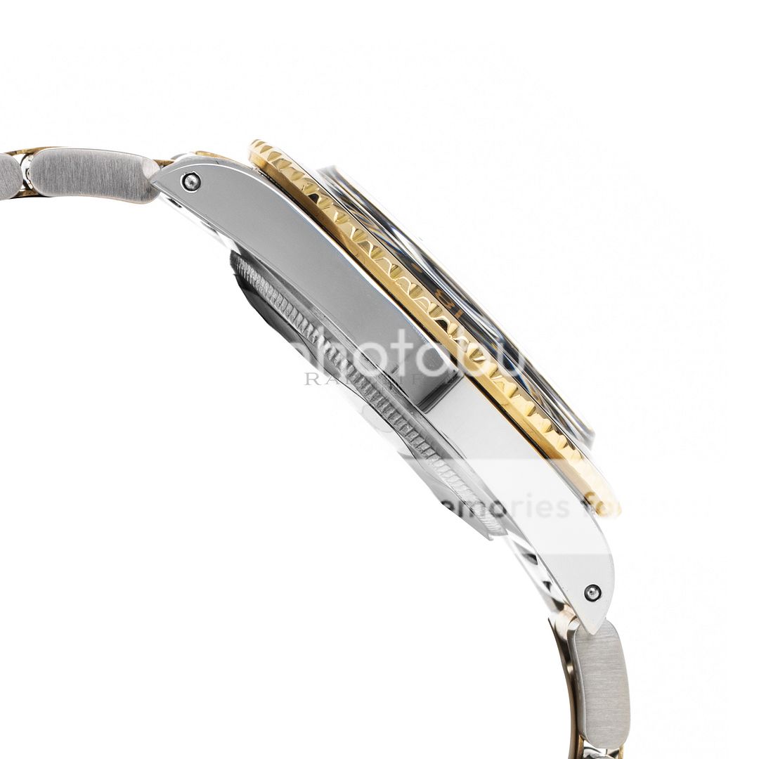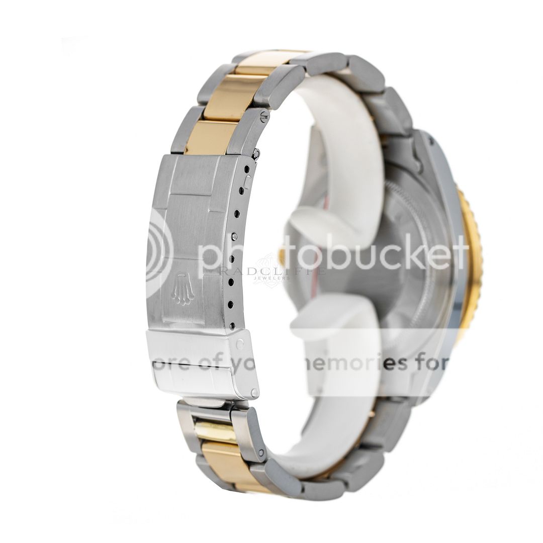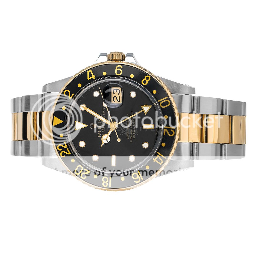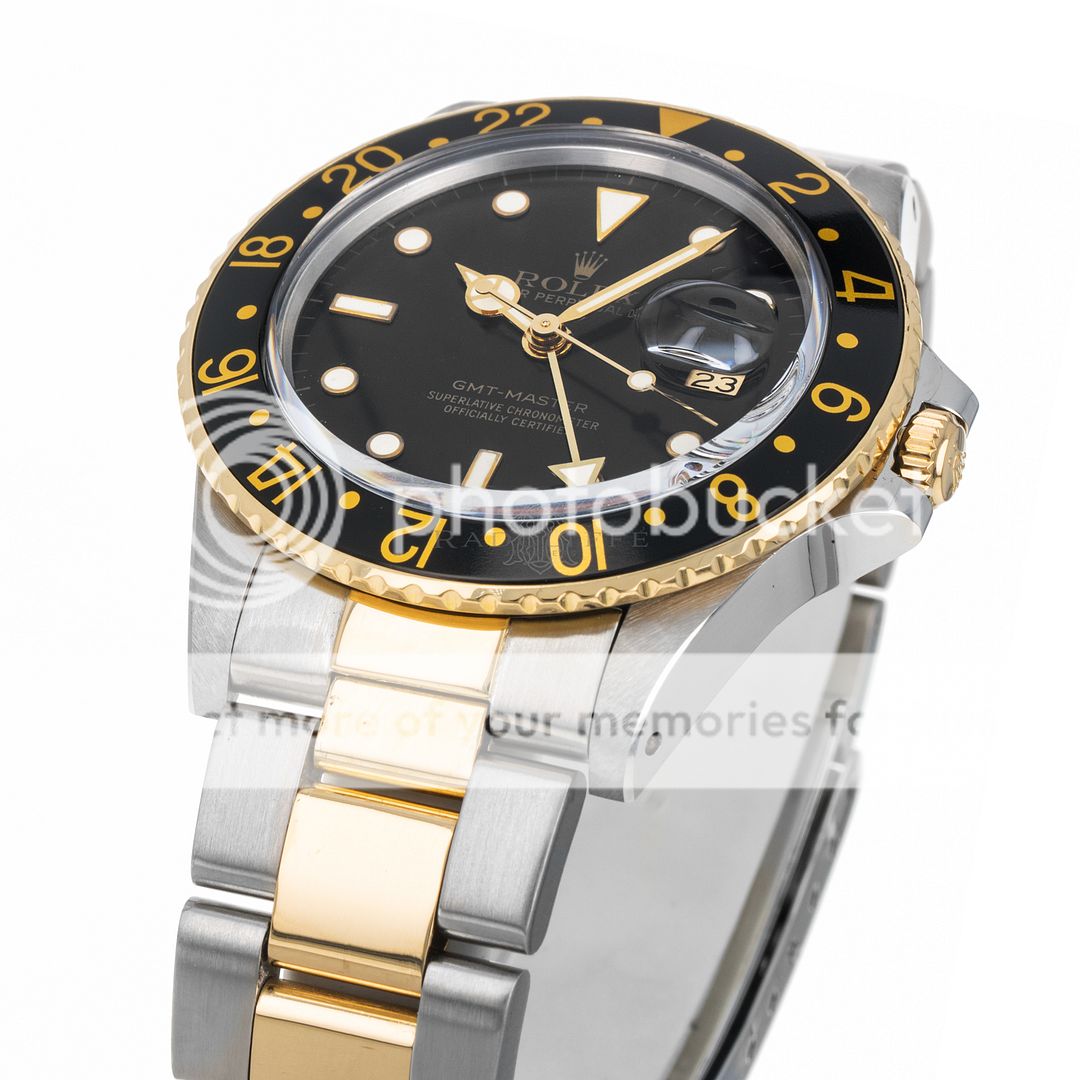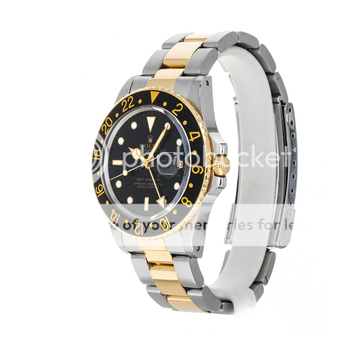 For sale is a pre-owned excellent condition 40mm stainless steel and 18kt yellow gold Rolex GMT-Master. The sale of the 16753 is for the watch and box only. No papers are included in the sale. The GMT-Master has a glossy black tritium dial with a luminescent four hand dial as well as hour markers, and magnified date aperture at 3 o’clock. The tritium in the hands and dial match well and appear to be of the same age. The brushed stainless steel case is affixed with an 18kt yellow gold bidirectional numbered aluminum bezel and is mounted on a matching stainless and 18 karat yellow gold Oyster bracelet. The edges of the gold bezel are rounded from wear. The bracelet is in excellent condition considering its age and has very little signs of stretch, wearing comfortably on a 6.95-inch wrist with one removable link. Several of the gold center link sections show some wear in the edges. Overall the bracelet rates at 80% plus condition. Powering the GMT-Master is a Rolex caliber 3075 automatic self-winding movement.