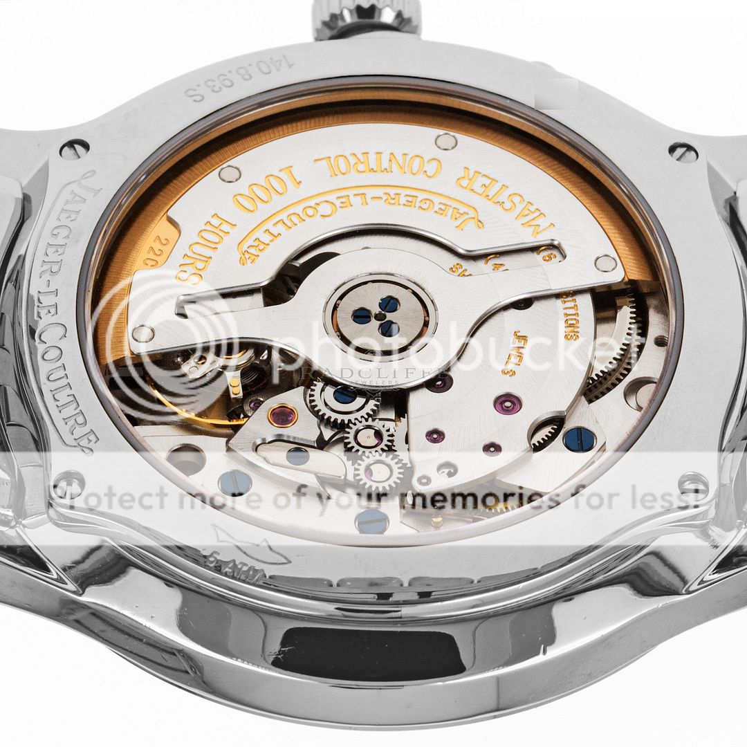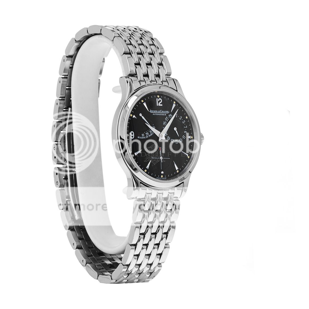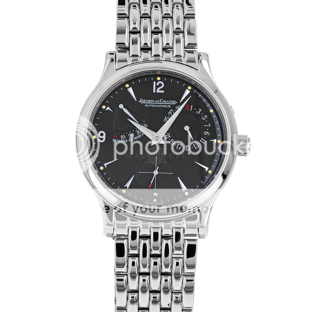 For sale is a pre-owned near mint condition stainless steel 37mm Jaeger-LeCoultre Master Reserve de Marche. The 140.8.93.S is fresh from factory service and includes a copy of the 2023 factory service paperwork, a Jaeger-LeCoultre inner and outer box, dated warranty card from 1999, and instruction manual. While at factory service in April 2023, the watch received a complete service, new crown, new pusher, and was polished. This sleek timepiece features a black dial with steel Arabic and stick hour markers, a date display at two o’clock, small seconds at six o’clock, and a retrograde power reserve indicator at 10 o’clock. The freshly polished case is affixed with a smooth steel bezel which is mounted on a stainless-steel bracelet with a butterfly clasp. The high polished bracelet will accommodate an eight inch wrist and remains in 85% condition. The beads of rice style bracelet has minimal stretch and six removeable links. Powering the timepiece is a Jaeger-LeCoultre caliber 684 automatic movement.