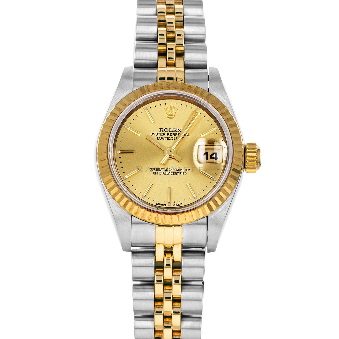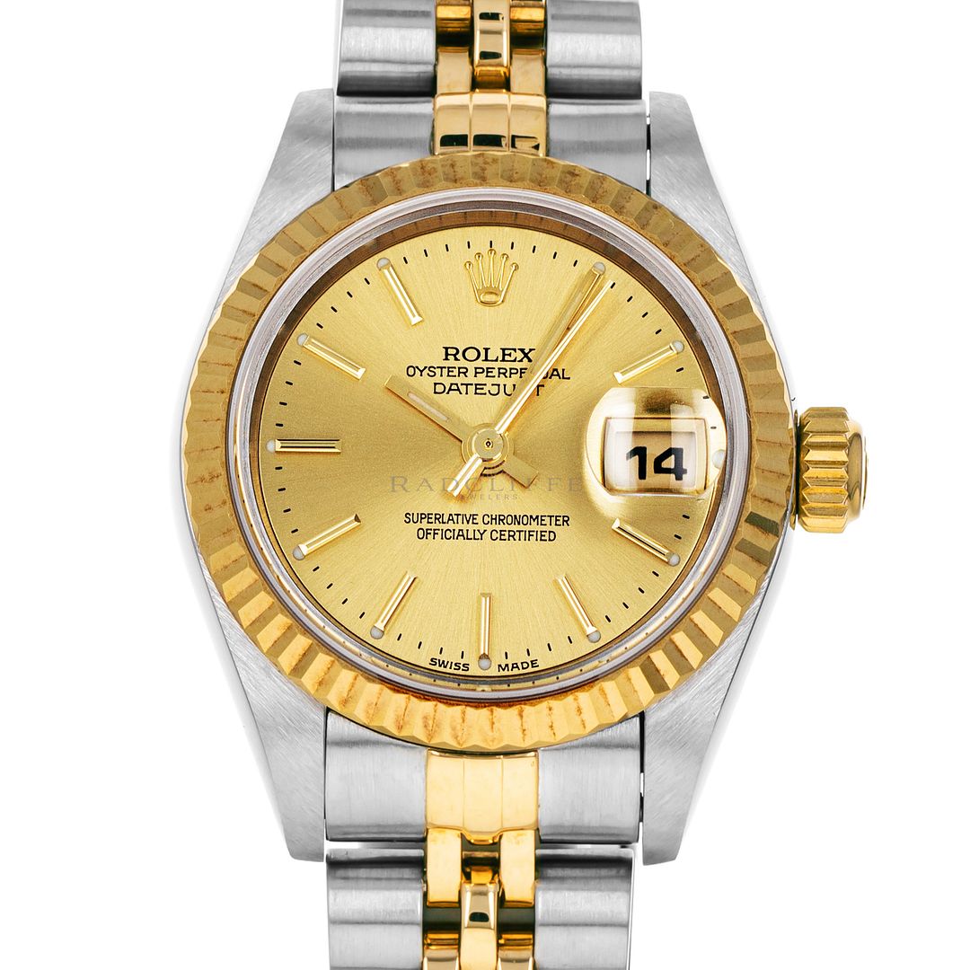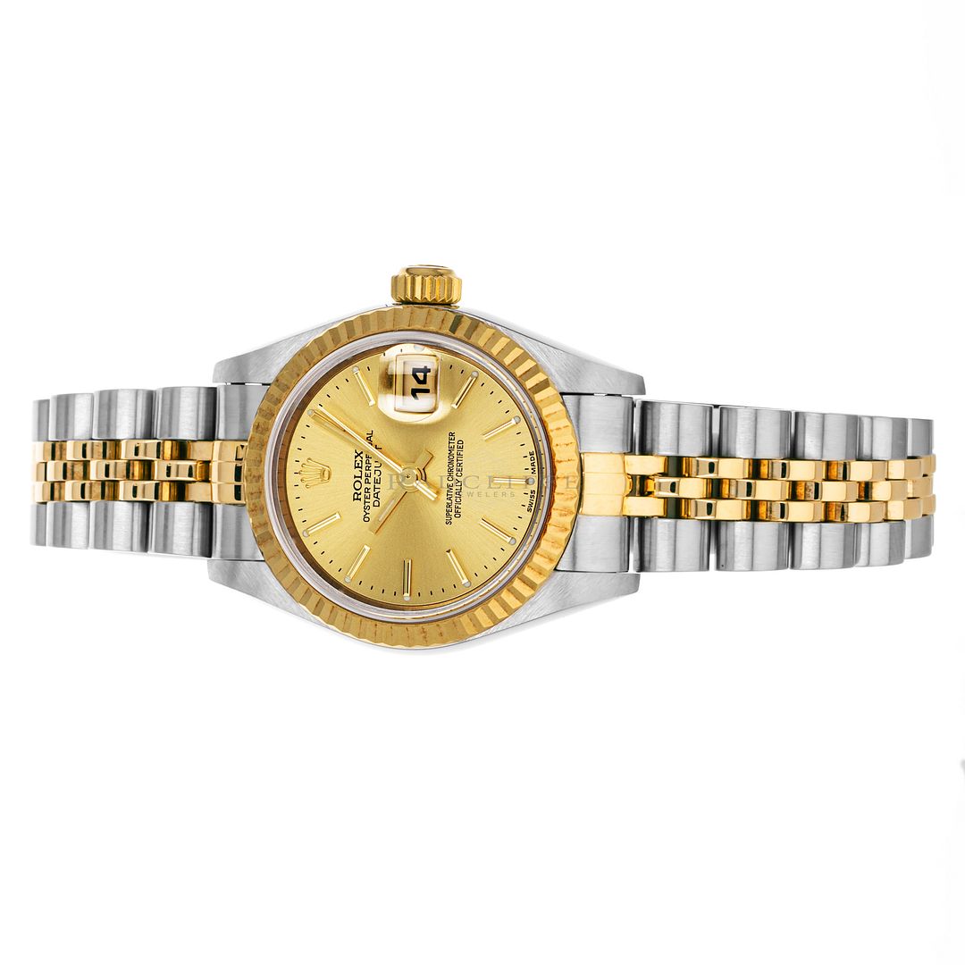 For sale is a pre-owned near mint condition 26mm stainless steel and 18 karat gold Rolex Lady-Datejust. The P serial 79173 comes with a Rolex box only. The Datejust does not come with any papers. The Rolex has a champagne sunburst dial with applied stick indices, applied stick hour makers, central sweeping second hand, and date display at 3. The watch is free of any discernible scratches and signs of wear. The Datejust is mounted on a stainless steel and 18 karat yellow gold Jubilee bracelet with minimal stretch. As sized, the watch will accommodate a 6.35-inch wrist with three removable links. The Rolex has an automatic caliber 2235 in-house movement with an approximate power reserve of 48 hours.