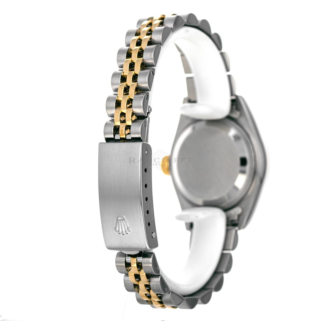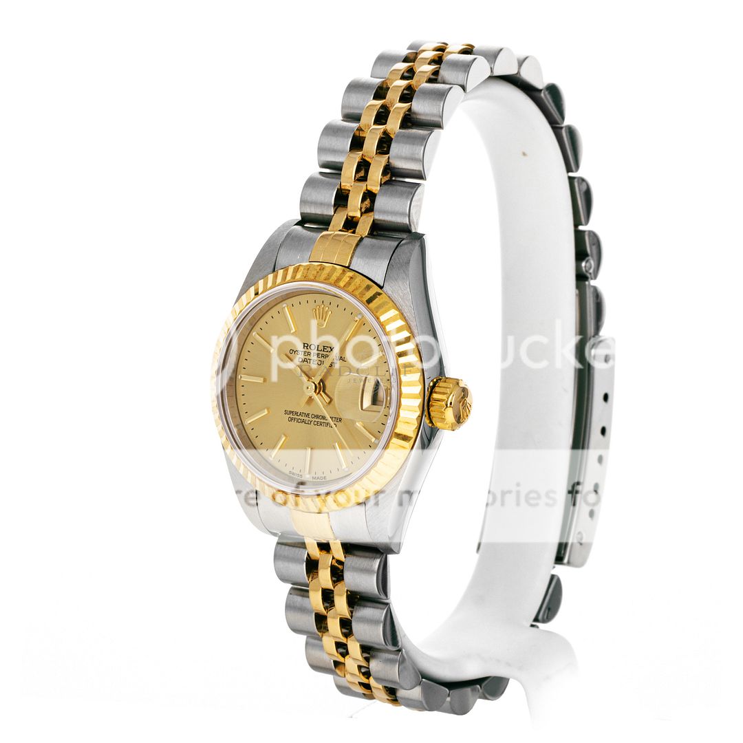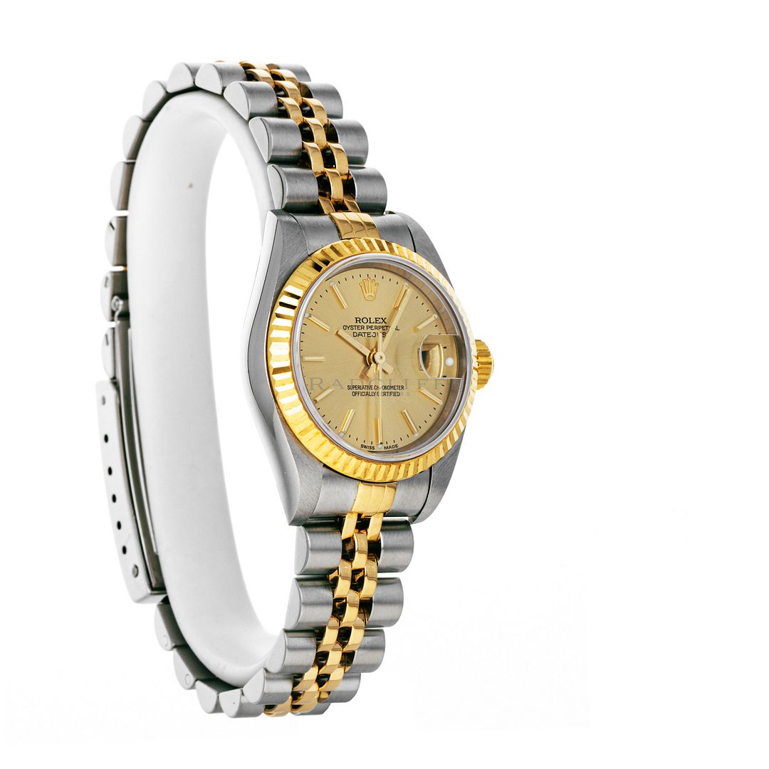 For sale is a pre-owned near mint condition 26mm stainless steel and 18 karat gold Rolex Lady-Datejust. The P serial 79173 comes with a Rolex box only. The Datejust does not come with any papers. The Rolex has a champagne sunburst dial with applied stick indices, applied stick hour makers, central sweeping second hand, and date display at 3. The watch is free of any discernible scratches and signs of wear. The Datejust is mounted on a stainless steel and 18 karat yellow gold Jubilee bracelet with minimal stretch. As sized, the watch will accommodate a 6.35-inch wrist with three removable links. The Rolex has an automatic caliber 2235 in-house movement with an approximate power reserve of 48 hours.