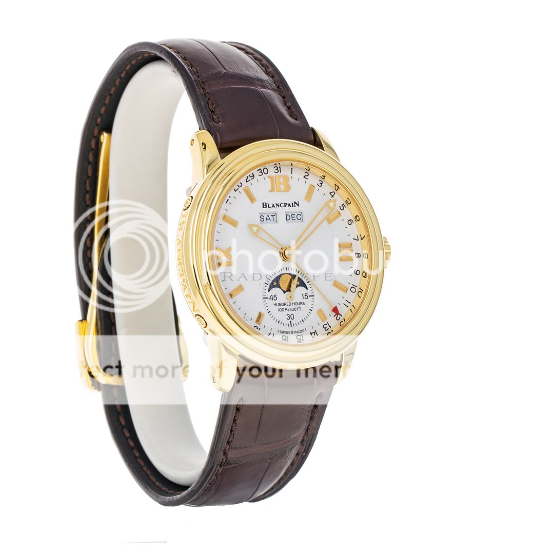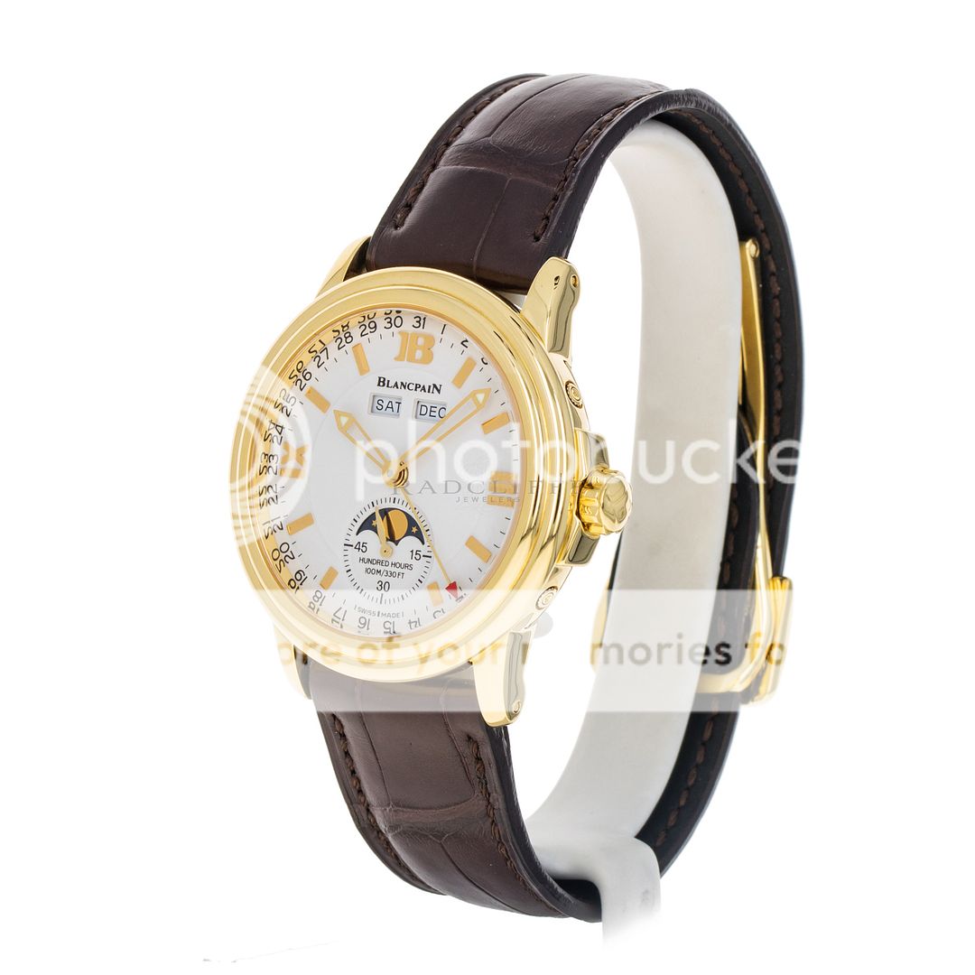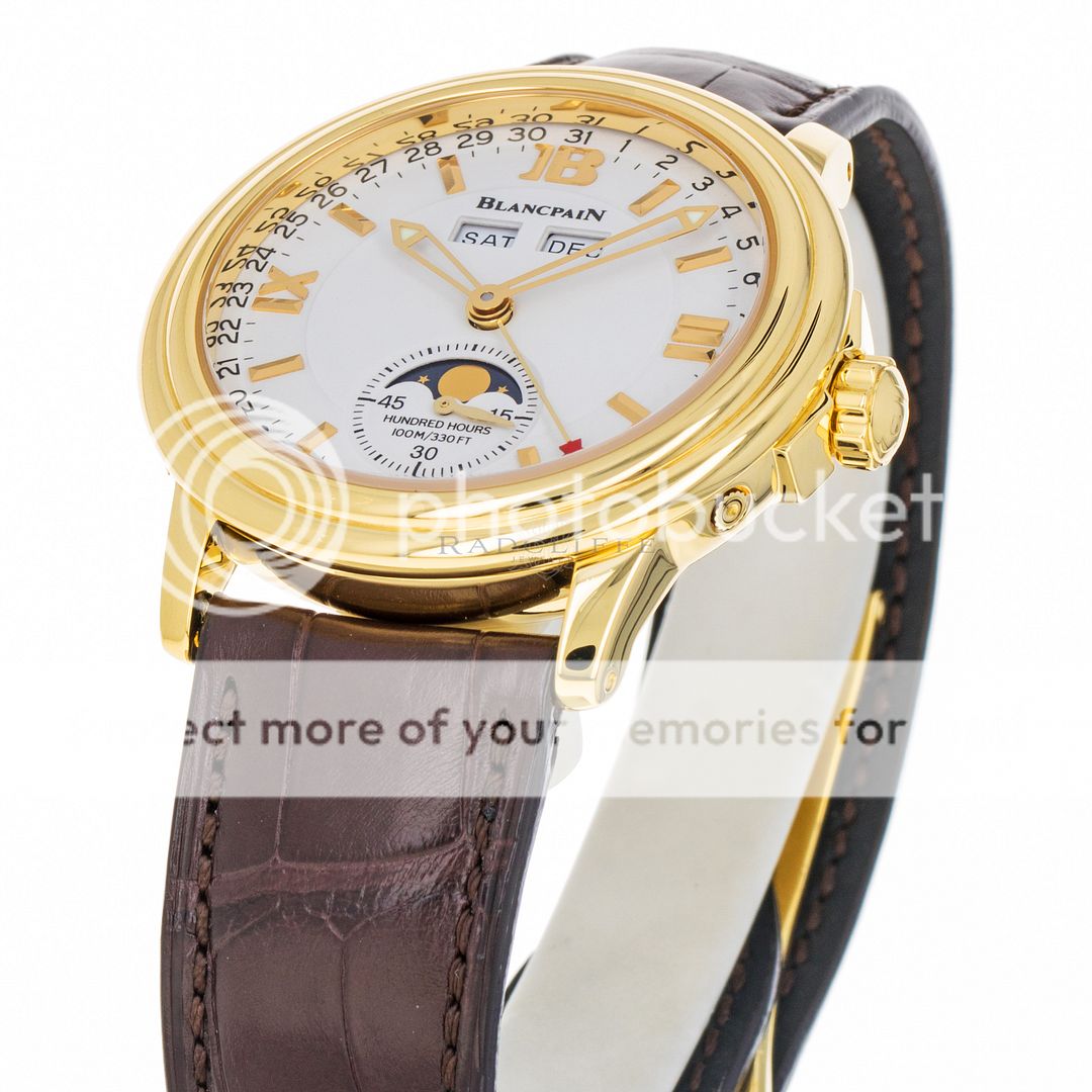For sale is a pre-owned near mint condition 36mm 18kt yellow gold Blancpain Leman Moonphase. The sale of this 2763-1418-53B includes double Blancpain boxes, an operation manual, and the records from the recent factory service. While at Blancpain factory in June of 2023 the Leman received a complete maintenance service, a new crystal, new hands, a new strap, and was refinished. Crafted with meticulous attention to detail, this stunning watch showcases Blancpain's unwavering commitment to excellence. The Leman’s white dial features a thirty second sub dial with a moon phase cycle, applied 18kt yellow gold indices, a day and month indicator below the twelve o’clock position, and 18kt yellow gold skeleton hands. The polished 18kt yellow gold case is in near mint condition with no notable imperfections. The case is affixed with a fixed 18kt yellow gold bezel and is mounted on a new standard length chocolate brown alligator strap with an 18kt yellow gold deployant clasp. Powering the Leman is an automatic self-winding caliber 1153 with approximately 100 hours of power reserve.