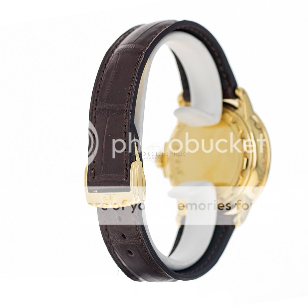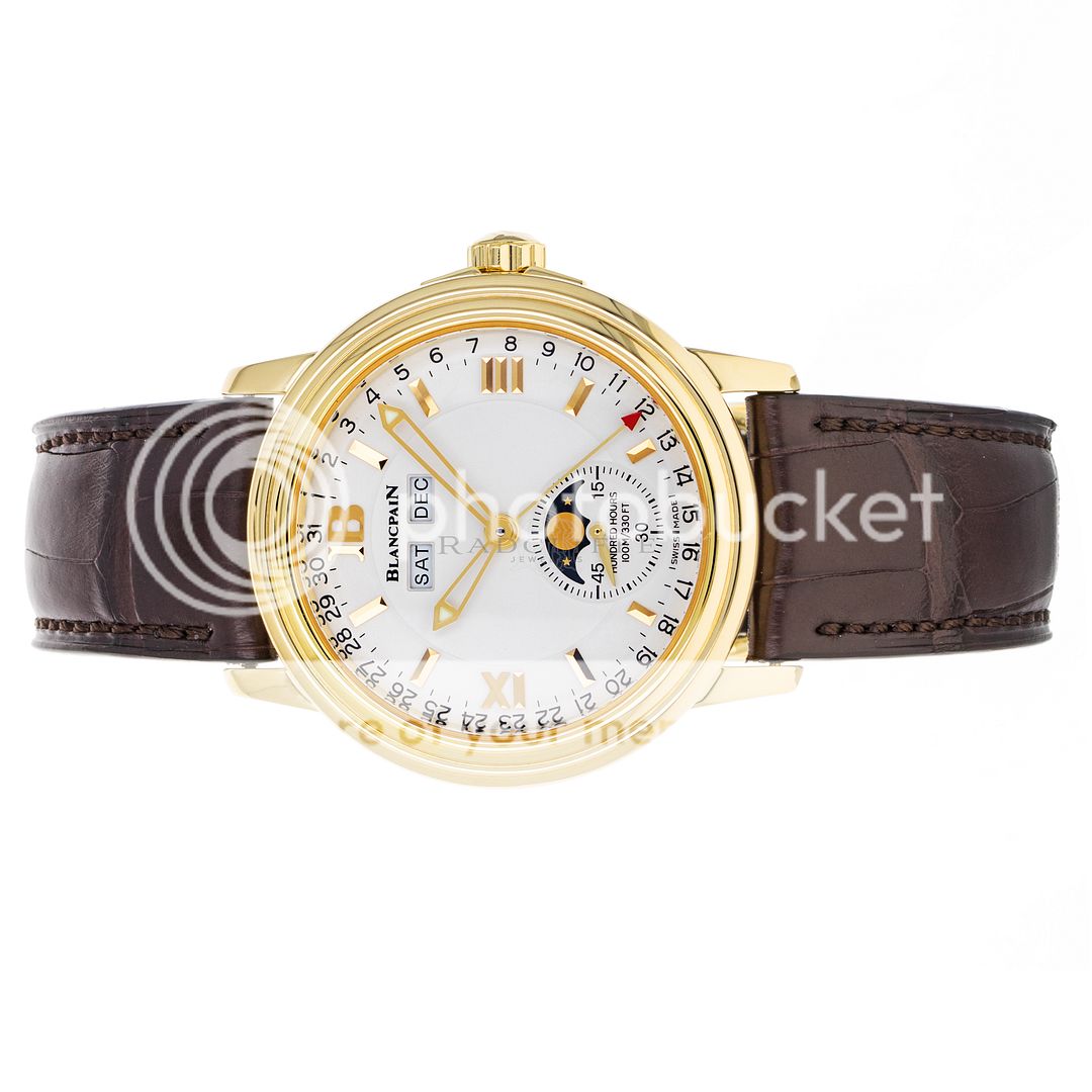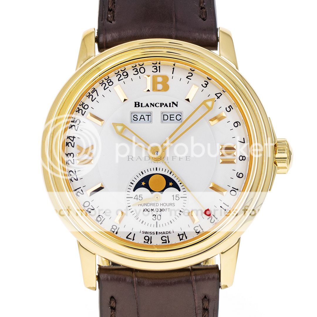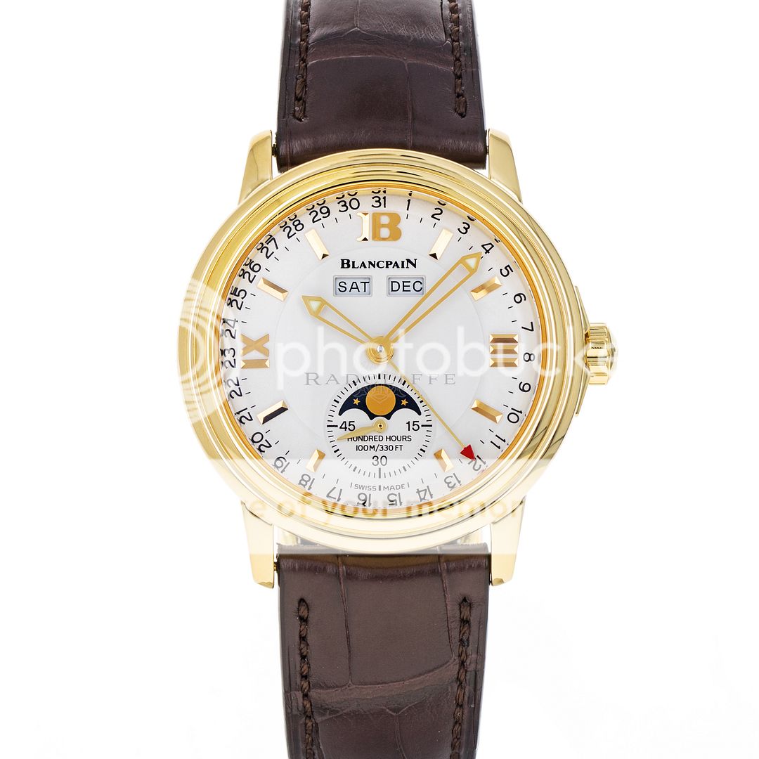 For sale is a pre-owned near mint condition 36mm 18kt yellow gold Blancpain Leman Moonphase. The sale of this 2763-1418-53B includes double Blancpain boxes, an operation manual, and the records from the recent factory service. While at Blancpain factory in June of 2023 the Leman received a complete maintenance service, a new crystal, new hands, a new strap, and was refinished. Crafted with meticulous attention to detail, this stunning watch showcases Blancpain's unwavering commitment to excellence. The Leman’s white dial features a thirty second sub dial with a moon phase cycle, applied 18kt yellow gold indices, a day and month indicator below the twelve o’clock position, and 18kt yellow gold skeleton hands. The polished 18kt yellow gold case is in near mint condition with no notable imperfections. The case is affixed with a fixed 18kt yellow gold bezel and is mounted on a new standard length chocolate brown alligator strap with an 18kt yellow gold deployant clasp. Powering the Leman is an automatic self-winding caliber 1153 with approximately 100 hours of power reserve.