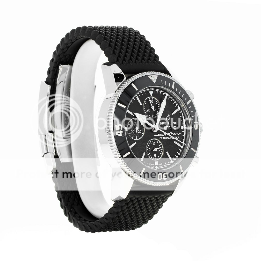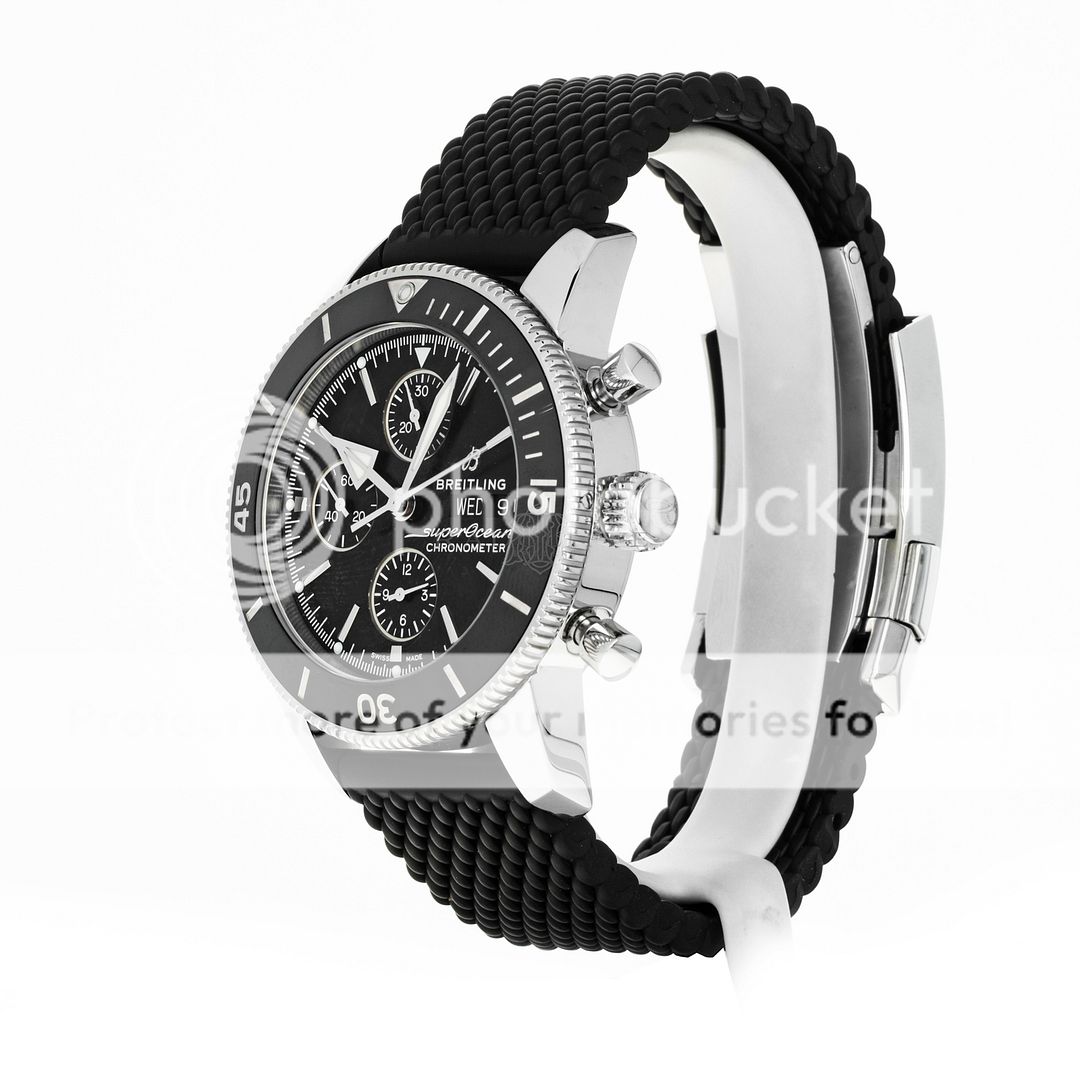 For sale is a pre-owned near mint condition 44mm stainless steel Breitling Superocean Heritage II. This sale for the A13313 is accompanied by a Breitling box and travel case. The Heritage’s three-register black dial features applied stainless steel indices, luminescent sword hands, and a day/date aperture at the three o’clock position. The polished stainless steel case is in near mint condition with no notable imperfections. The Heritage is affixed with a coin edge unidirectional 60-minute graduated bezel and is mounted on a standard length black rubber mesh bracelet with a stainless steel push button deployant clasp. Powering the Heritage is an automatic caliber Breitling 13 movement with approximately 42 hours of power reserve.