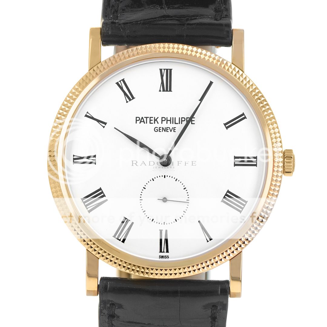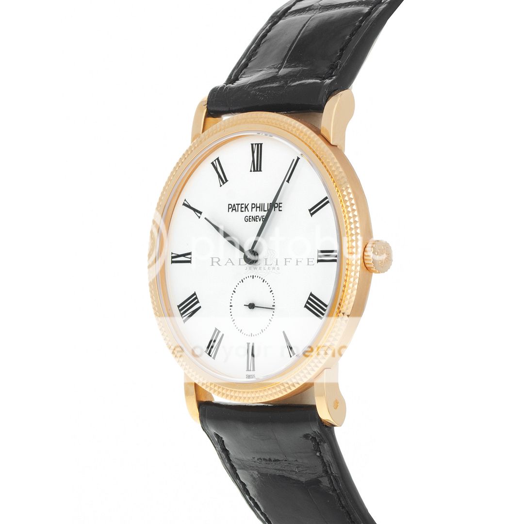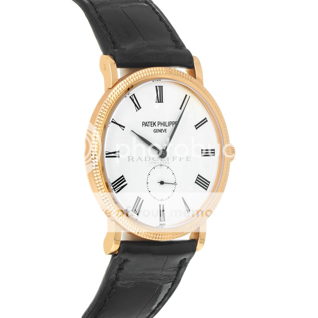 For sale is a pre-owned near mint condition 36mm 18 karat rose gold Patek Philippe Calatrava. The sale of the 5119R0-001 is for the watch with a box and manuals. The original certificate of origin is not included. The Calatrava features a white lacquered dial with black Roman numeral hour indicators and a small second’s display at six. The quintessential Calatrava embodies Patek Philippe’s rich heritage with its classic elegance and hobnail bezel. The 18 karat rose gold case is free of any notable signs of wear and is mounted on an OEM black alligator strap with a tang buckle. The strap is in 90% or better condition with no notable signs of wear. Powering the Calatrava is the manually wound caliber 215 PS with a 44 hour power reserve which is on display through the open case back.