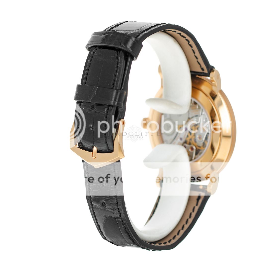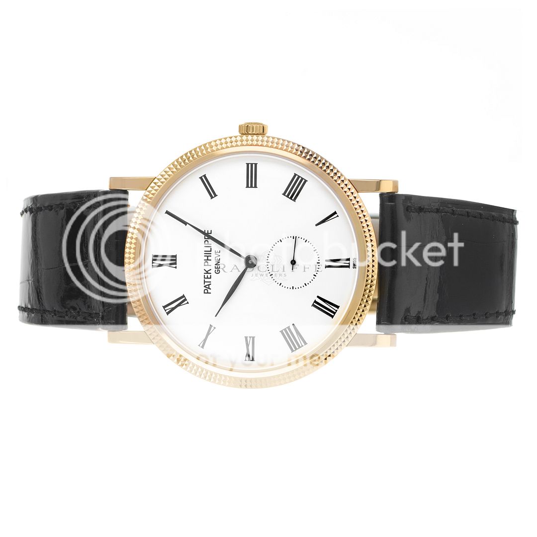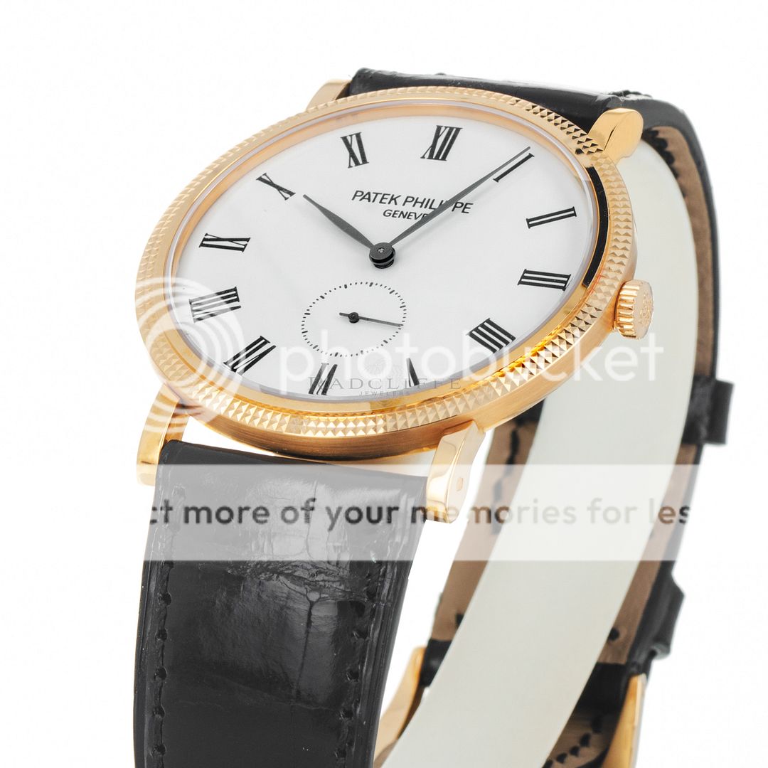 For sale is a pre-owned near mint condition 36mm 18 karat rose gold Patek Philippe Calatrava. The sale of the 5119R0-001 is for the watch with a box and manuals. The original certificate of origin is not included. The Calatrava features a white lacquered dial with black Roman numeral hour indicators and a small second’s display at six. The quintessential Calatrava embodies Patek Philippe’s rich heritage with its classic elegance and hobnail bezel. The 18 karat rose gold case is free of any notable signs of wear and is mounted on an OEM black alligator strap with a tang buckle. The strap is in 90% or better condition with no notable signs of wear. Powering the Calatrava is the manually wound caliber 215 PS with a 44 hour power reserve which is on display through the open case back.