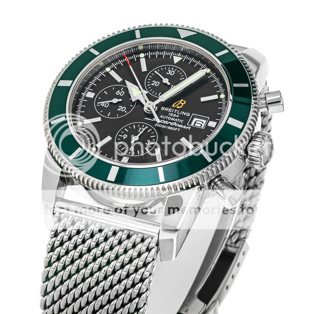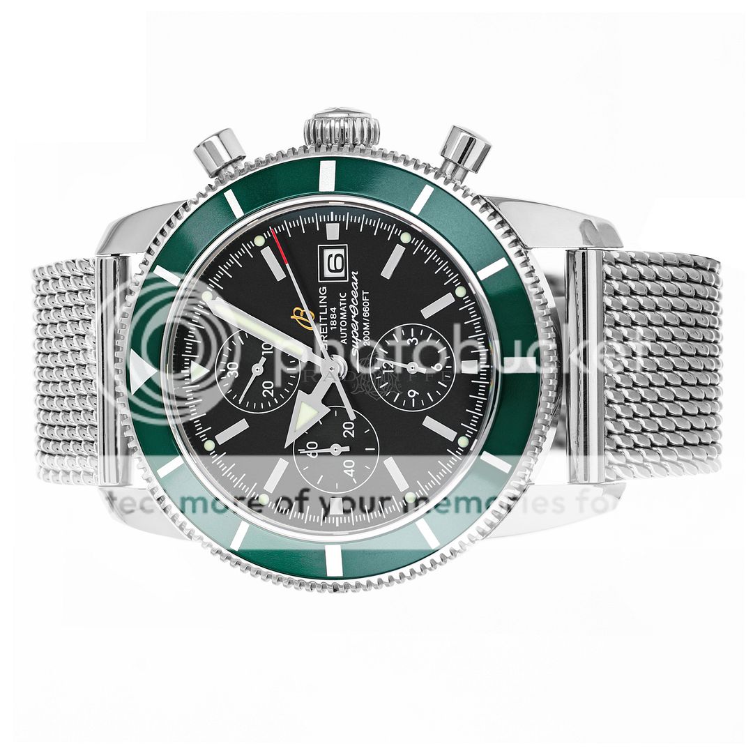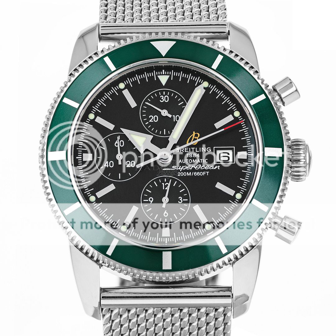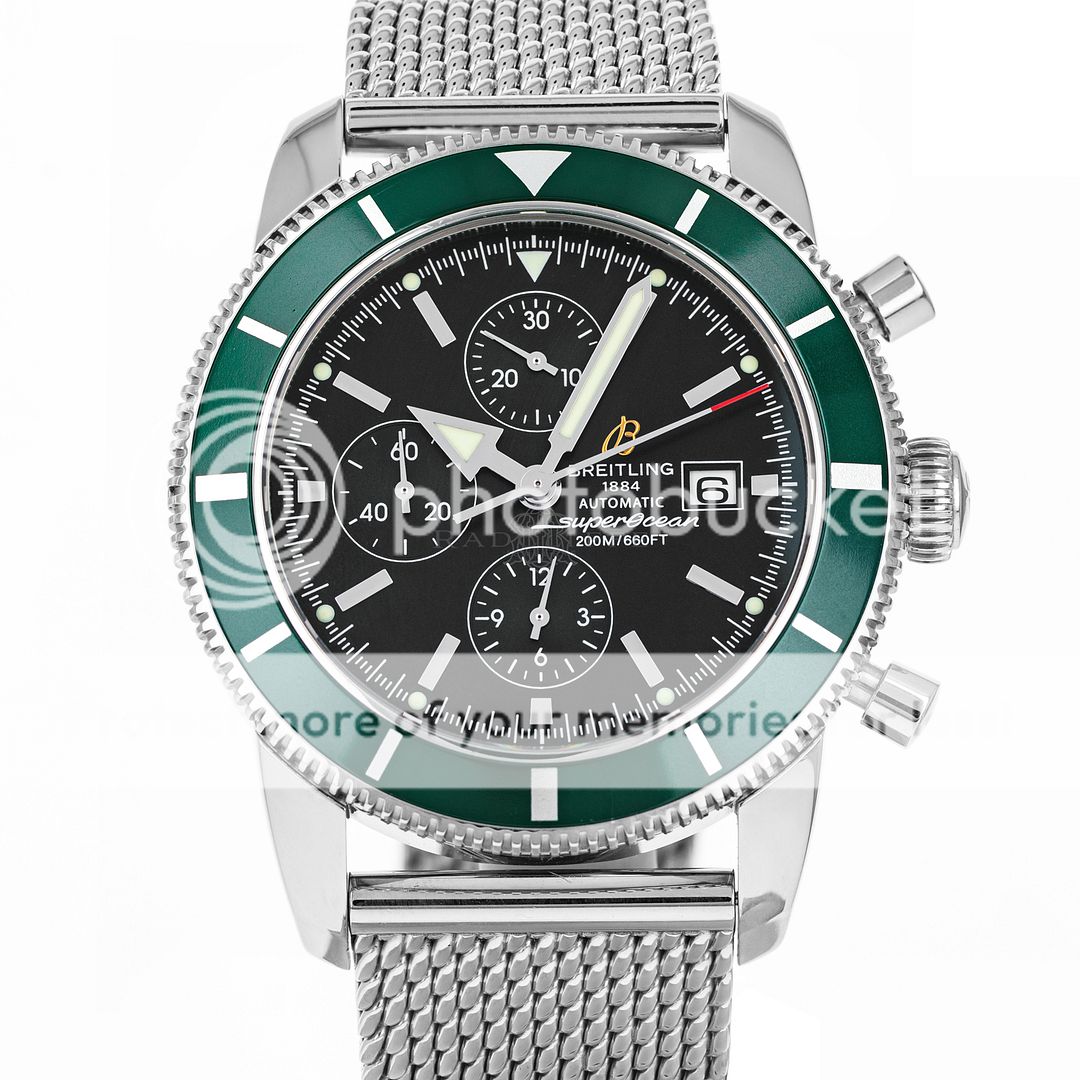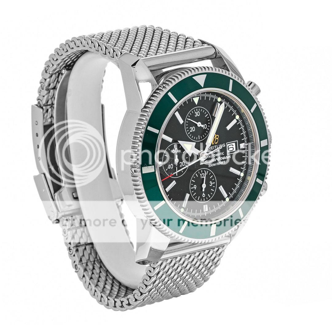 For sale is pre-owned excellent condition 46mm stainless steel Breitling Superocean Heritage. The sale of this reference A13320Q4/B908 includes inner and outer Breitling boxes, a hang tag, extra links, a chronometer certificate, a limited edition certificate, a manual, and a warranty booklet dated 2012. The Superocean is a part of a 1000 piece limited edition run with a British Racing green bezel insert. This watch features a chronograph complication. The matte black dial has a date aperture at three, applied luminescent stick hour markers, and luminescent hands. The case is affixed with a unidirectional stainless steel bezel with a green aluminum insert. The bezel insert shows some light signs of wear. The high-polish stainless steel case is mounted on a stainless steel Ocean Classic bracelet with a deployant clasp. In its current configuration it wears comfortably on a seven inch wrist and has four removable links. This Superocean is powered by a Breitling caliber 13 automatic self-winding movement with approximately 42 hours of power reserve.