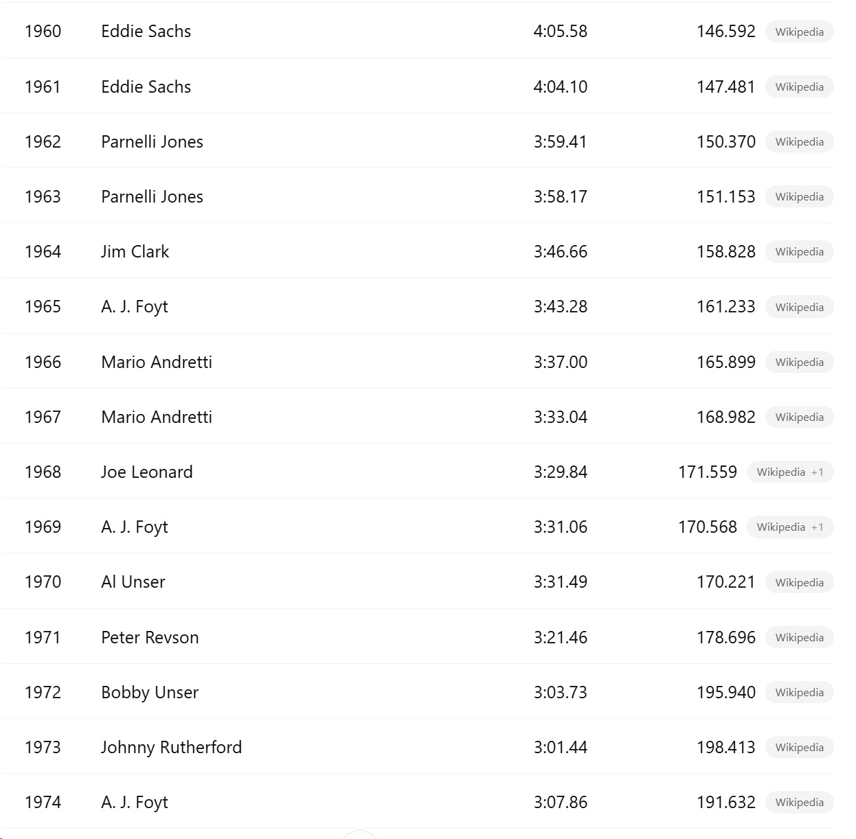 Also, looking at Indianapolis qualifying times for the period 1960 to 1974, we see that this timer would have been useful in 1970, but would out outlived its usefulness by 1971.
